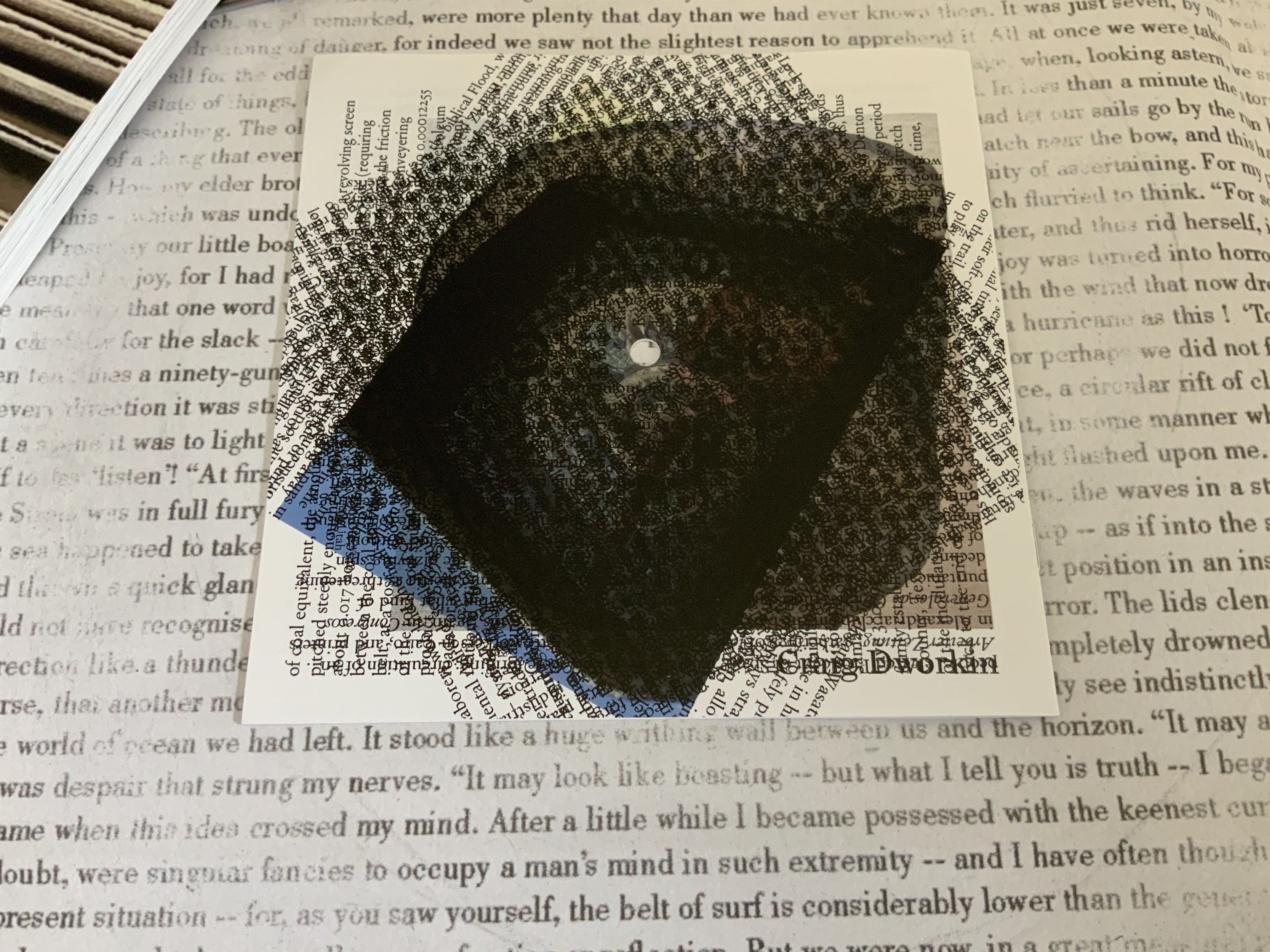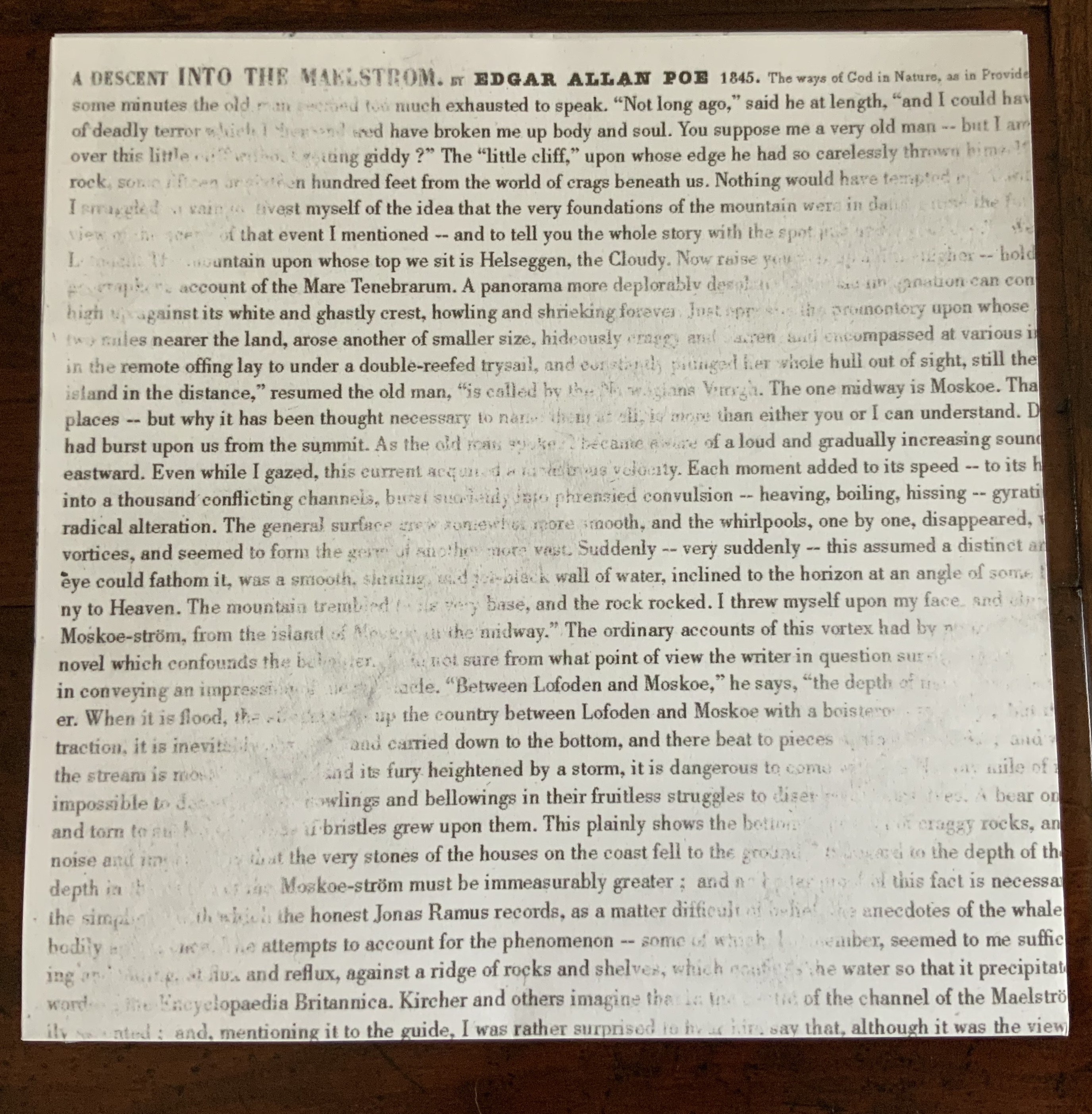 Jérémie Bennequin’s double-sided, bilingual print of his erasure of Poe’s “A Descent into the Maelstrom” recalls the palimpsest — a longstanding topic of material text study. Also, by standing in for Poe’s swirling maelstrom, the print’s image of spiralling erasure raises the domain’s recurrent theme of text-and-image interaction as well as that of the self-reflexiveness of such art. Using the book or text as physical material with which to create a work is central to book art as is the self-referencing that arises.