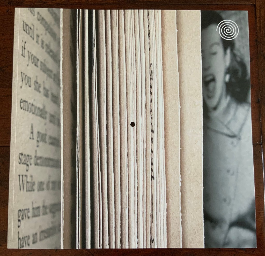 The print’s spiral erasure on a background of text serves as one of several voices in this journal issue’s intermedial†† harmony (or cacophony). The spiral reappears in Craig Dworkin’s meditation that scales up a pocket watch’s clock spring to the size of Robert Smithson’s Spiral Jetty (1980). Dworkin finds the spiral in the fossil of a Holocene fish that swam over the bed that became the jetty. He “materializes” the watch’s minutes against the geological and evolutionary time frames of the formation of the Great Salt Lake and the fossil. On the back cover of the chapbook, its entire text is repeated in a spiral of text blocks. The chapbook slips back into its 45 RPM-size sleeve to echo the spiralling inscription of sound in vinyl grooves that actually occurs on the LP recording of Sean Ashton’s novel Living in a Land.