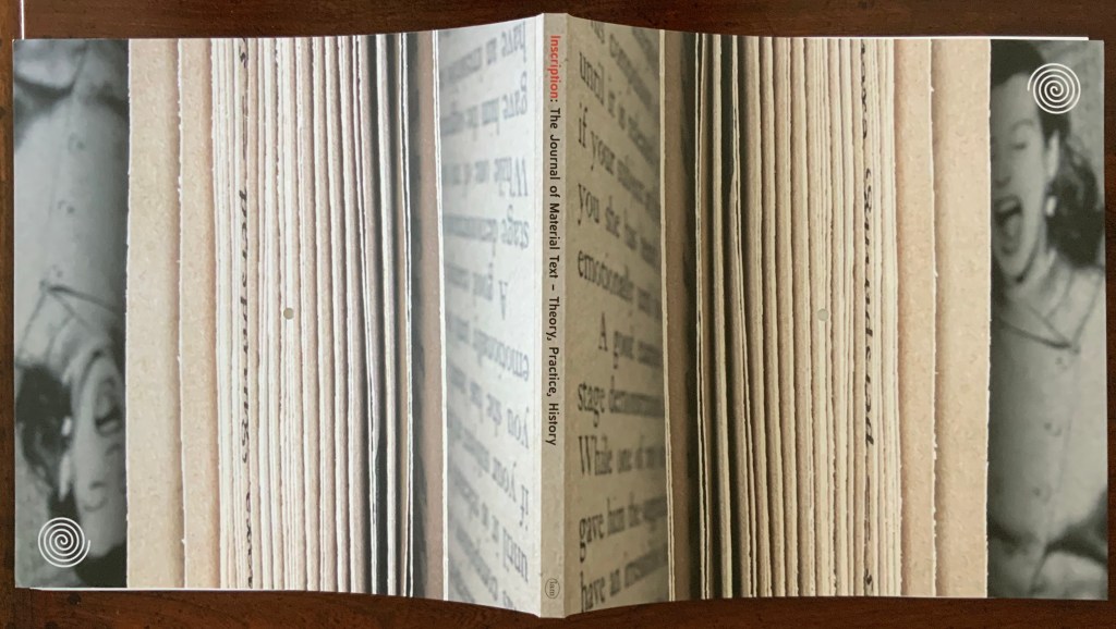 The materiality of this inaugural issue demonstrates how Inscription‘s focus “is not just on the meanings and uses of the codex book, but also the nature of writing surfaces (papery or otherwise), and the processes of mark-making in the widest possible sense”, as the editors put it. The care and creativity with which this first issue has been put together offer raw material with which to “take the study of material texts in new directions”. Mark-making by erasure, printing, juxtaposing, drilling, vinyl inscription, land erosion, evolution, land art, stage costumes, choice of type, page layout, binding, sleeving — all this even before we come to the articles themselves (see the photos of the Table of Contents above)!