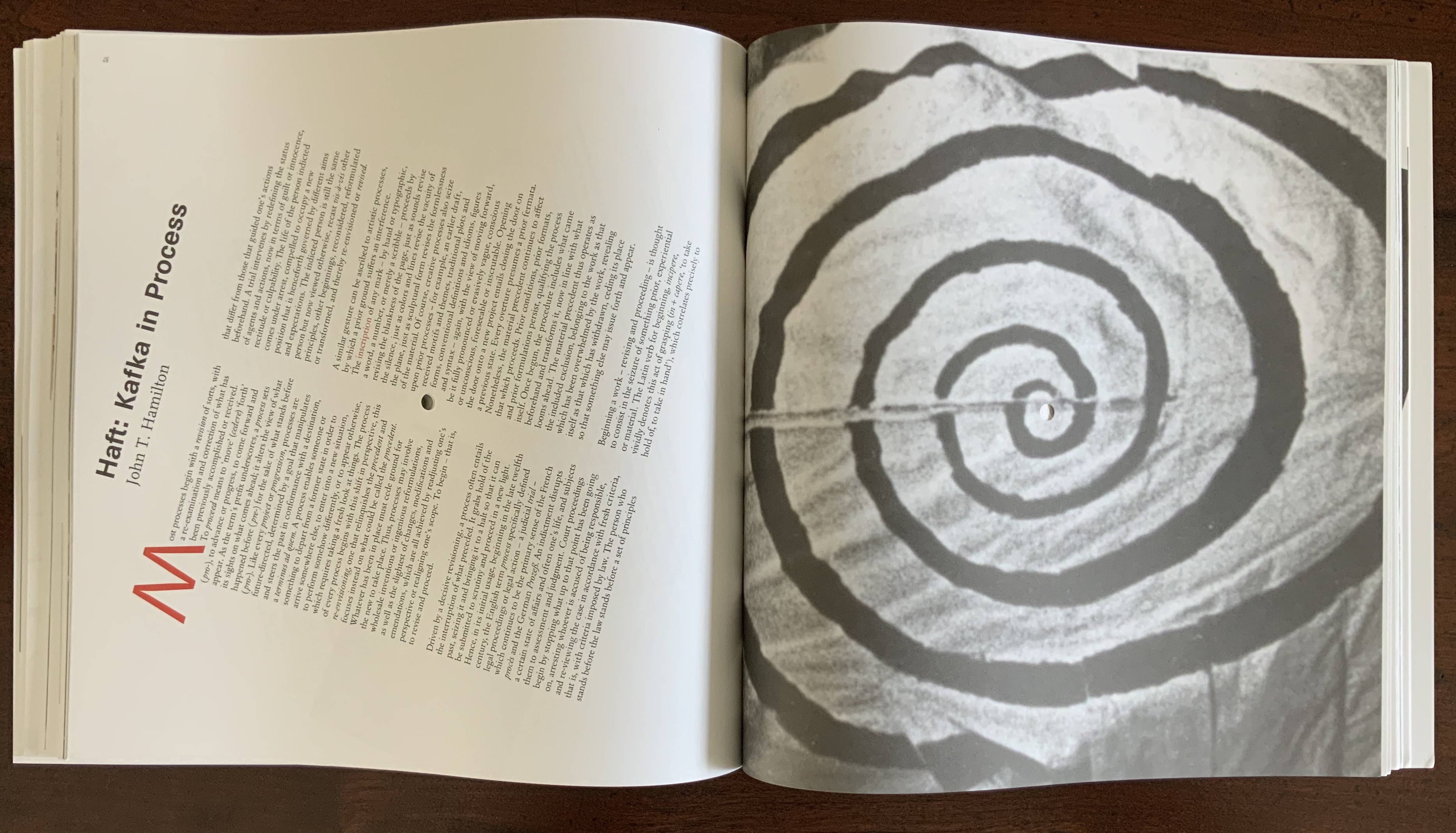Inscription is bound dos-à-dos, but with only one fore-edge and one spine. Materially emphasizing the theme of inward spiralling, Inscription‘s two halves are upside down to one another. Their vertical orientations differ as can be seen in the following photo of the two front covers splayed away from the spine. The cover designer has obviously joined the fun by creating two fore-edges with the trompe l’oeil and “two” spines, one downward reading in the English style and, when flipped, one upward reading in the European style. Of course, therefore, there are two Tables of Content in opposite orders and two editorial prefaces, of which “one is considerably better: this is deliberate”. (Tongue-in-cheek humor seems to reside in the DNA of material text studies — and especially in book art.)