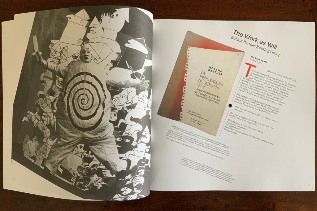 After Bennequin’s print, Dworkin’s meditation and Ashton’s LP, the journal itself appears, sporting the spiral as a logo on its trompe l’oeil cover. Not only drawn from Smithson’s Spiral Jetty, the logo draws from the stage costumes of Alfred Jarry’s Ubu Roi, which recur throughout the journal’s pages reminding us of drama as another medium in which the materiality of the text matters. In its own physical manifestation, the journal wears the materiality of the text on its sleeve and in its pages. The pages themselves spiral around a hole drilled through the center of the issue, echoing the sculptural extremity of inscribing, the book art technique of excising and the concept of nothingness central to many artists of inscription such as Robert Barry and Carl Andre, as this exchange shows: