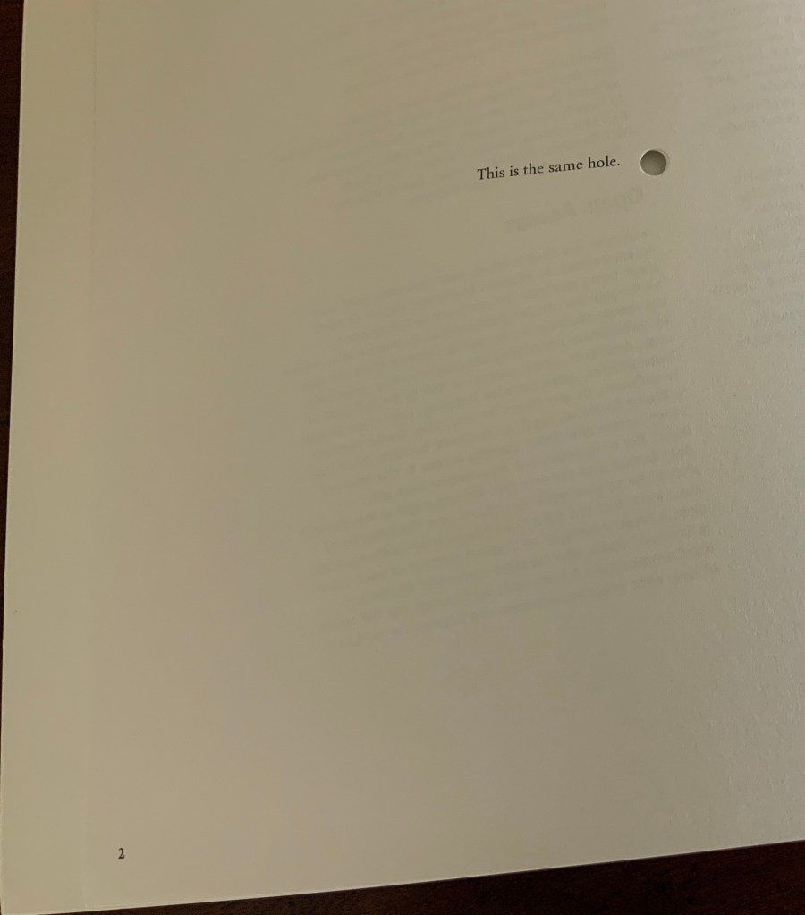 On its two page 2’s (a result of the dos-à-dos or back to back binding), Incription offers its own Magrittean take on holes: