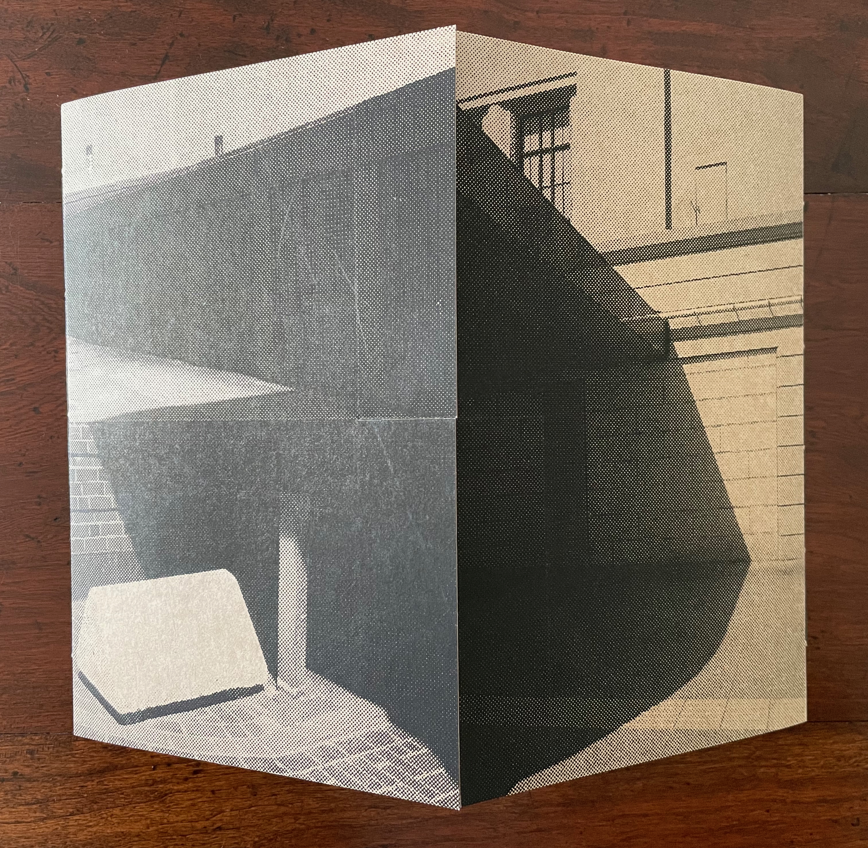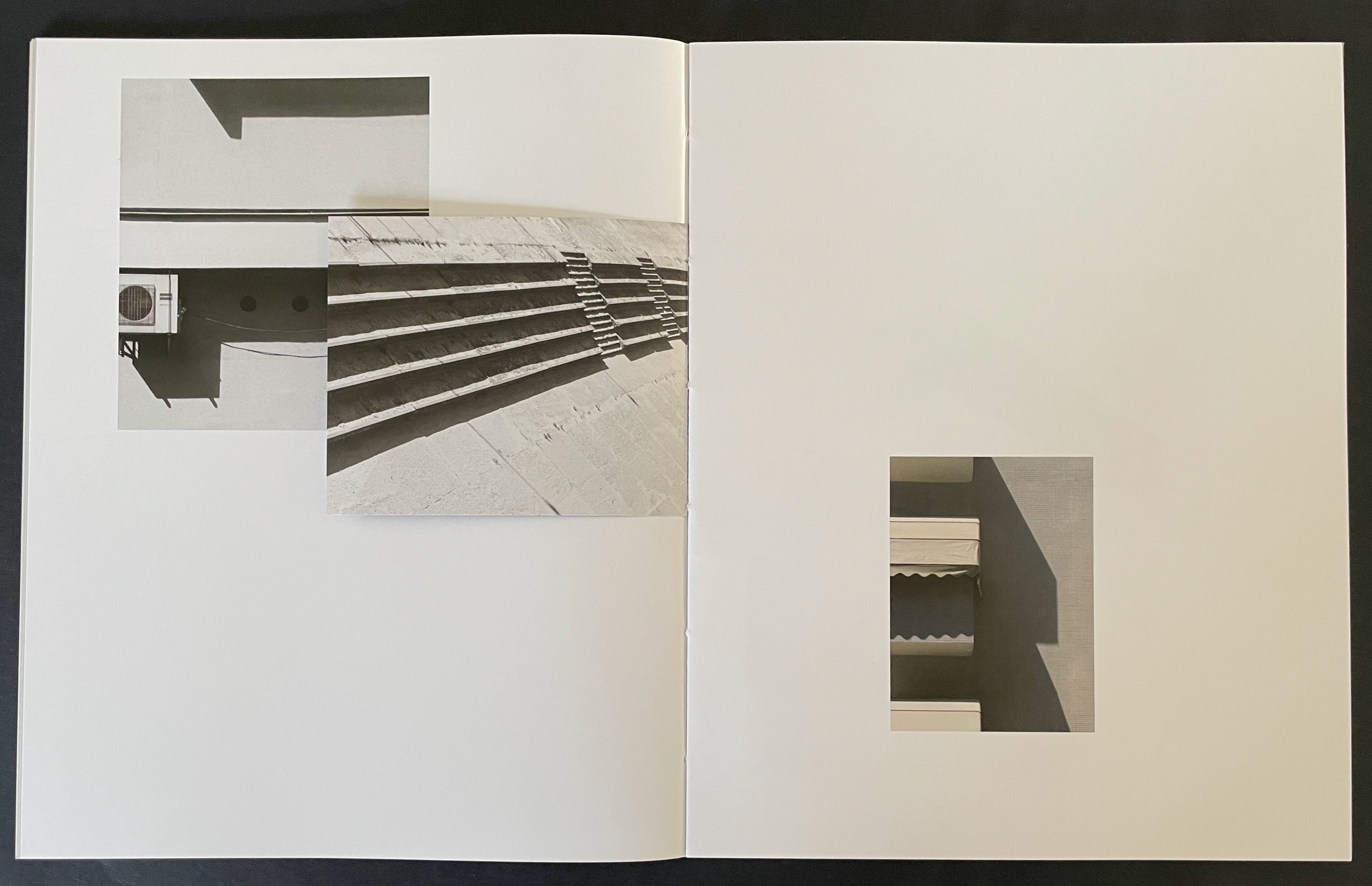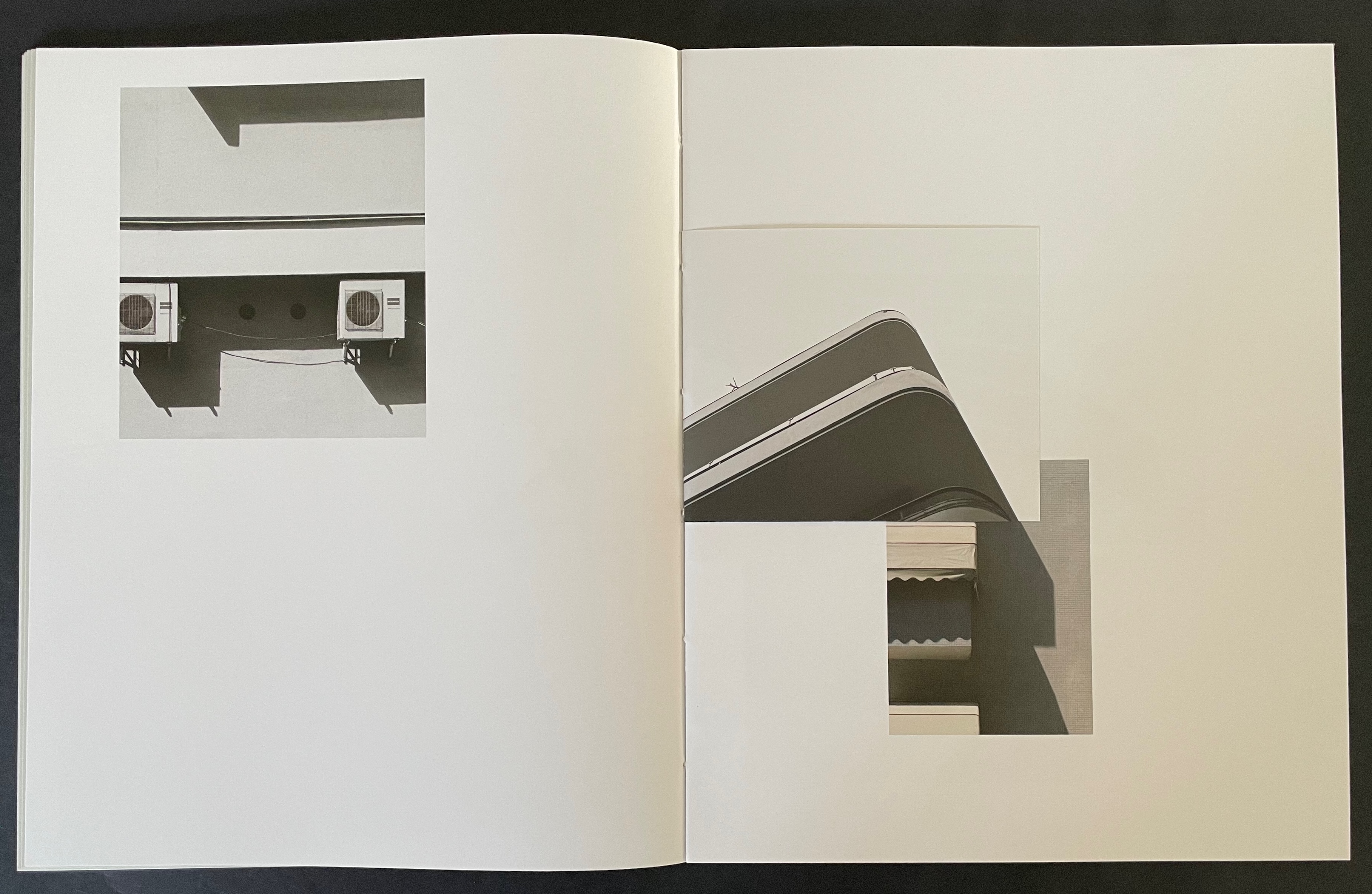 Above, in the spread on the left, the triangular image that falls on the recto page is actually a small folio to itself. The triangle’s right-hand edge aligns with the shadow of the image below it. This becomes apparent when the small folio is turned to the left, and now its verso image of shadows aligns with the shadow between the air-conditioning units (the small turned folio now hides nearer of the units).