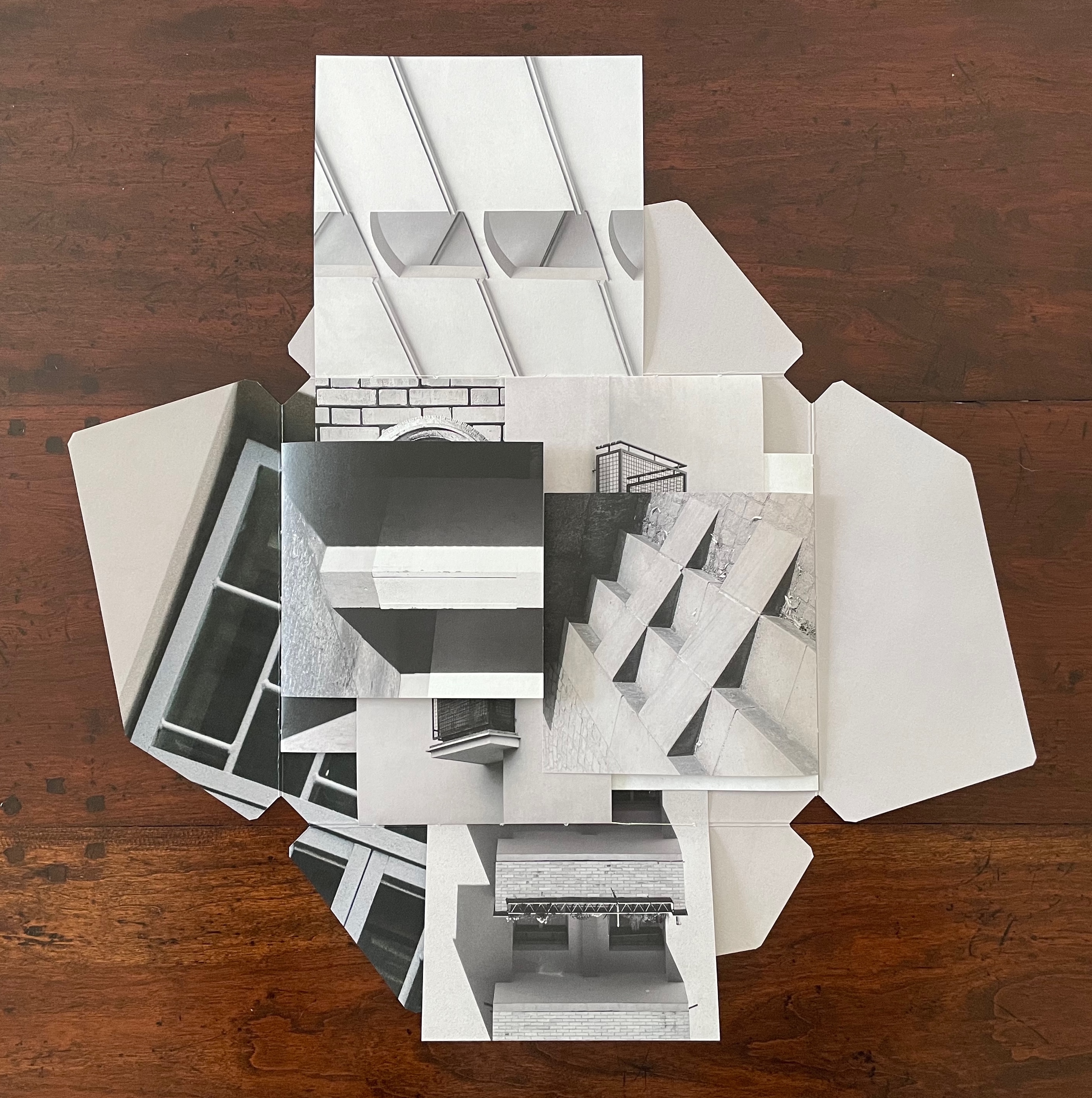 Below, the linear registration across the overlapping leaves of the two booklets suggest lined music sheets with the collage in the center playing the role of an oversized treble clef and musical note and enacting the title’s assertion that architecture is frozen music. Structure and image meet metaphor.