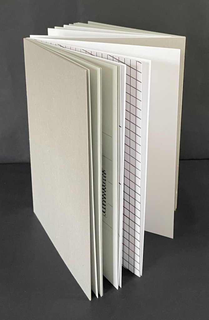 Split (2025) is another stab at the “open form” book. As a pamphlet-sewn star book without a front or back cover, it has no beginning or end.