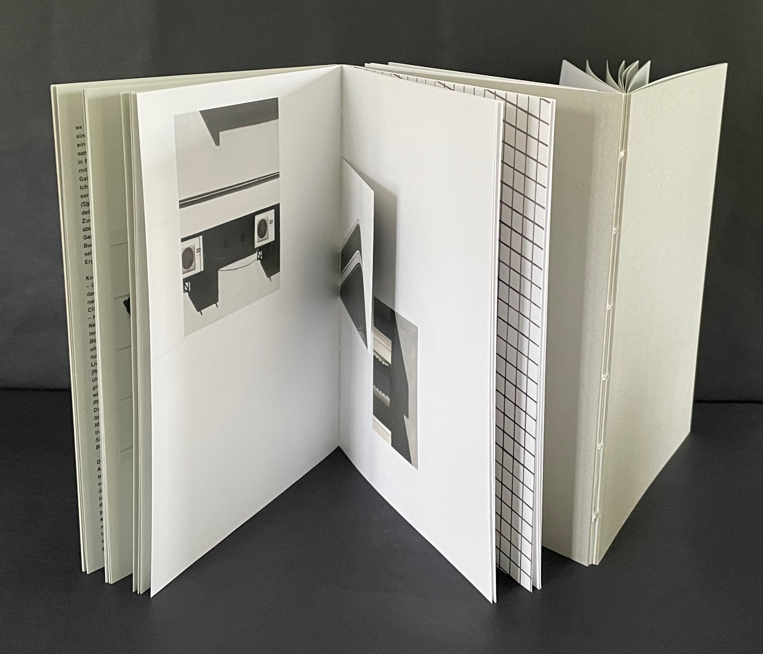 Open spine, dos-à-dos with grey bookbinding board. 210 x H260 x 210 mm. 104 pages. Edition of 250. Acquired from Einbuch Haus, 3 December 2025.