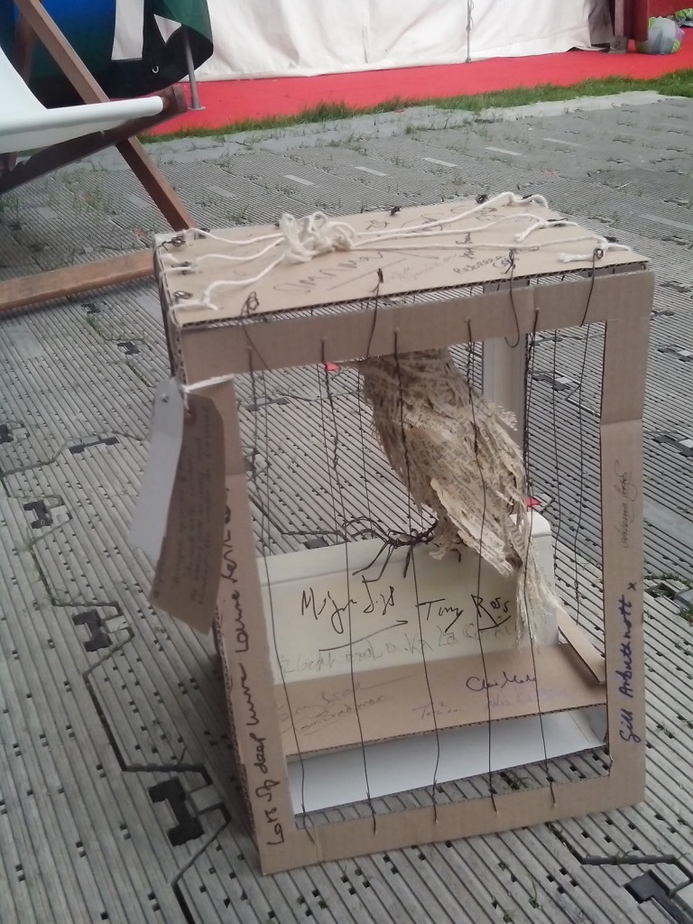 Paul St John Mackintosh posted some intriguing sleuth work at Teleread this month, occasioned by the Edinburgh International Book Festival. The work—and identity—of the MBAE (Mystery Book Artist of Edinburgh) has been a recurrent theme throughout the Festival. She has delivered works specifically for the Festival, which are part of her “Free to Fly” campaign (see @_freetofly_). One of them has attracted the autographs of some of the celebrated authors in attendance.