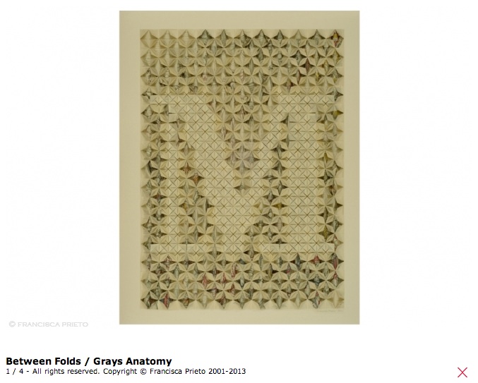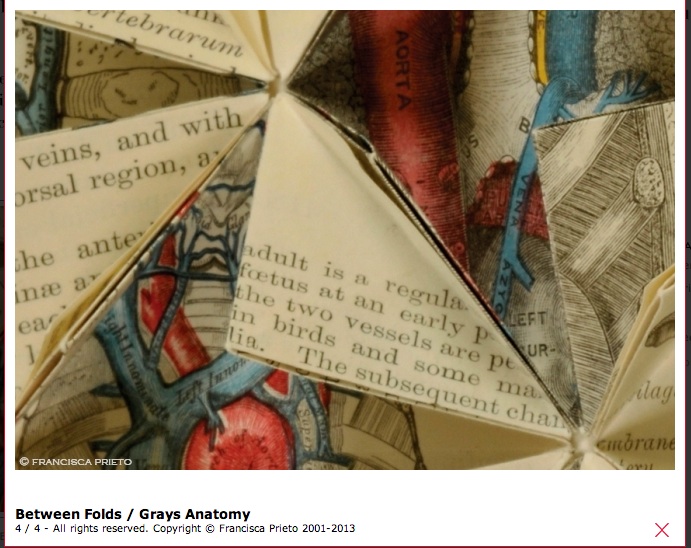 Underlined extends — or rather deepens — her series Between Folds, which according to her artist’s statement “explores pages of rare and damaged books or forgotten ephemera, emphasising the beauty and detail of print that would otherwise go unseen.” Prieto’s grounding in typographical design drives Between Folds as is obvious from the letters created from the pages of Grays Anatomy and Bartlett’s British Scenery.
