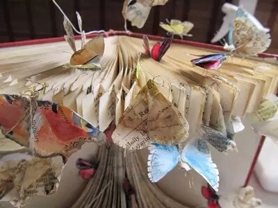 The Mystery Book Artist of Edinburgh has emerged again – this time from a chrysalis into a cloud of butterflies. The work shown will be auctioned for the benefit of Macmillan Cancer. The Macmillan Art Show will be opened this month by the mystery author Alexander McCall Smith: http://macmillanartshow.org/.