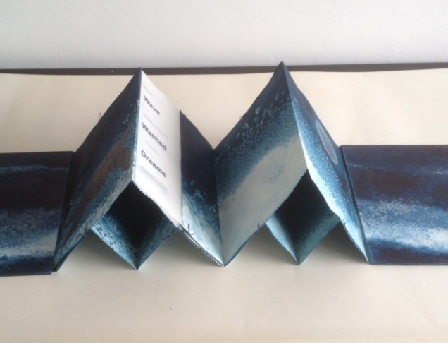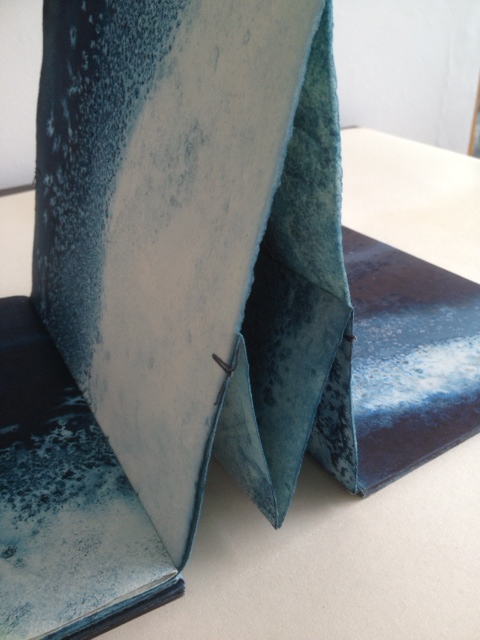 Painted board covers were then attached.”The stitches at the top and bottom of the page work well as it allows some small movement of the two concertina folds. As I saturate it with water and ink it needs to be a bit more robust but this means it can be bulky when put together.”