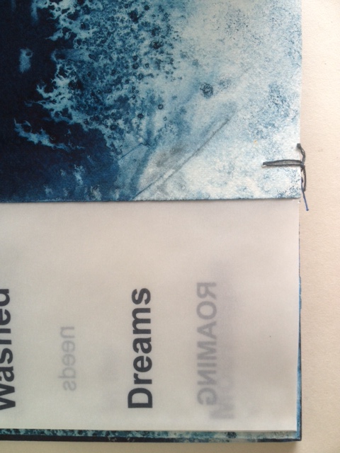 essentially two pages folded together into a concertina fold, but in origami terms, the “mountain” fold of one page is inverted to a “valley” fold, which creates “small boxes” between the pages when the concertina is opened as seen below. The single signature of transparent paper with text is sewn into the centre page. It is bound by a simple stitch top and bottom of each fold.