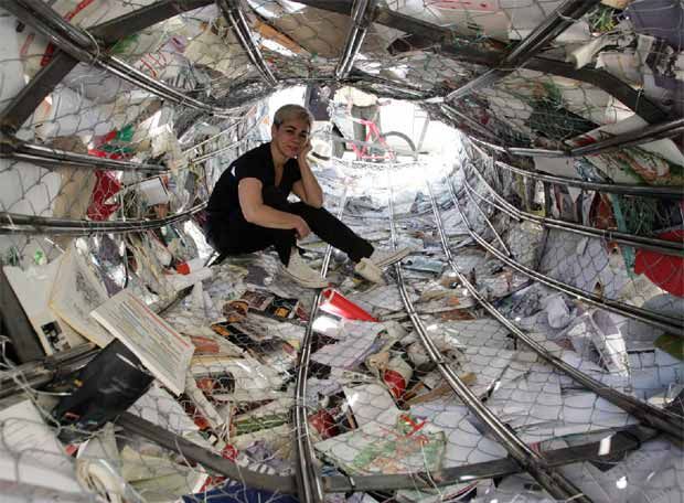 Alicia Martín’s installation, called Biografias, has appeared in Madrid, The Hague, Cordoba, Linz and Valencia.   The torrent of defenestrated books is made of over 5,000 titles fixed to a wire frame.