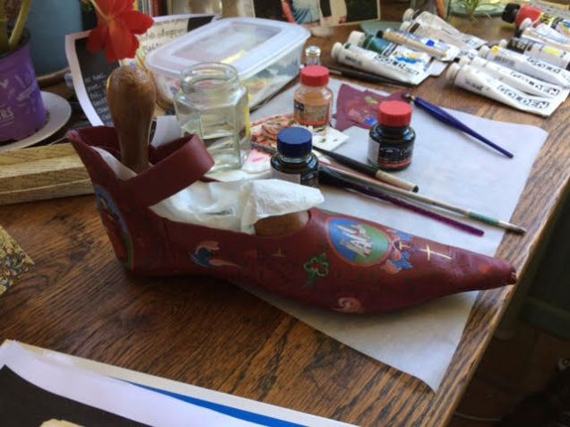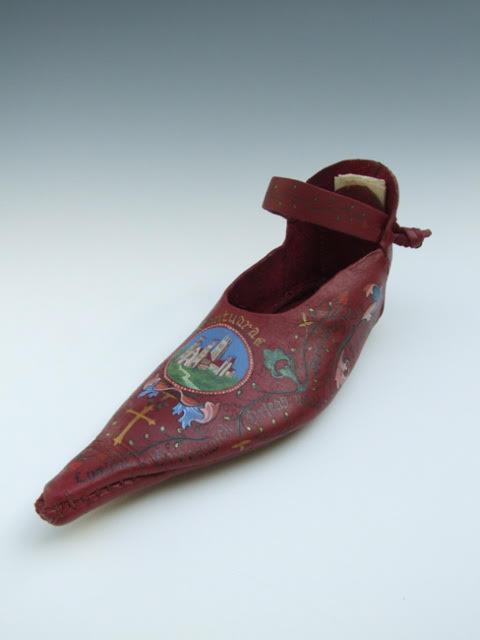 I hand painted images and added calligraphic text on the shoe. The place references from London to Canterbury were researched using various historical sources including the Gough Map http://www.goughmap.org/about/