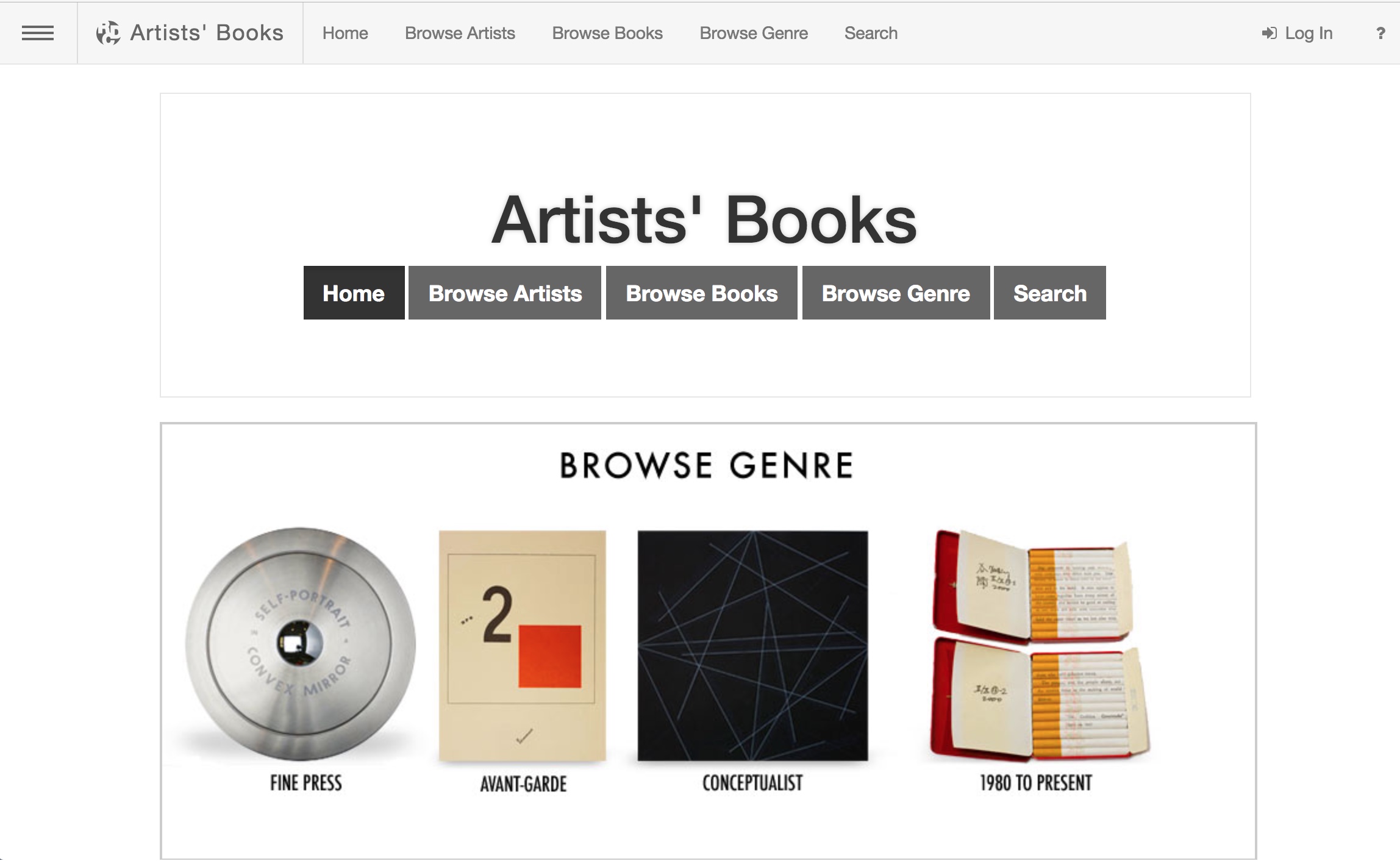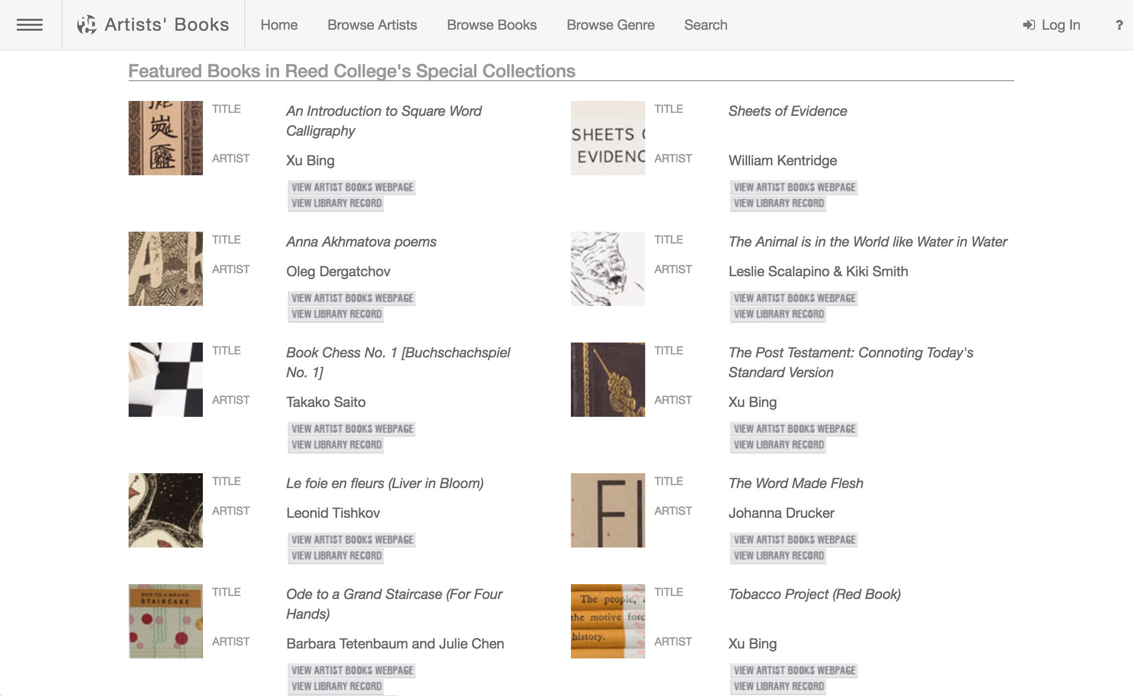 A search of the general library catalog with the term “artists’ books collection” yields over 1700 items, not all of which are in the Special Collection. This website offers visitors an organized way to browse the collection and enjoy access to individual sites for select items as shown here: