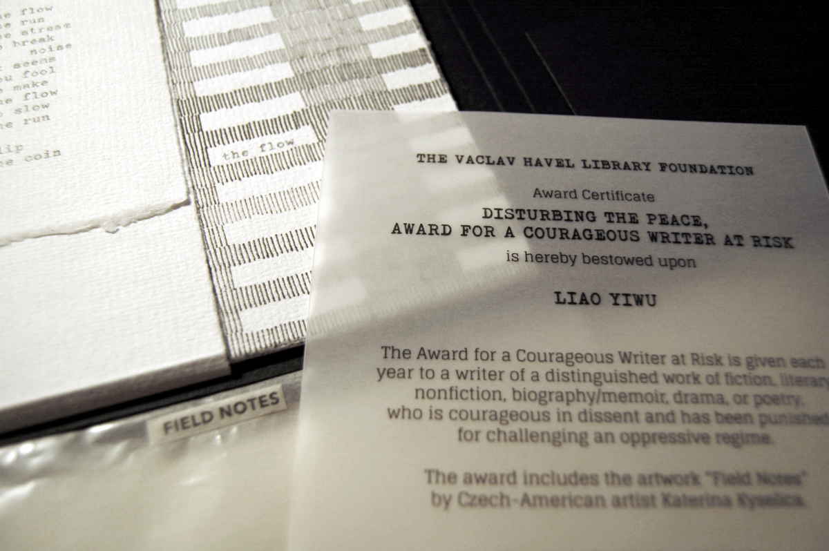 Field Notes was commissioned by the Václav Havel Library Foundation for its 2018 “Disturbing the Peace, Award for a Courageous Writer at Risk“, presented to the Chinese author, writer, musician and poet Liao Yiwu (aka Lao Wei) on 27 September 2018 at the Bohemian National Hall in New York. Across nine loose leaves, the typewritten words and lines of the poem are dispersed, arranged among fields of regimented rows of vertical strokes, drawn on handmade Losin paper. The drawings could represent anything: a field of grain, a tower block with windows, or marks on a prison wall to count the days. The loose format of the book allows readers to arrange the drawings or compose the text in an order as they see fit, although a colophon presents the full poem in its intended order.