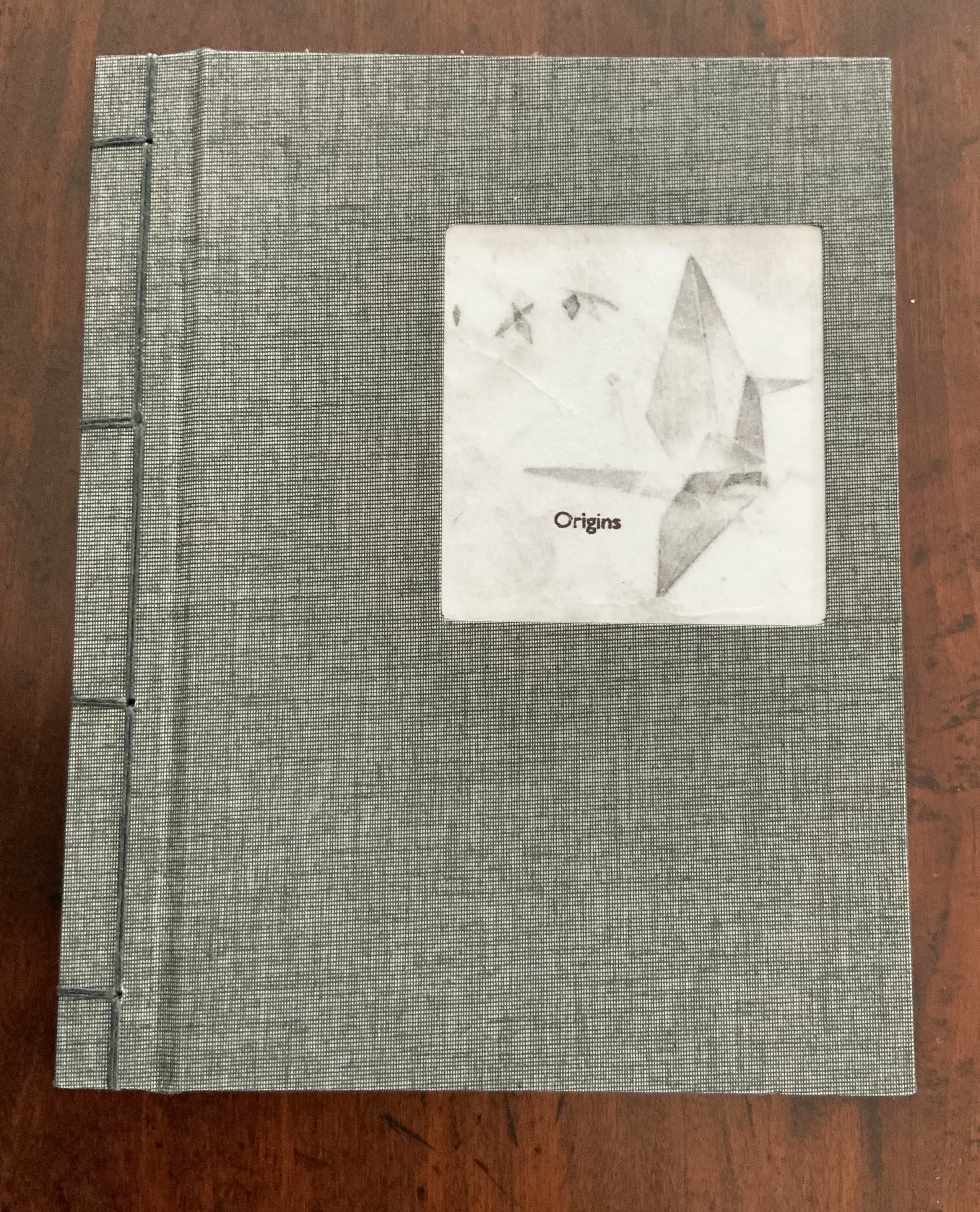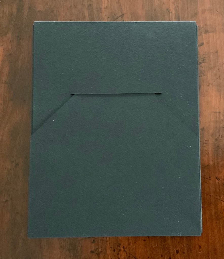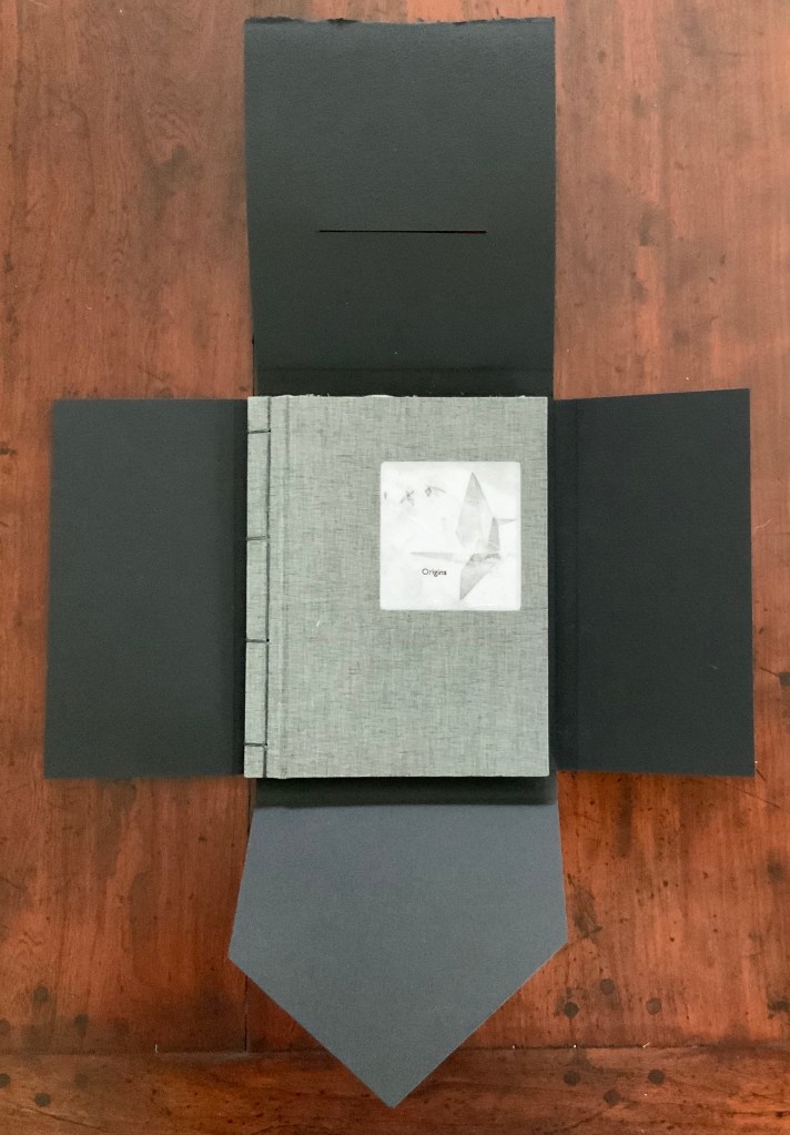 Printed and bound in an edition of 7 copies, of which this is No. 4 and signed. Carbon paper pressure prints from collograph plates, pochoir and silkscreen on Kozo. Bound in four-hole Japanese stab binding covered in black/white Duo cloth with doublures of Arches Cover Black. Encased in Arches Cover Black, two pieces glued perpendicularly, one trimmed to form a slot and tab closing. Encasement H197 x W153 mm. Book H193 x W152 mm closed and H193 x 1007 mm open.