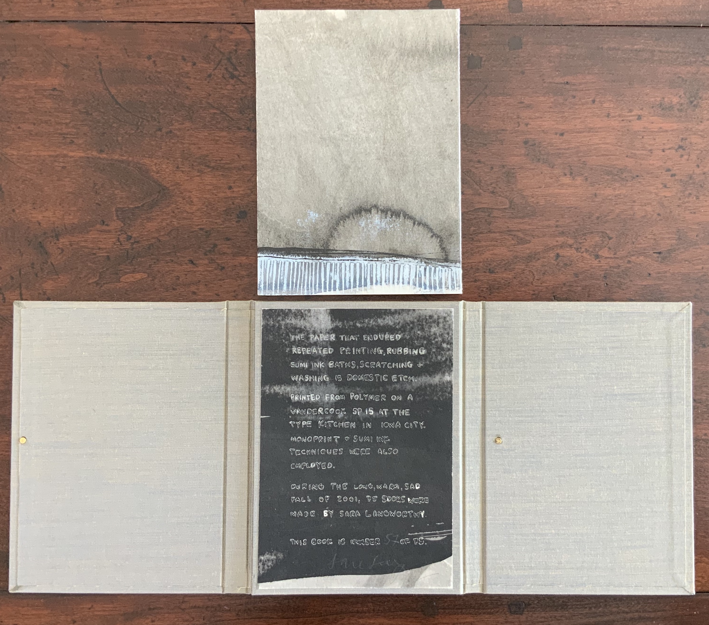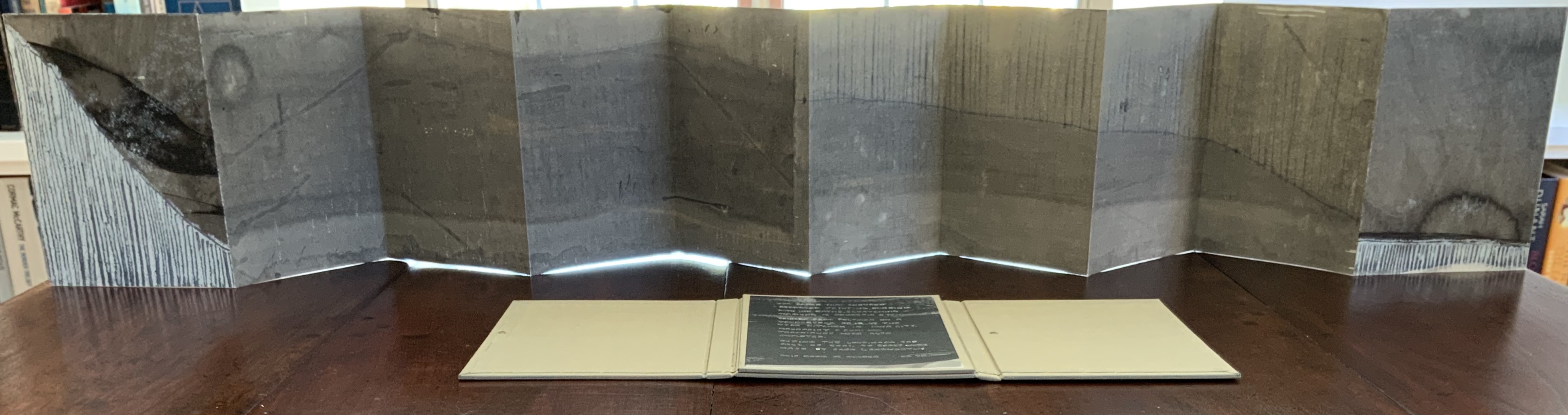 The book is housed in a 3-flap portfolio. Photopolymer, sumi ink wash, accordion binding. The paper is Domestic Etch that has undergone repeated printing, rubbing, sumi ink baths, scratching and washing.