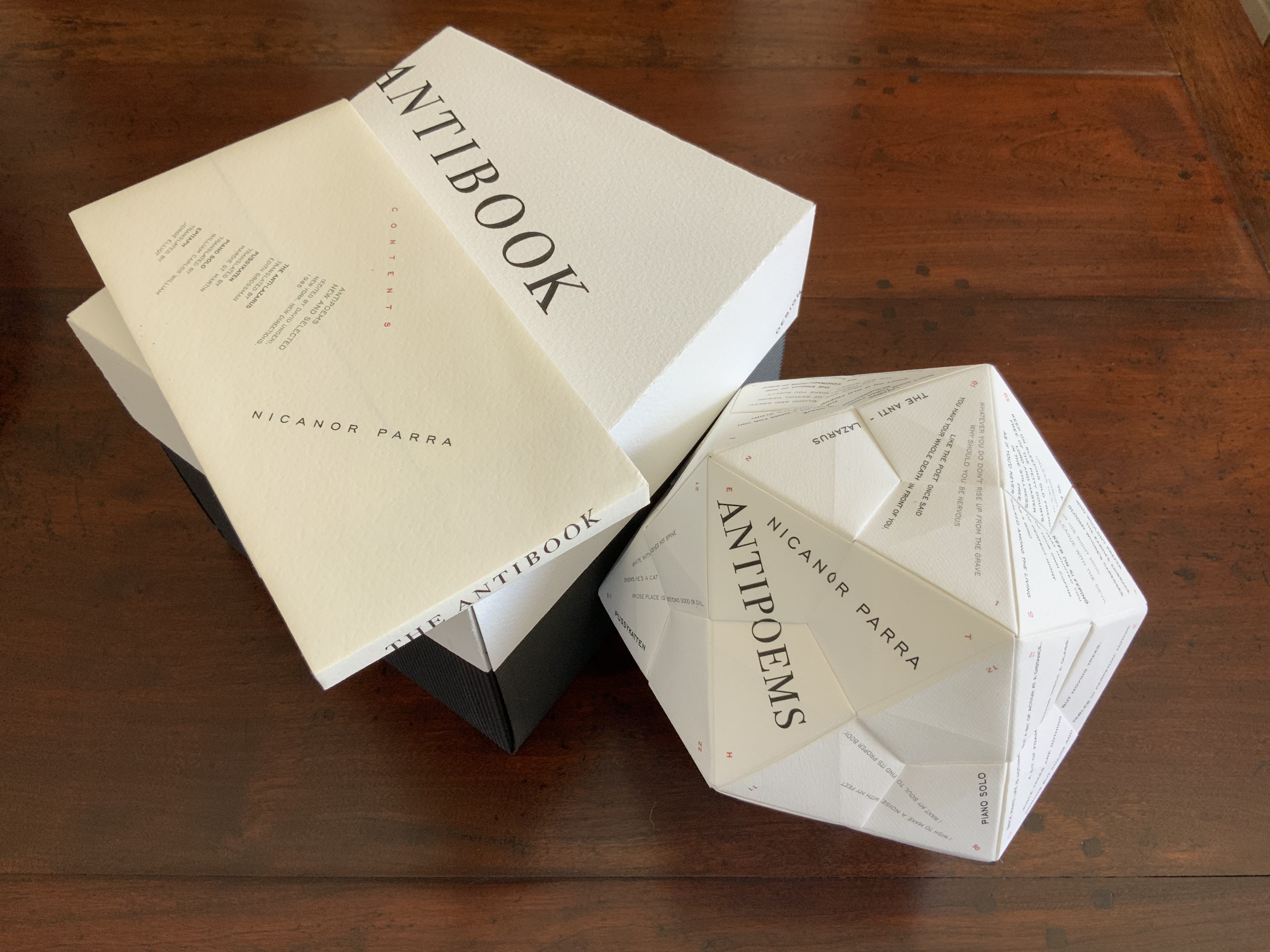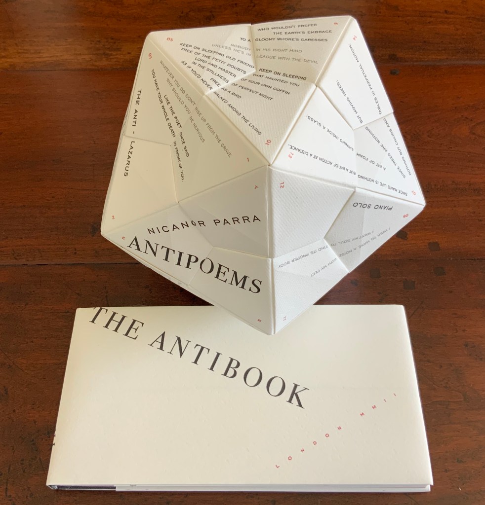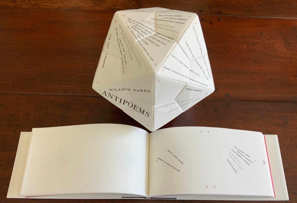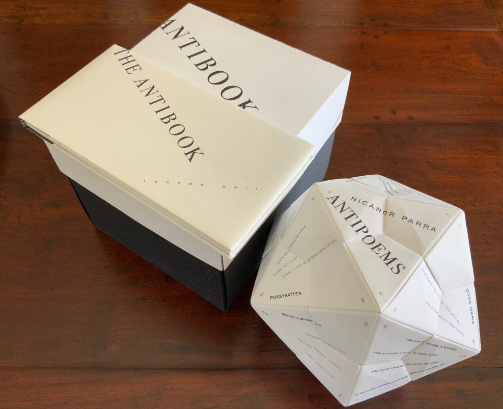 To hold and turn The Antibook in your hands to read Parra’s poems makes the book of poems strangely more palpable than the conventionally bound version. The work as a whole has its maximum effect when the reader/viewer engages with both the icosahedron and bound book, weighing the experience of each against the other.