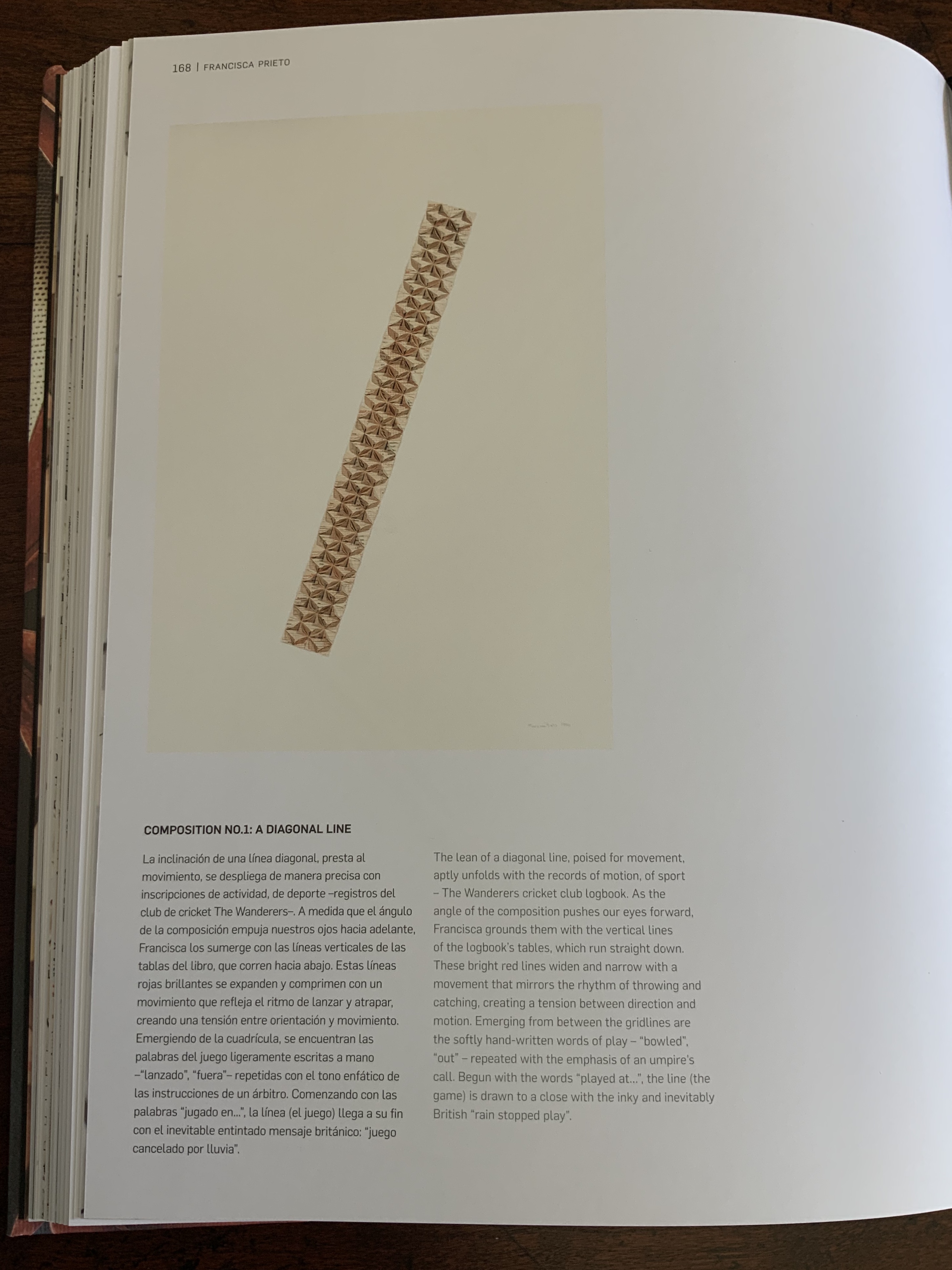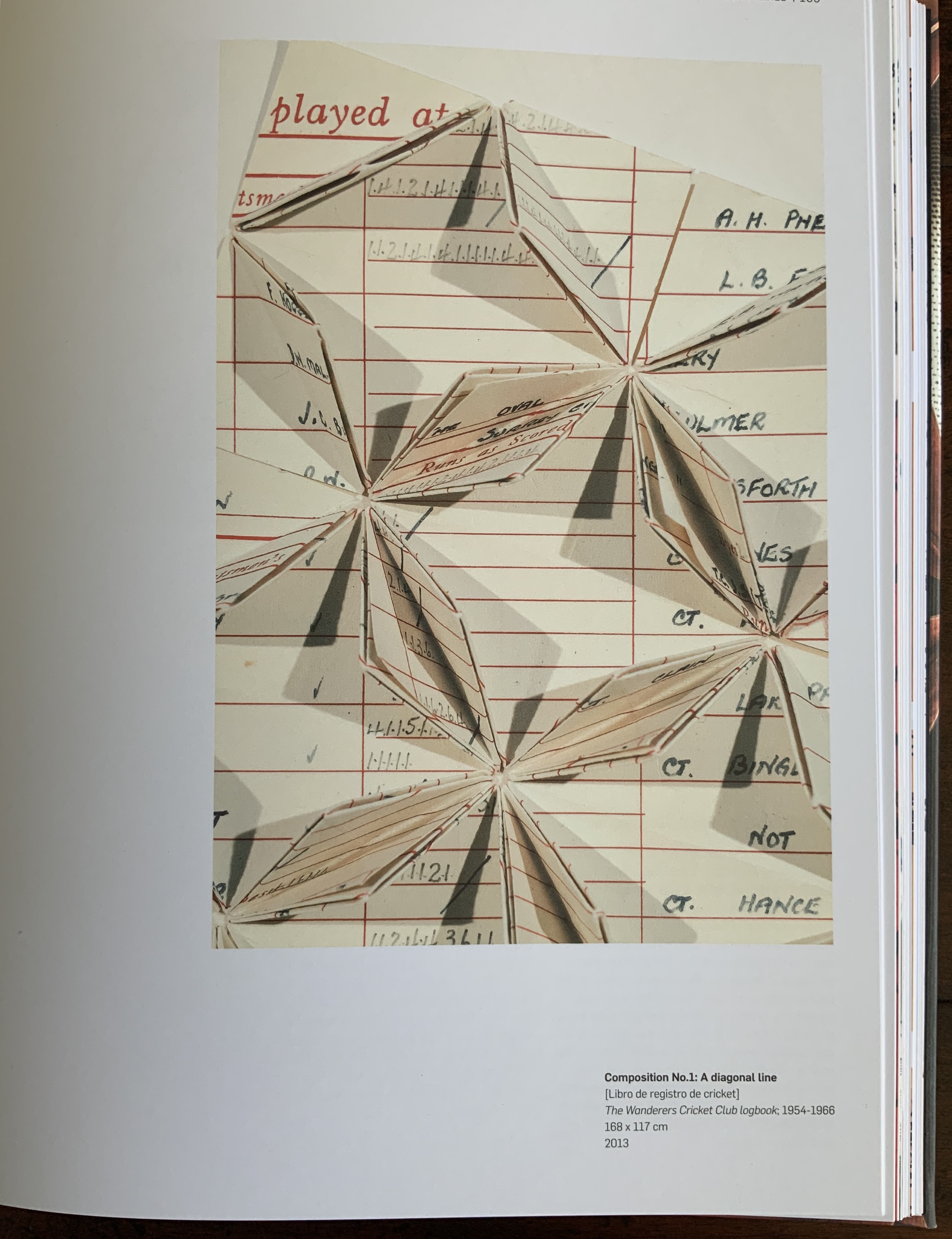 Having seen Composition No. 1, I can attest to the precision of its folds. Like The Antibook and all of Prieto’s works I have seen, it is nearly impossible to resist touching it. By using this old cricket club record book and placing it on a diagonal like a falling wicket stump, the artist adds paper-dry humour to a beautiful work of book art.
