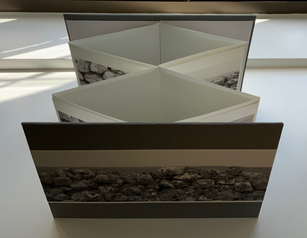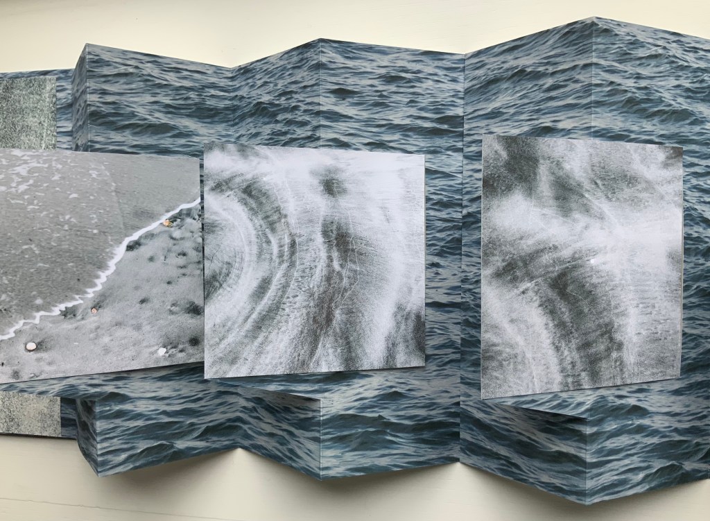Artist’s description: “… it’s the first time that I’ve made a book using this structure which was originally devised by the book artist Hedi Kyle. By carefully cutting and folding the concertina, individual panels and hinges are formed onto which I then attached my sequenced photographs. The photographs were taken on a remote beach at Rosinish on the island of Eriskay in the Outer Hebrides. It’s a sheltered bay so no big waves, but it was fascinating to see the subtle marks left on the sand as small waves slowly retreated as the tide went out. The sequence echoes the movement of the waves as they moved around individual rocks in the sand where I was standing. The concertina and book covers show the open Atlantic Ocean whose sea laps these shores”.
