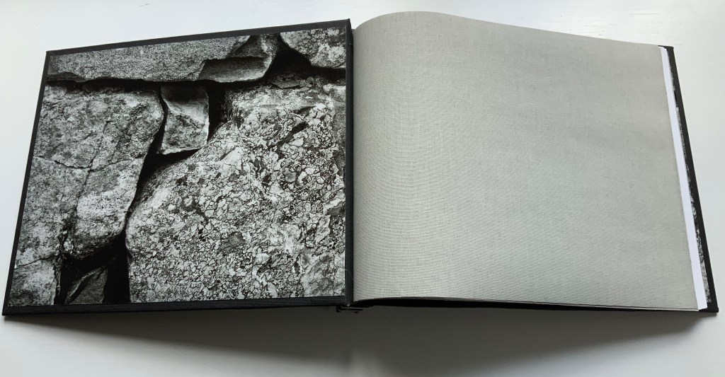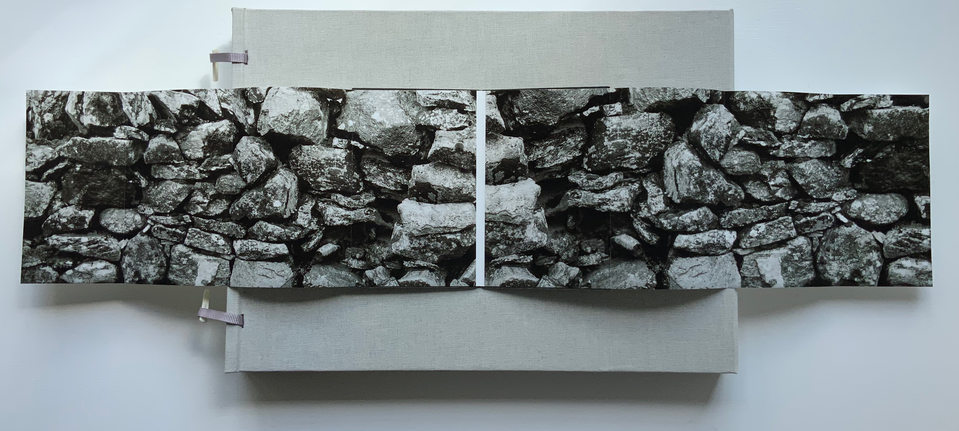Grant delivers her phot0graphs of drystone walls on the island of South Uist in the Outer Hebrides in a structure that echoes the walls and the theme of enclosure. With the photos held in pockets, their sequence can be varied as the viewer wishes, which also leads to recurrent contact with the very tactile paper used.
