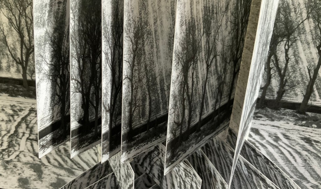 The photograph selected from Grant’s Land Lines project for the commissioned artist’s book is strangely textured — as if drawn with charcoal and gesso. With the cover’s treatment in particular, Grant has deepened the texture, and using the flag book structure, she has developed the texture even further. Every aspect of Tree Line draws the viewer into a visual experience that is tangible.