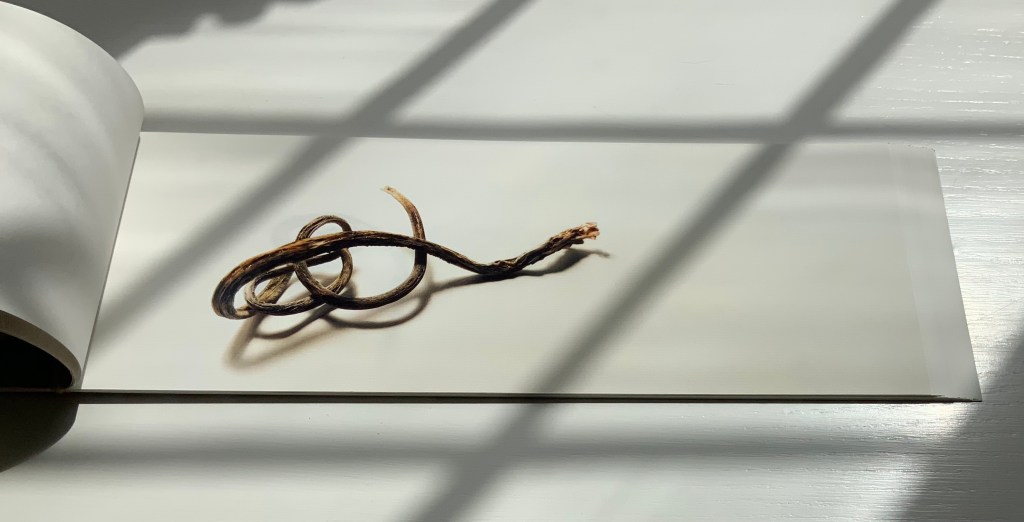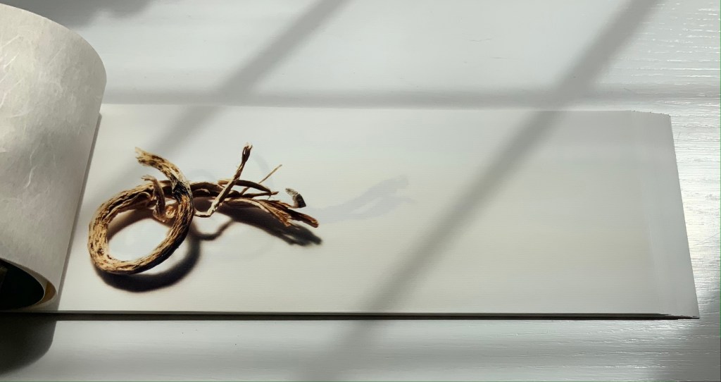 Venation invites an end-of-autumn expectation that turns into an experience of veneration. The endpapers move aside like a veil, the book opens to reveal eight relic-like holly leaves and closes to reveal what could be five tall bark-clad votive candleholders containing scrolls. Unrolled and smoothed, the scrolls present photos marking further stages of the leaves’ dessication. The visual and tactile richness of the work delivers a sense of opening a treasure, relishing a keepsake.