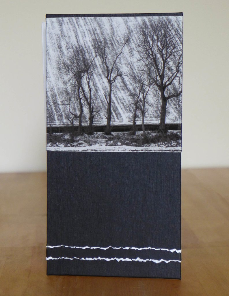 Hard backed flag book of a single image 6 flags wide and 4 flags deep. Images printed on Ice Duo Matte 320gsm. Concertina image printed on Hahnemuhle Rice Paper 100gsm. Covers hand painted jaconette with Payne’s Grey acrylic with hand painted torn line in black acrylic.