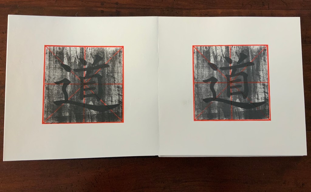 Almost a decade after a first viewing at the Frankfurt Book Fair, The Way became part of the Books On Books Collection. One thing such an experience teaches is carpe diem. It has taken all those years to have the chance to learn that the book opens from left to right, that the “red figure” in the woodcut is the standard grid on which Chinese letters are brushed, that the grid and the character remain constant under the wash that darkens as the pages turn, and that the embossed character on the front and back covers is reversed on the back cover.