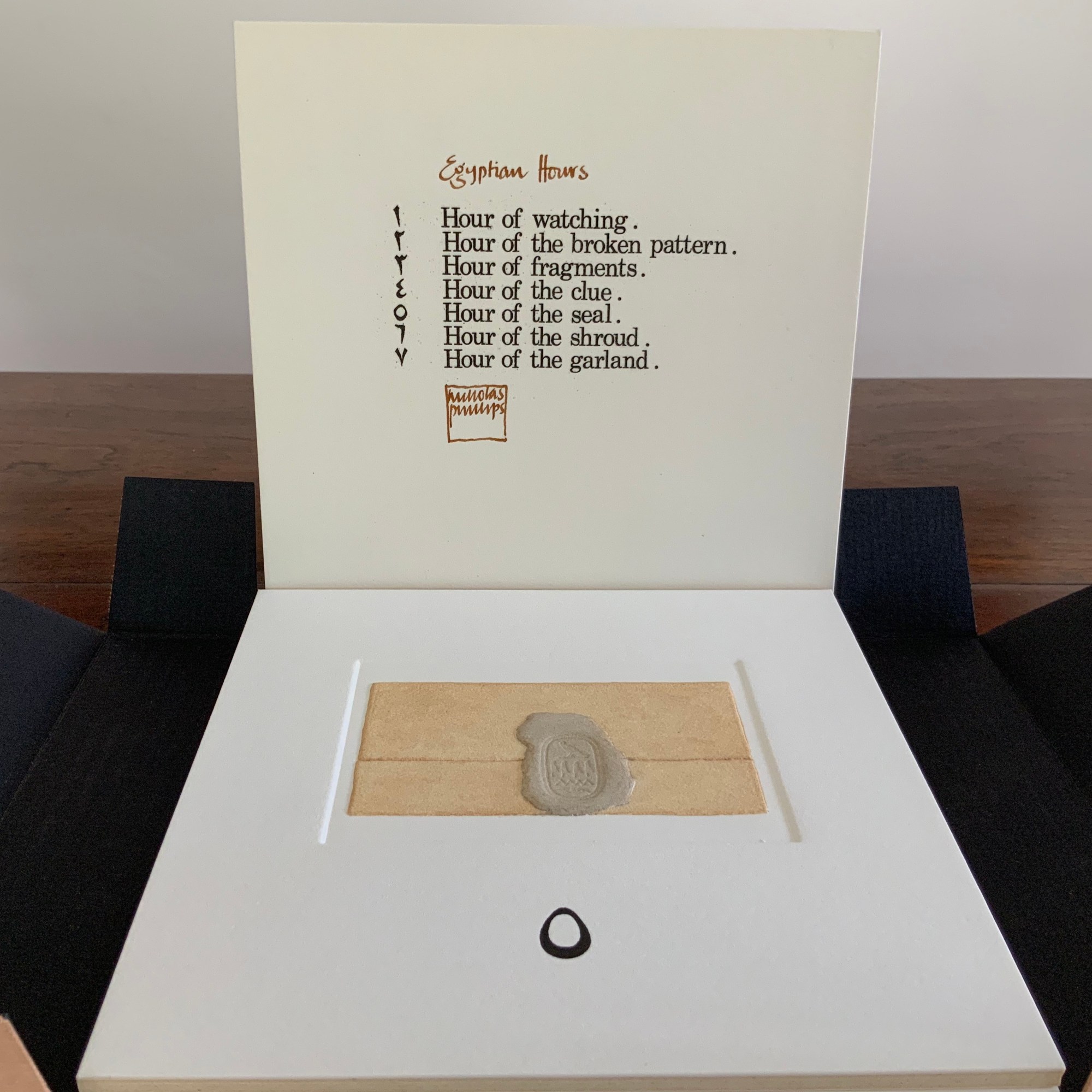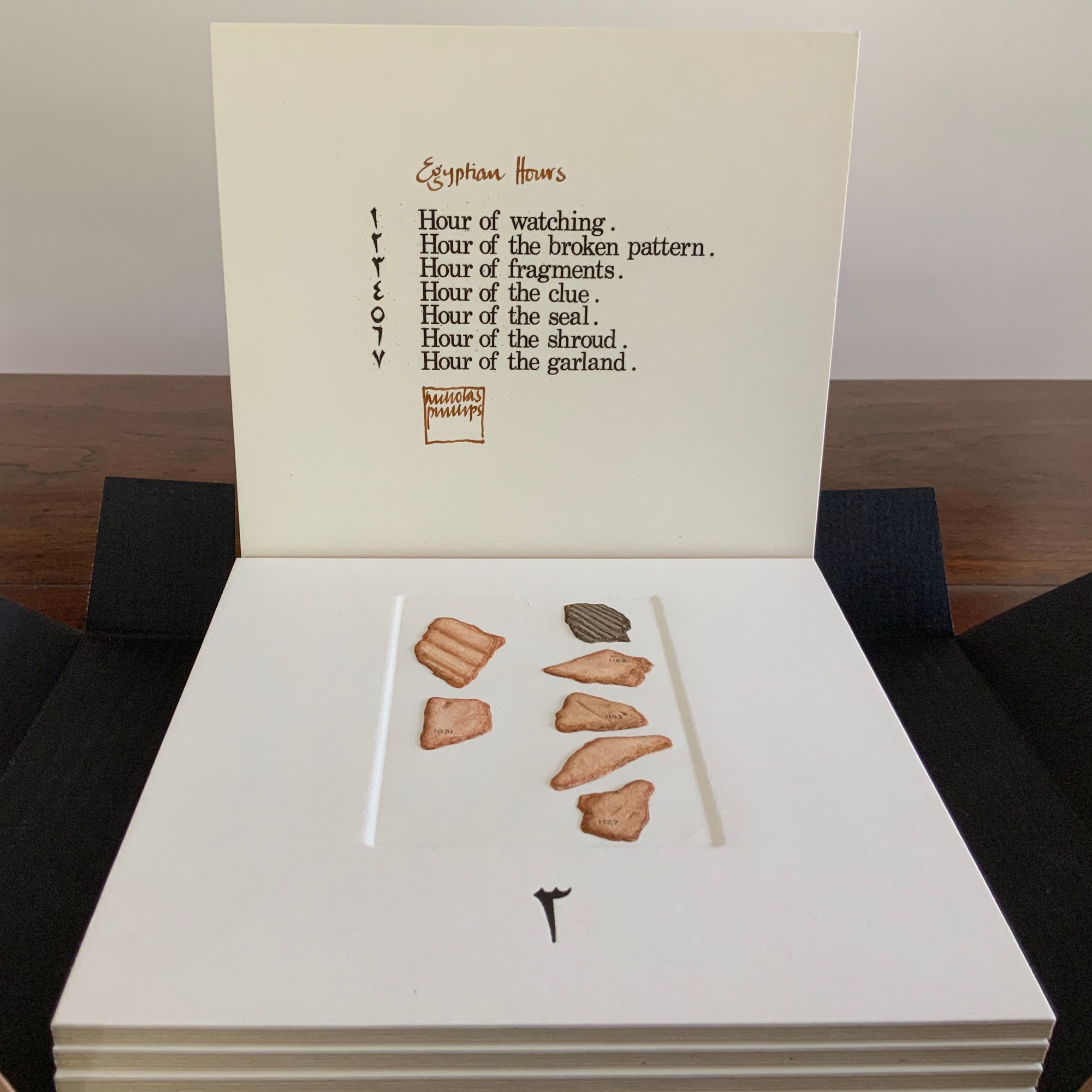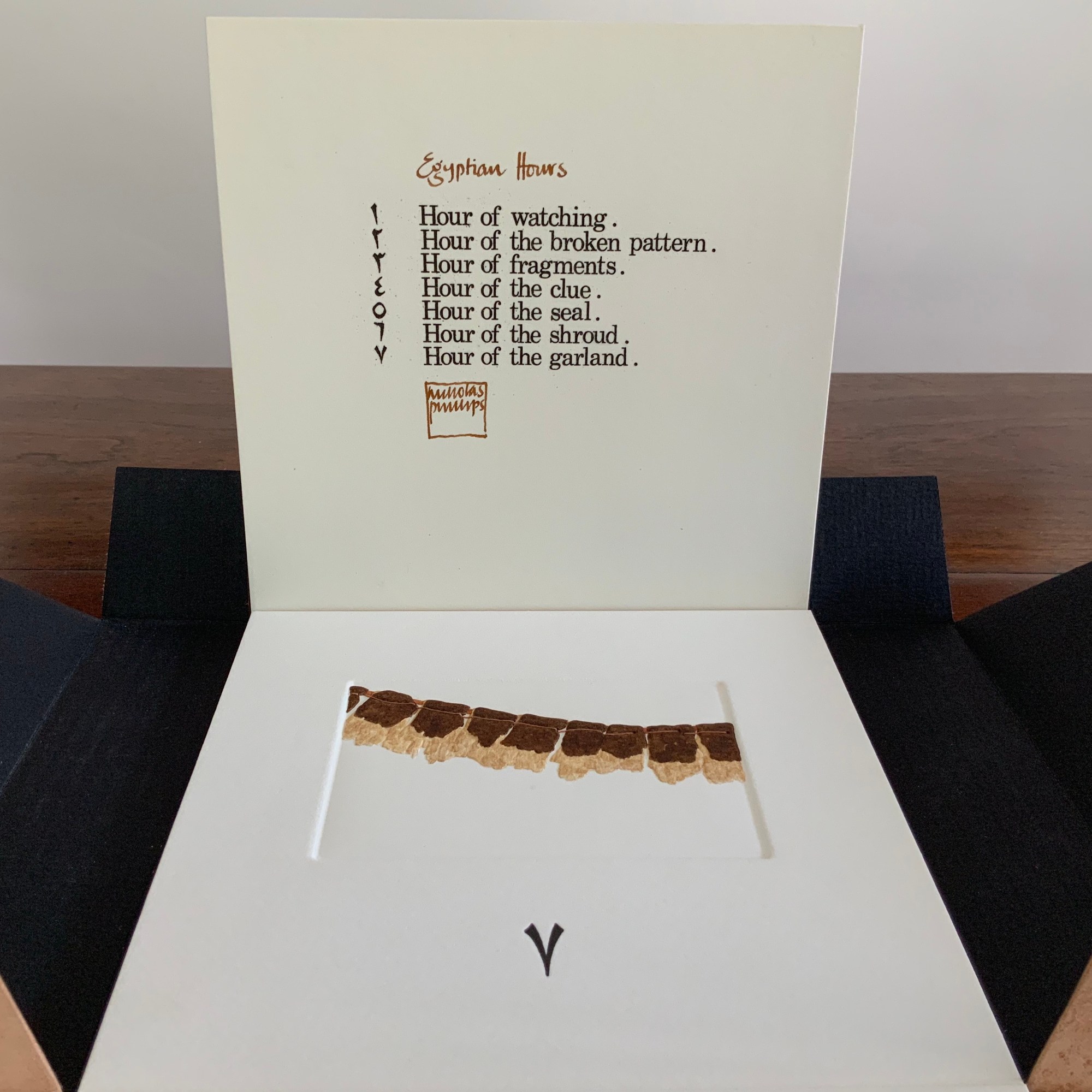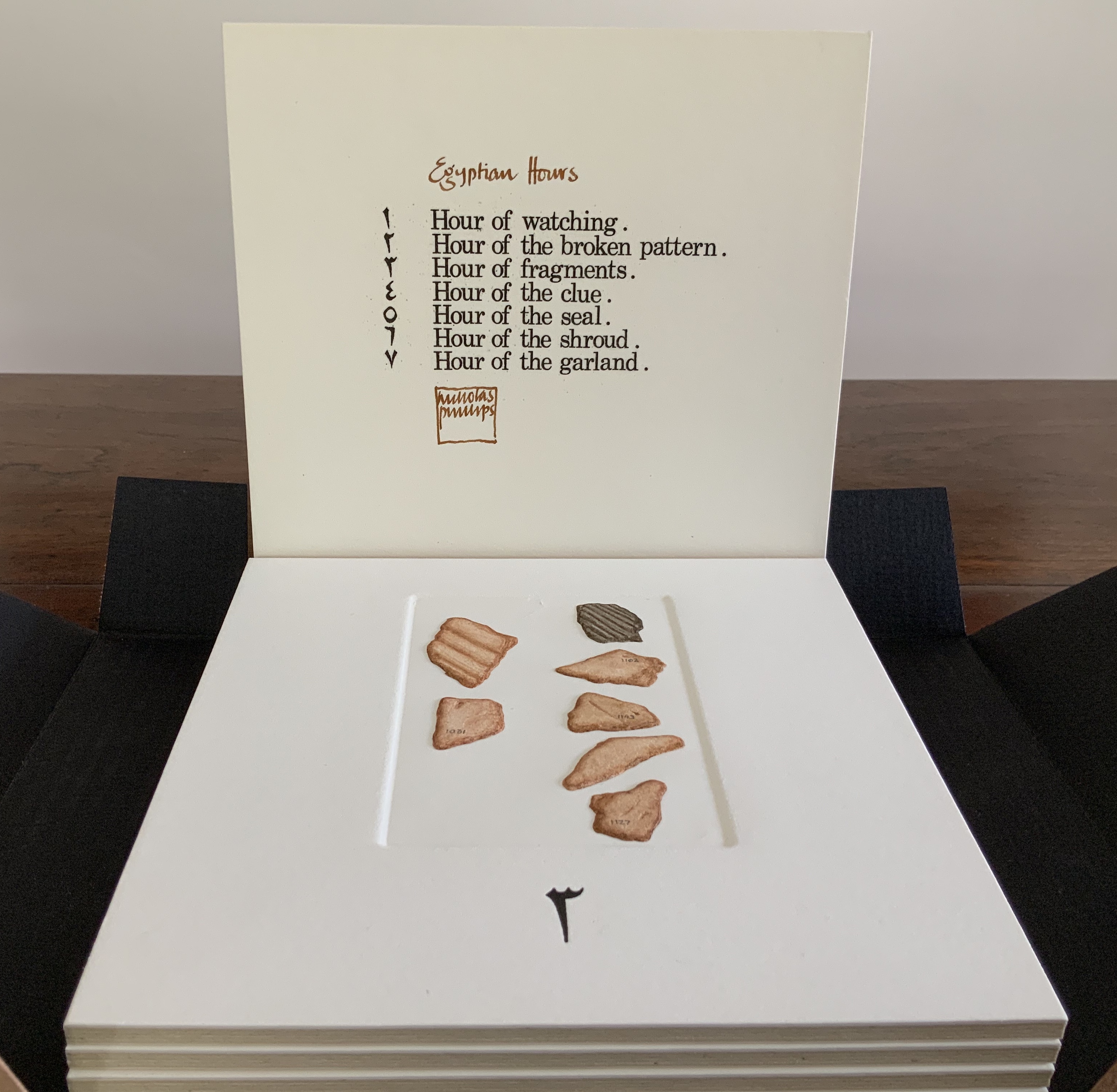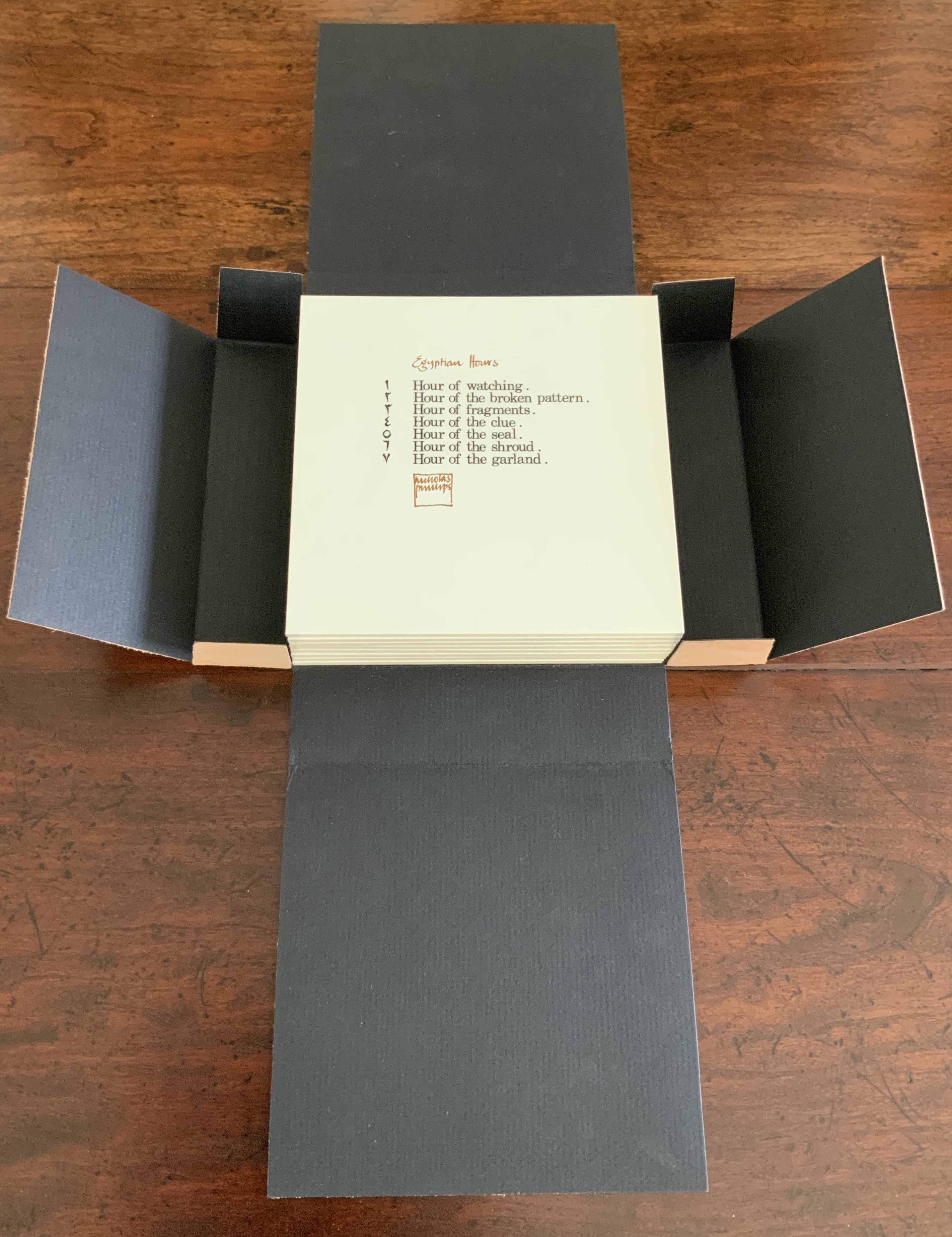 Egyptian Hours falls somewhere between book and portfolio box. Somewhat like photos and captions in a photobook, text and relief images play off one another, but only somewhat: at a distance the table of contents names and orders the hours; only the Arabic number glyphs from the “table of contents” mediate the named hours. If the table of contents is held apart as in the photos, the distance shortens.