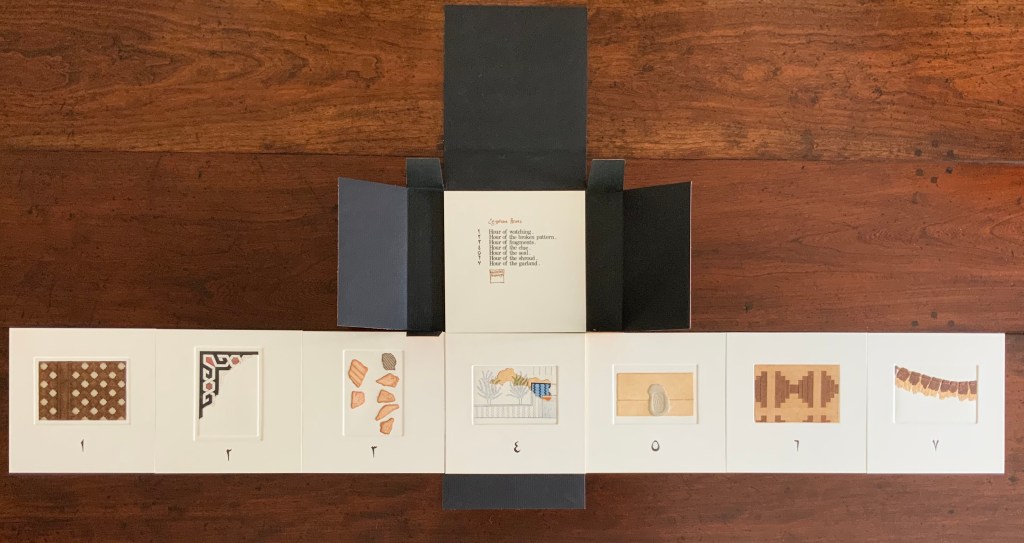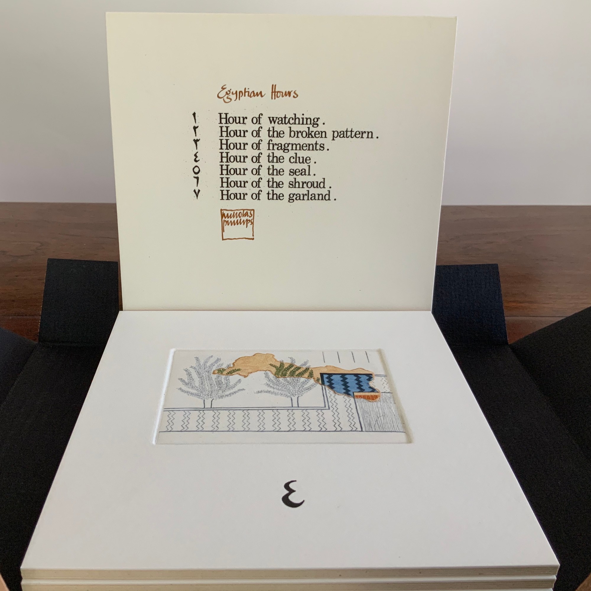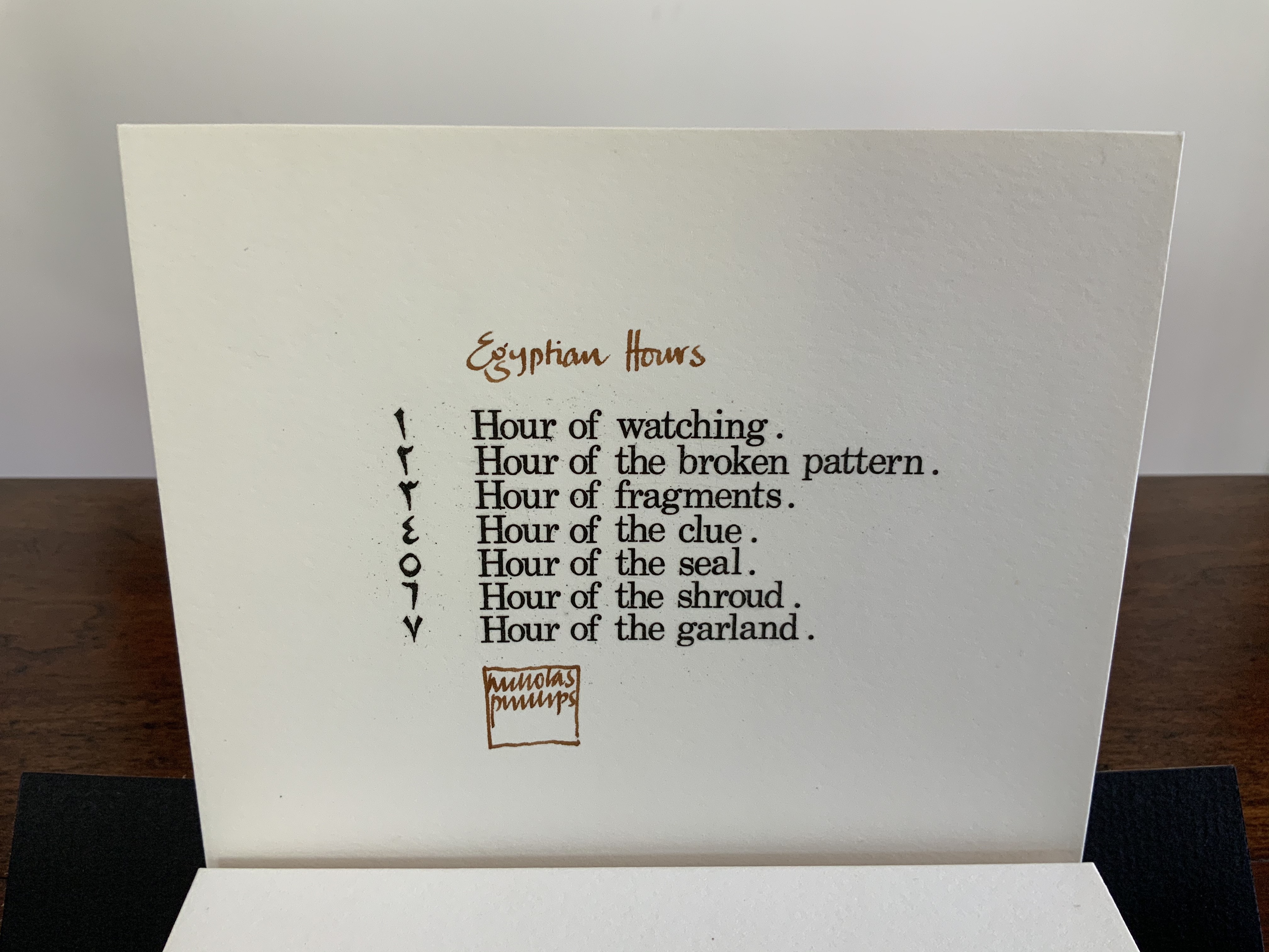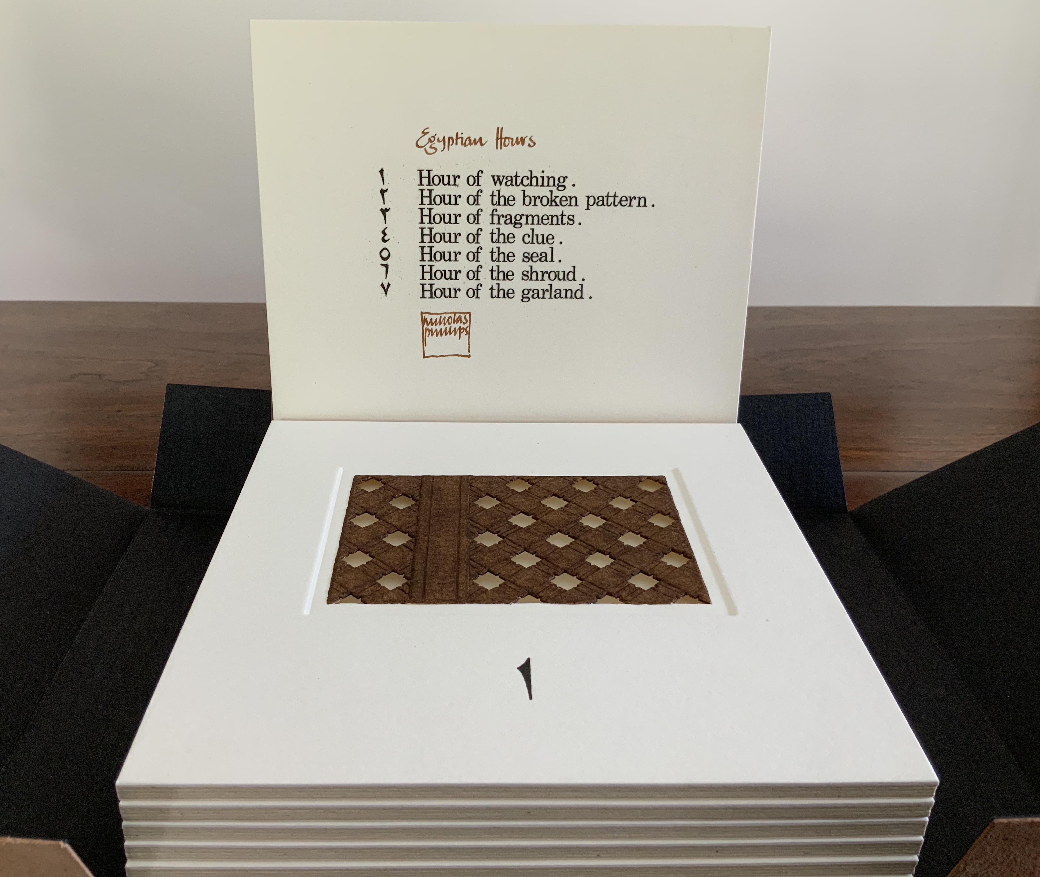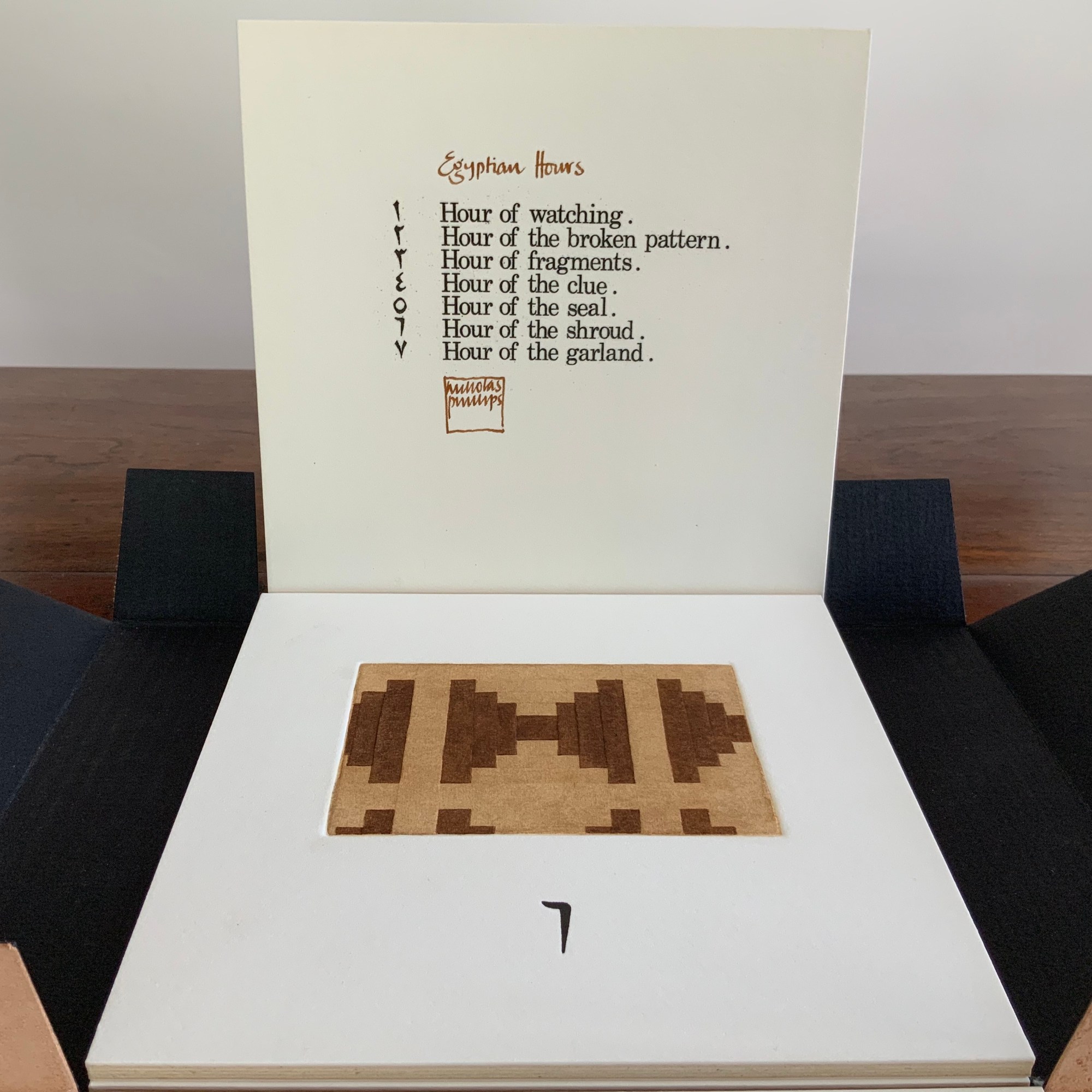 Egyptian Hours falls somewhere between book and portfolio box. Somewhat like photos and captions in a photobook, text and relief images play off one another, but only somewhat: at a distance the table of contents names and orders the hours; only the Arabic number glyphs from the “table of contents” mediate the named hours. If the table of contents is held apart as in the photos, the distance shortens.