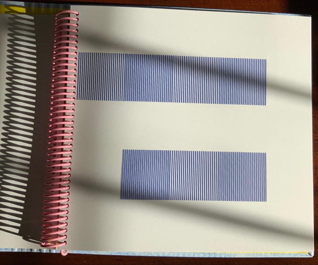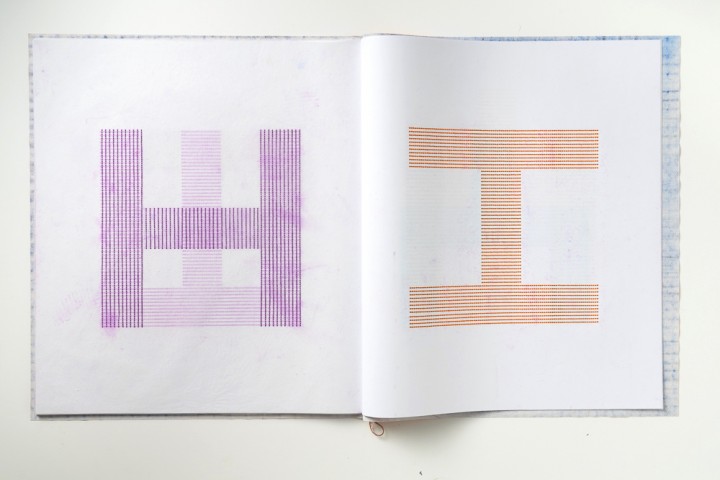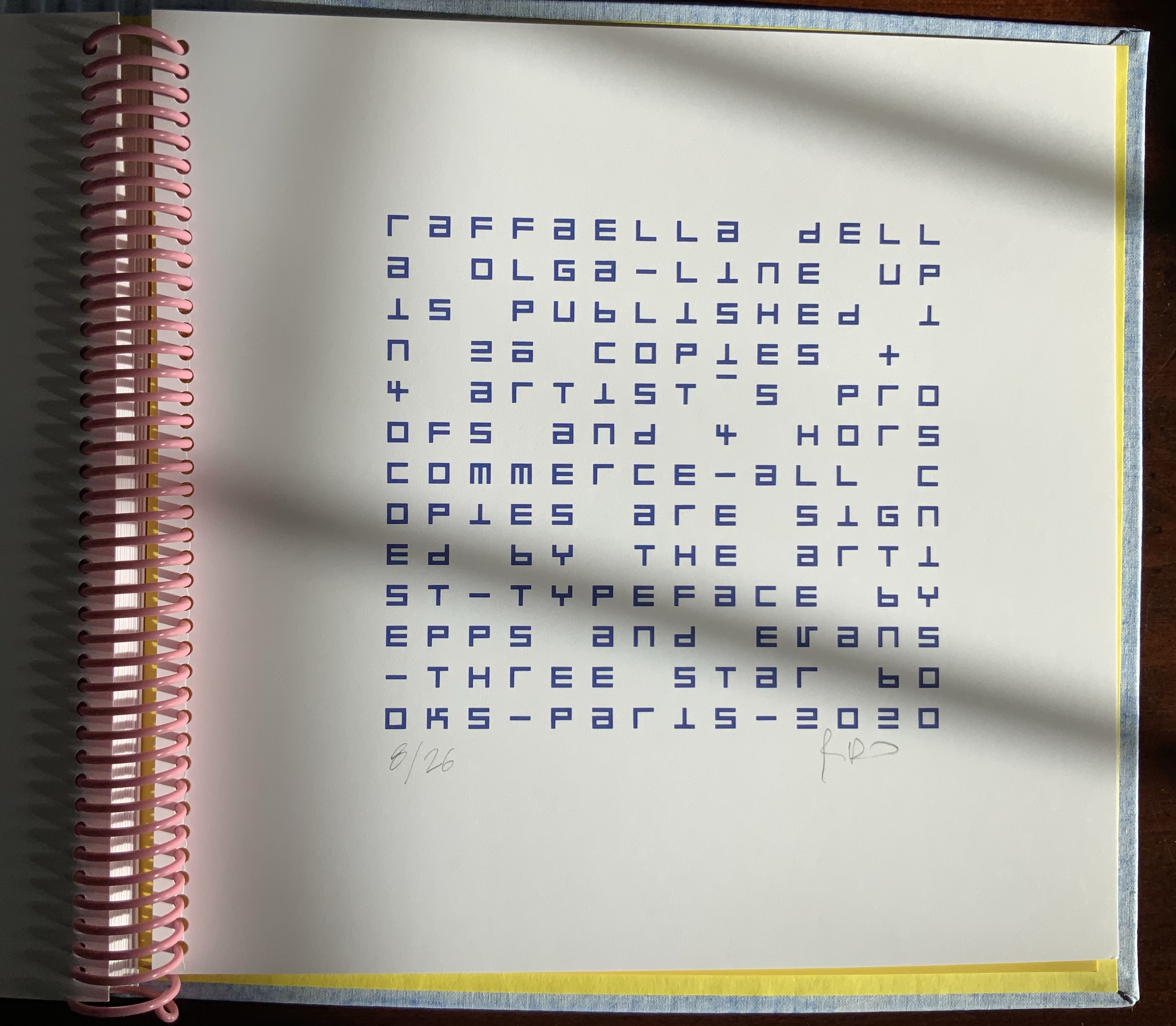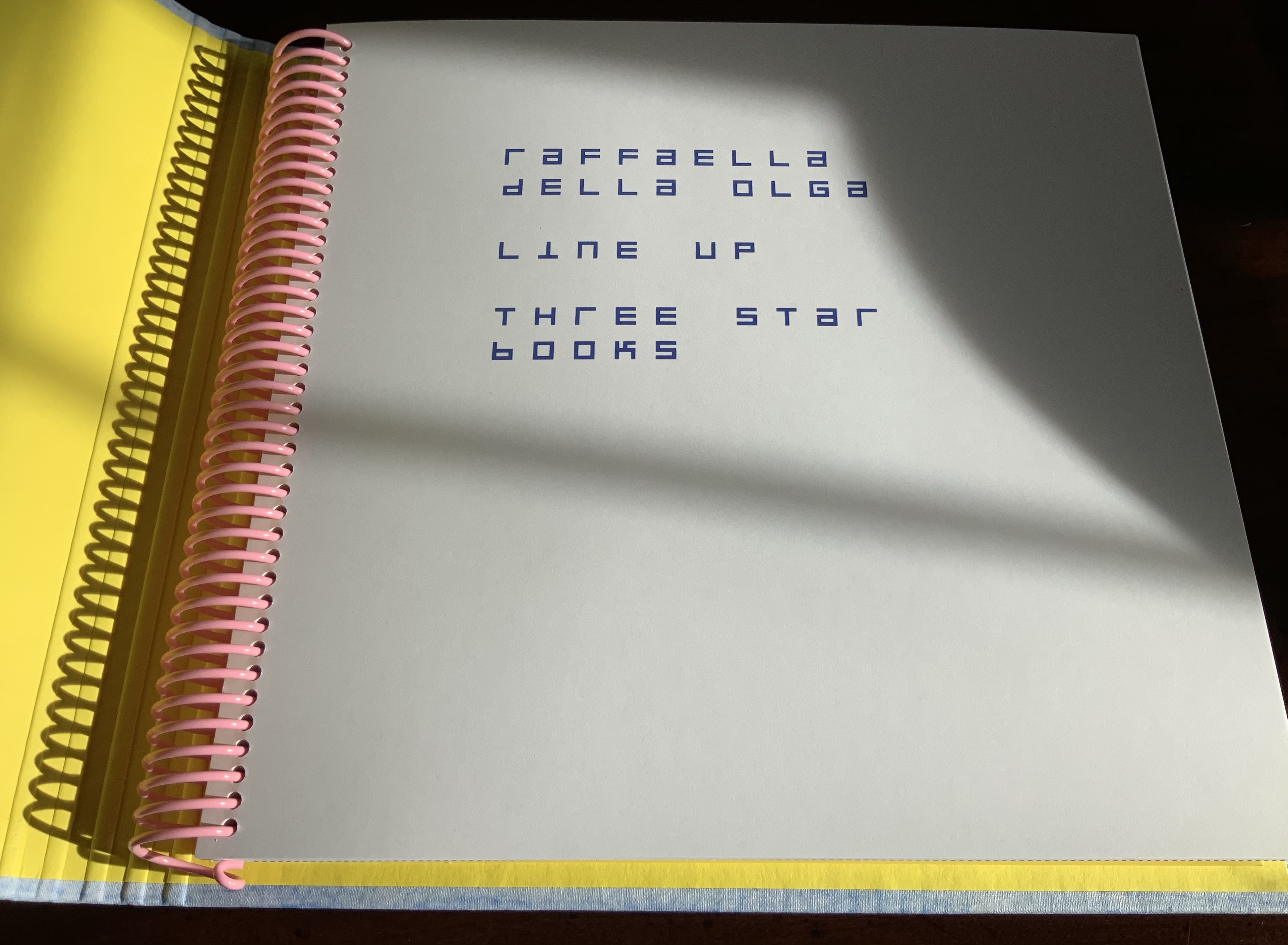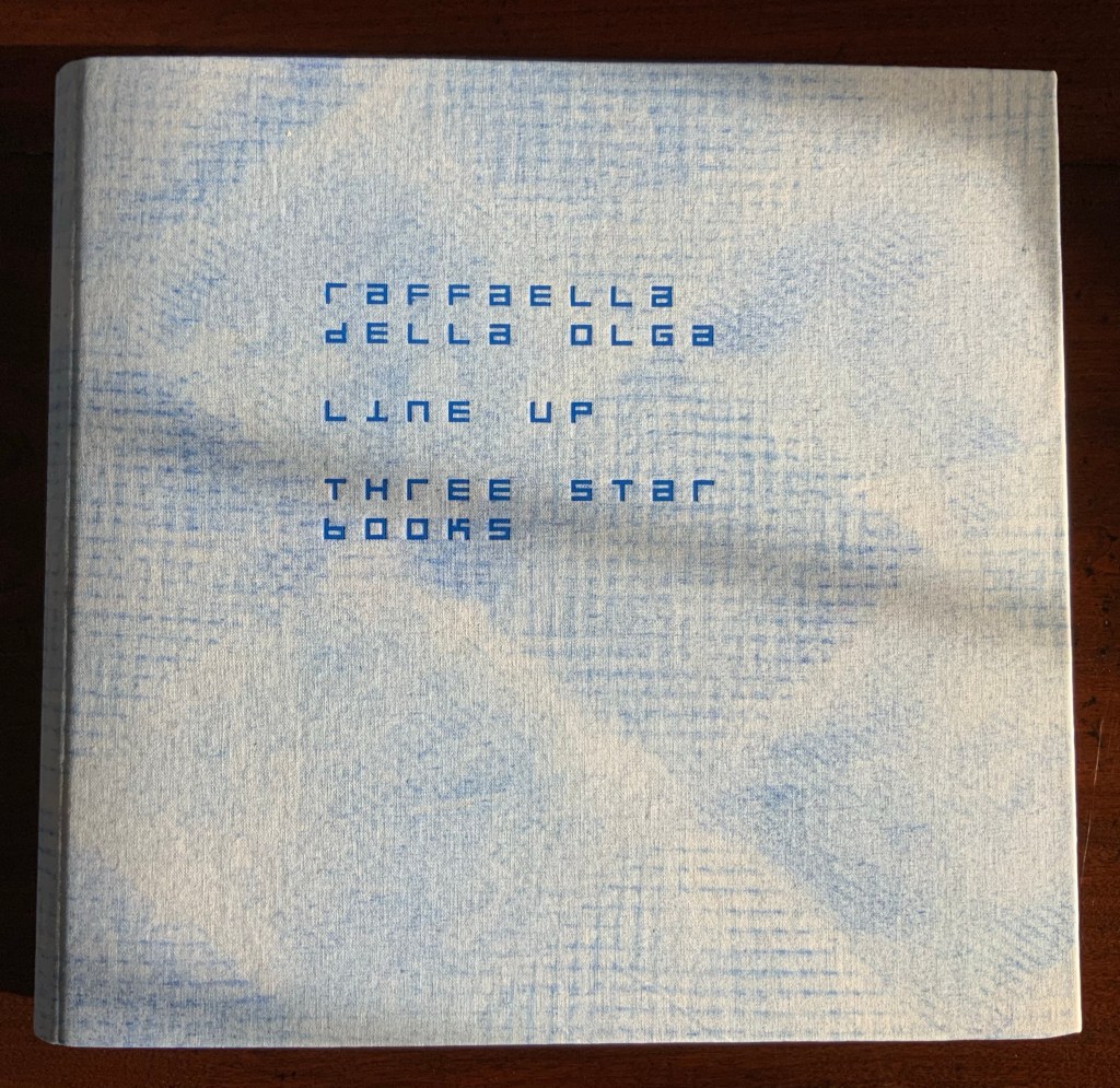 LINE UP is very much a collaborative work between Raffaella della Olga and Three Star Books, founded in 2007 by Christophe Boutin and Mélanie Scarciglia with Cornelia Lauf (2007-2015). The edition consists of twenty-six spiral-bound copies, each with a unique cover produced by rubbings on canvas and differently colored. The title page and colophon take up two of the card folios in the volume, which leaves twenty-six for the printed content. Blocks of vertical blue lines turn the pages into letters based on the Epps-Evans alphabet, designed in the 1960s with only horizontal and vertical strokes in an attempt at machine readability.