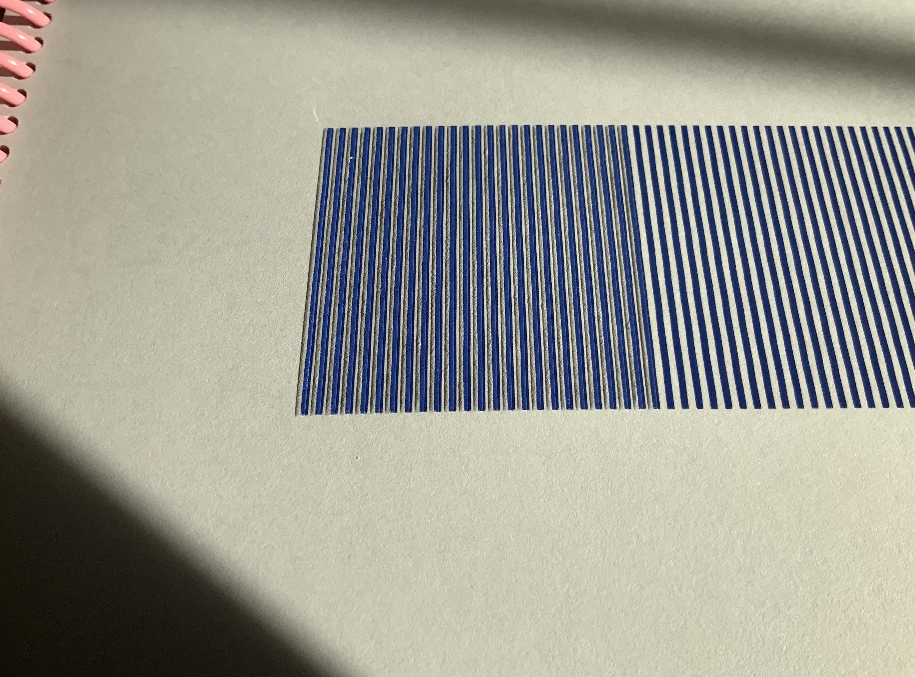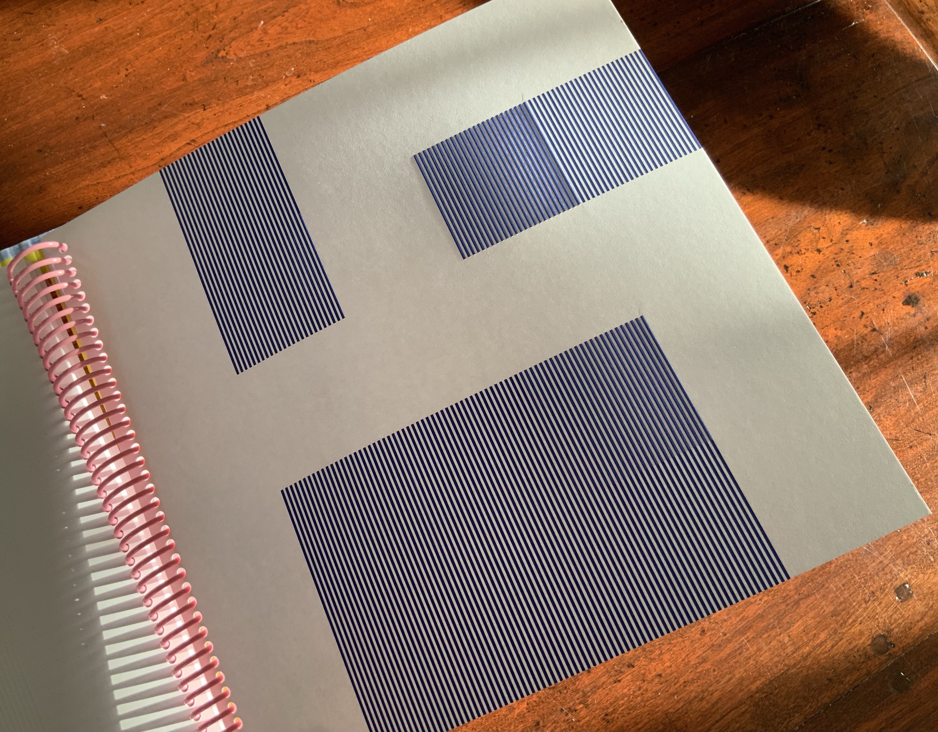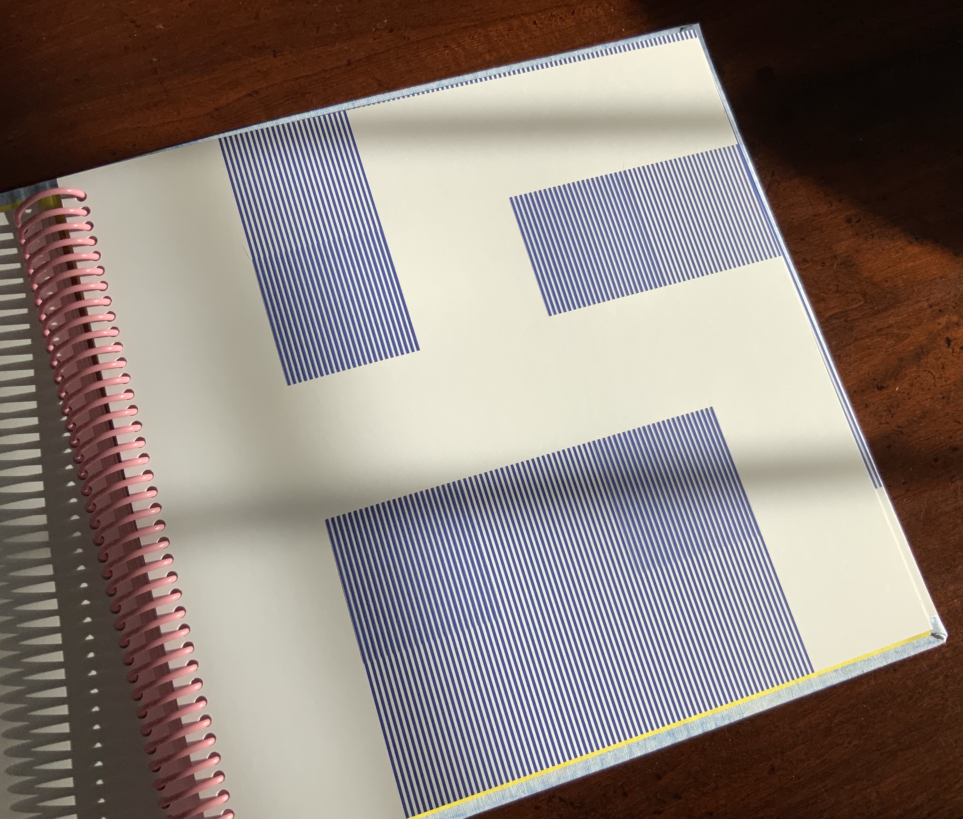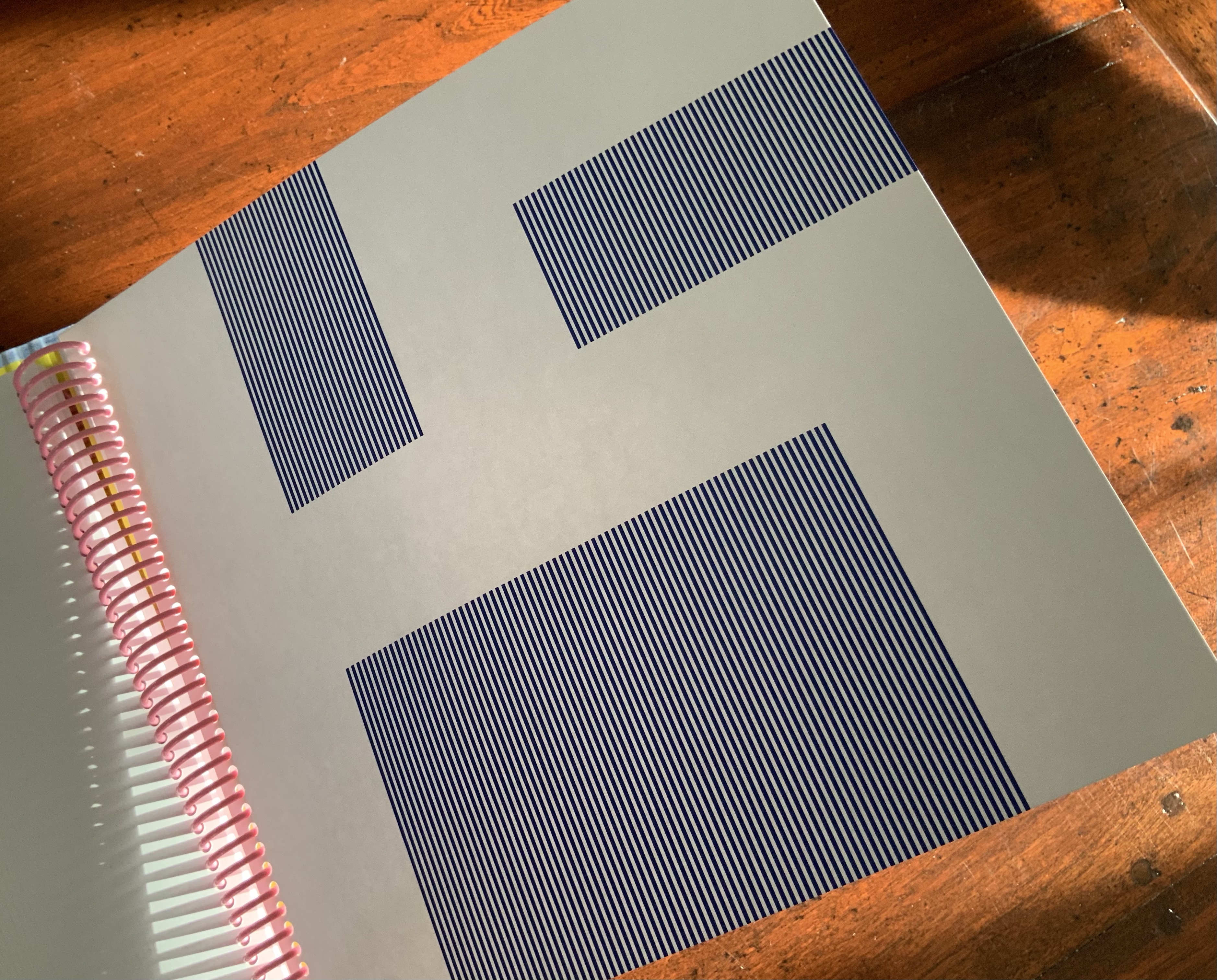 Discerning the letters in LINE UP feels sometimes like squinting one’s way through an optical illusion. The eye is bewitched by a color-shifting, almost stroboscopic effect created by four squares of embossed lines printed from the reverse side, always in the same position. Della Olga credits Christophe Boutin (Three Star Press) with introducing this effect.
