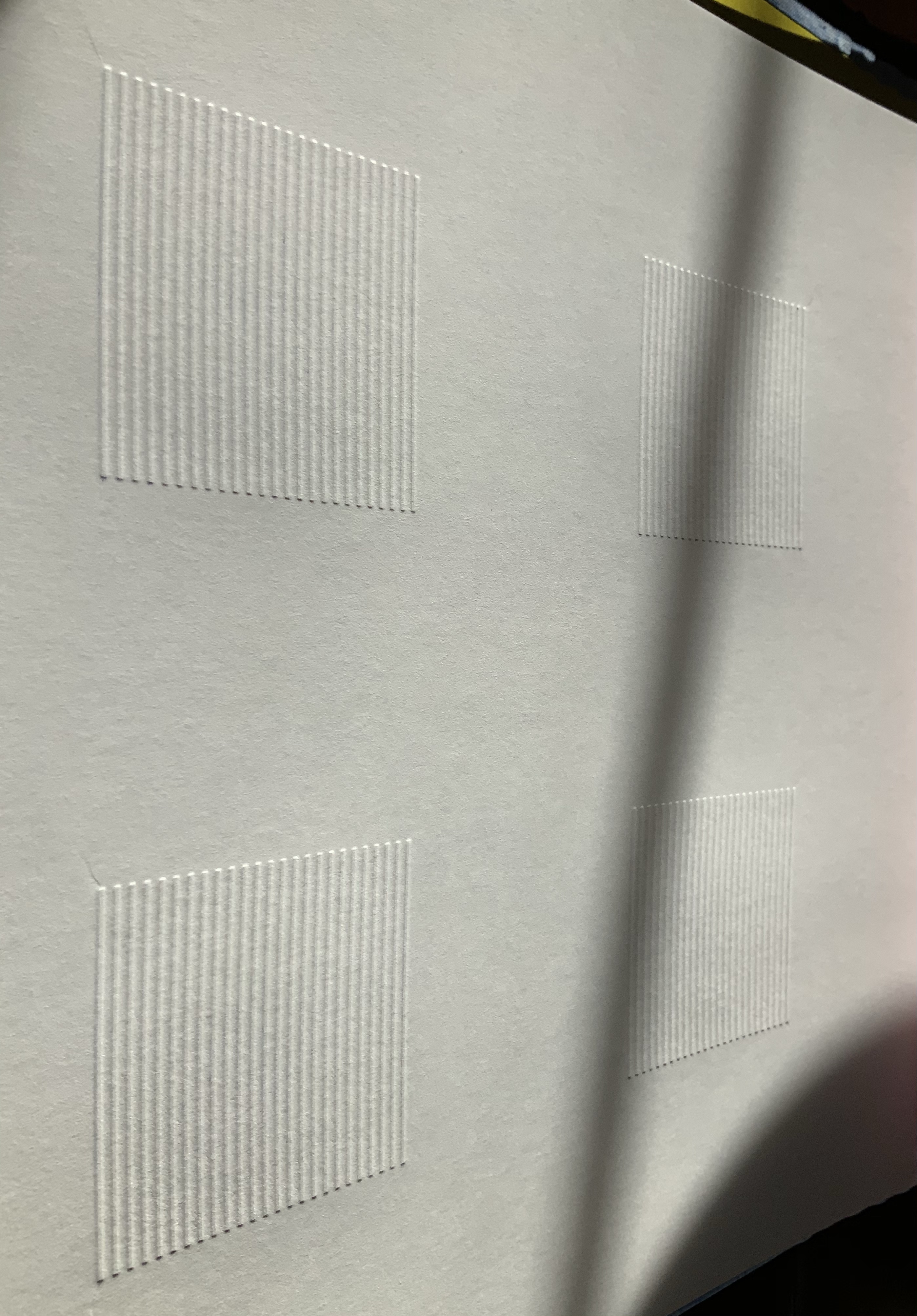 Left: The four embossed squares seen from the verso. Right: The color shift between the embossed and flat squares.