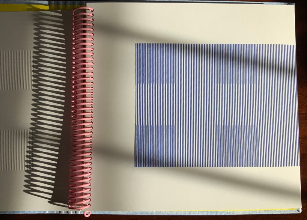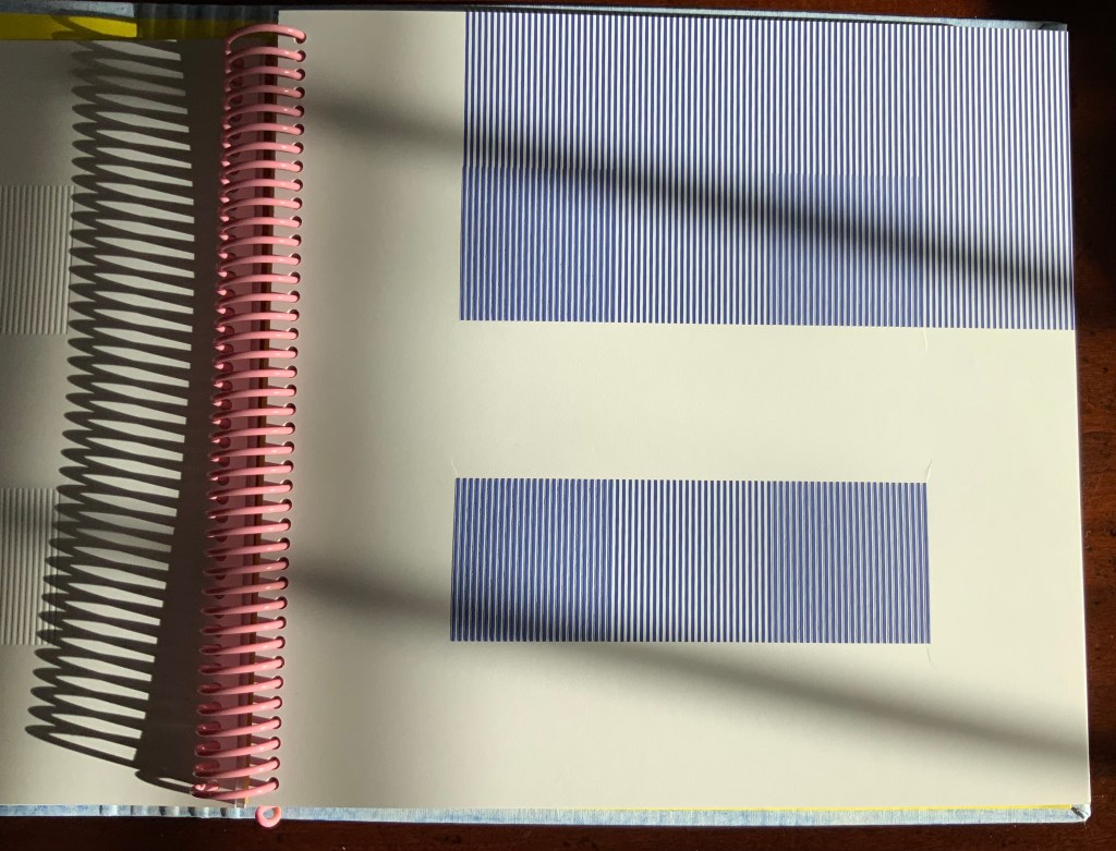 Cloth on board with spiral binding of 28 card folios. H270 x W290 mm (closed). Edition of twenty-six, of which this is #8. Acquired from Three Star Books, 4 November 2020. Photo: Books On Books Collection, displayed with the artist’s permission.