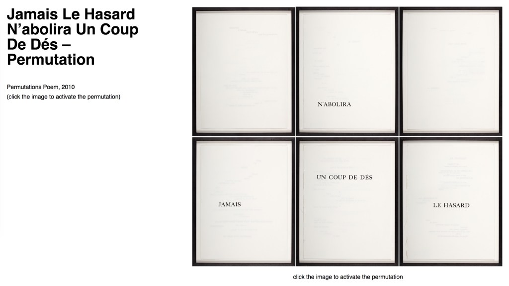 A year later came this rendition: Jamais Le Hasard N’abolira Un Coup De Dés – Permutation (2010). Although the link goes to an online presentation, the work is analogue and unique. In correspondence (9 December 2020), Della Olga writes, “I took apart the book the Gallimard edition as a whole, without the paratext. I folded the double pages and deleted with white paint the part of the poem that appear.” A close look at the framed pages reveals the faint shadows of the painted-over text. On the wall, the permutation arises in the changeable order of hanging, which the online algorithm permits the viewer to perform.