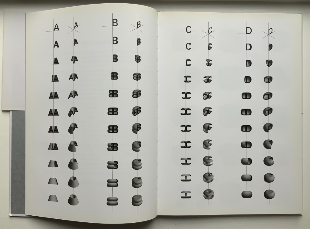 This double-page spread displays the manipulation of the alphabet’s first four letters around their axes at two different angles to render their 3D shapes.