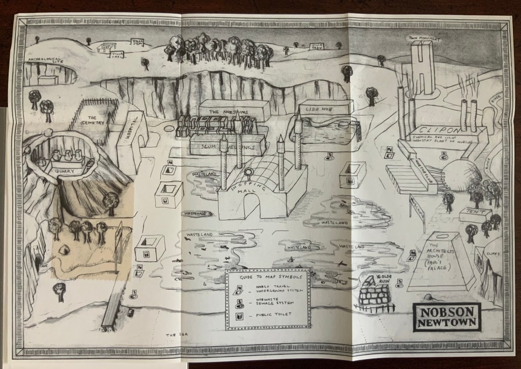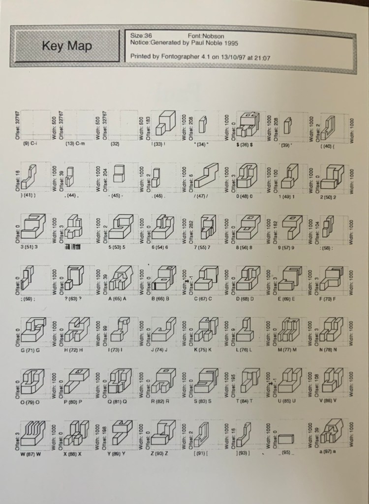 In addition to a map of the town and the environs, Nobson Newtown includes a key to its alphabetical and typographic building blocks, which are, of course, rendered in Nobfont. Easy legibility is not a characteristic.