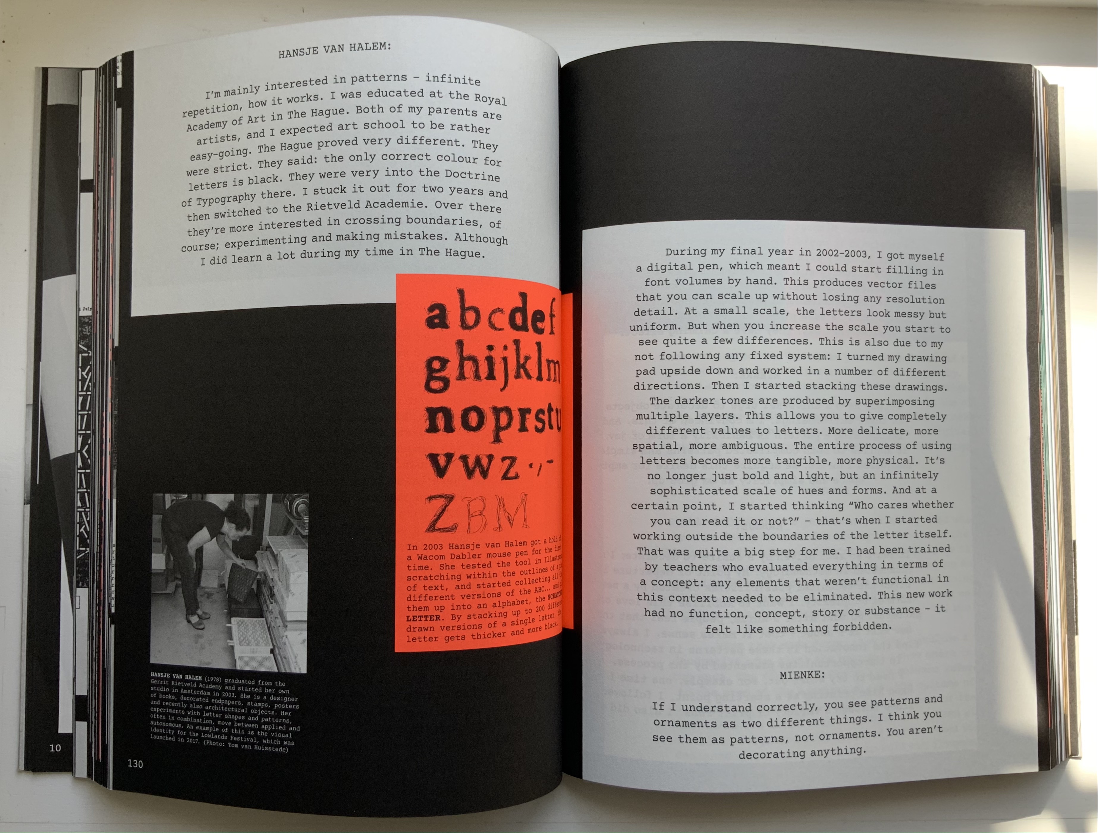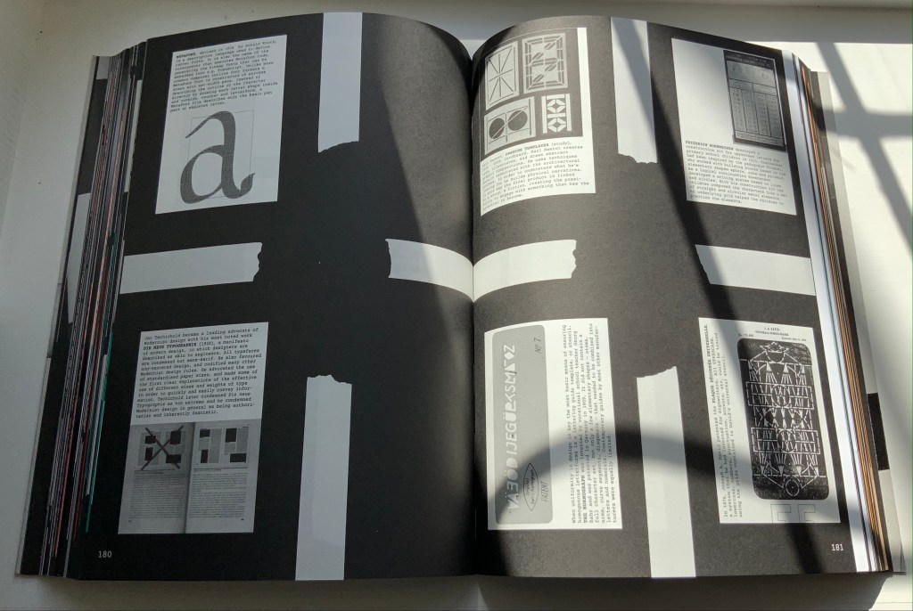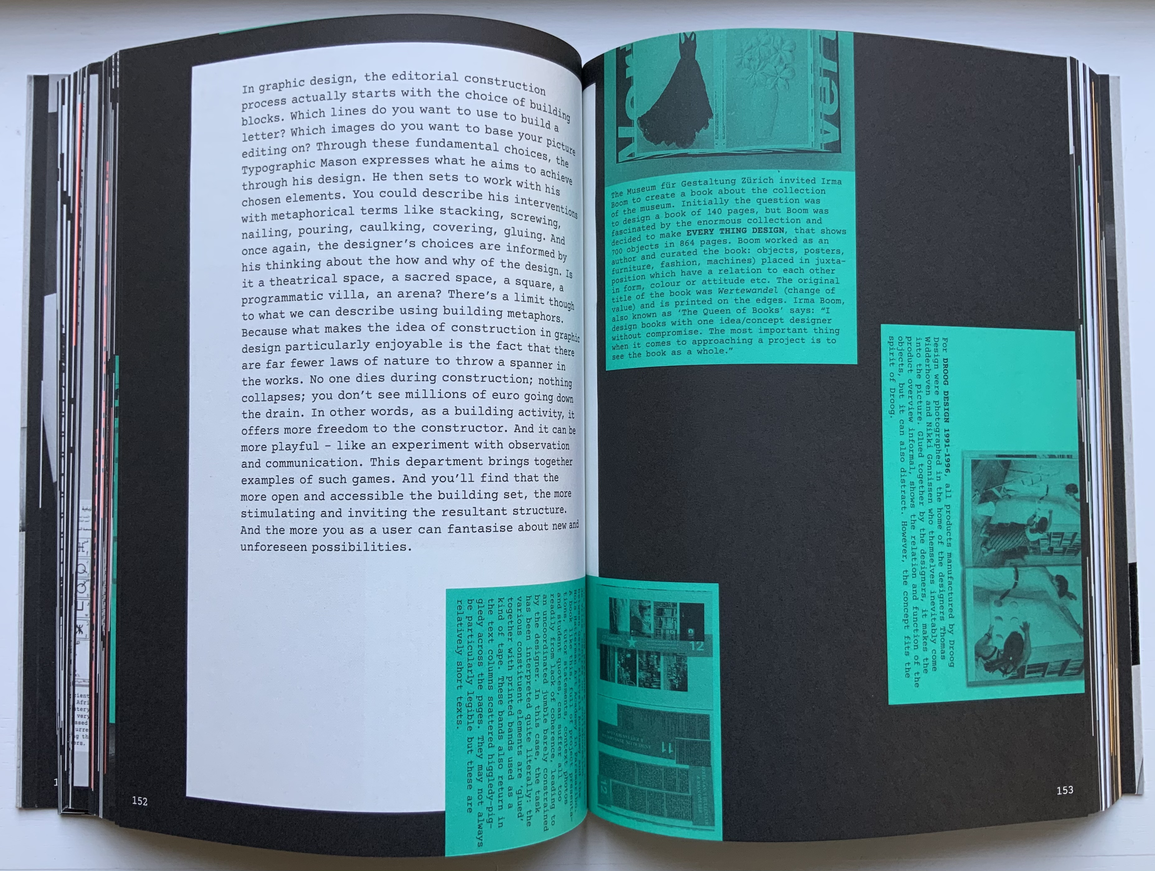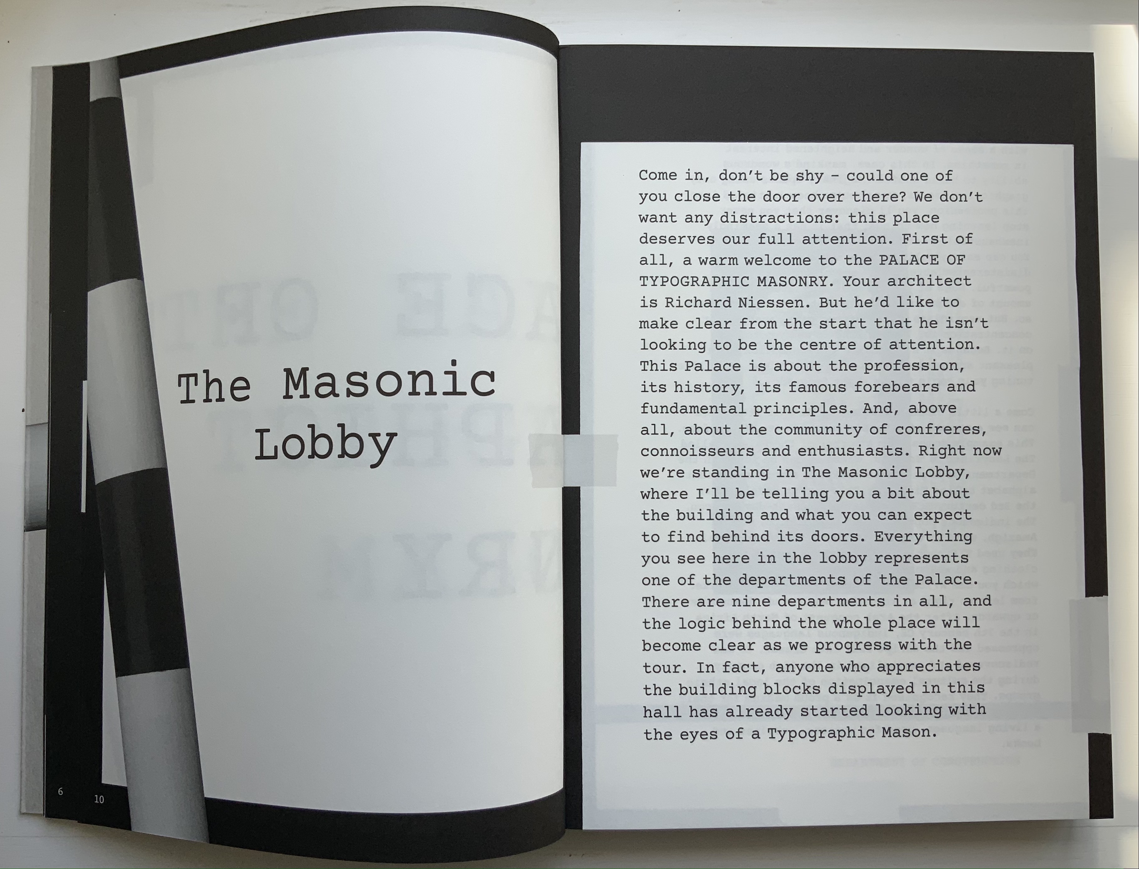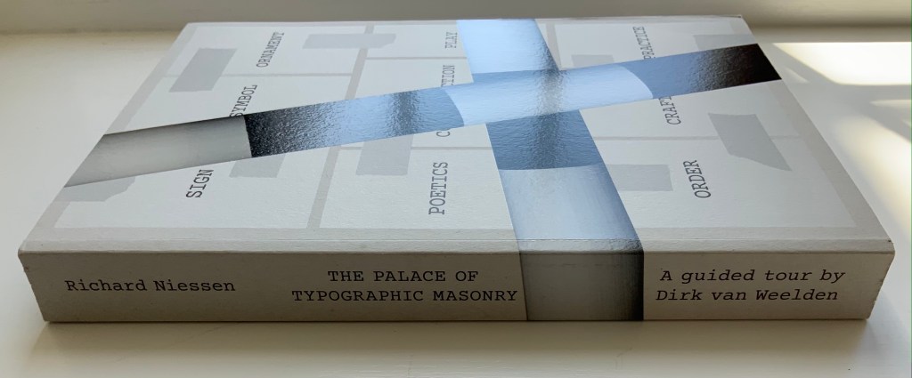 Website, perforated poster, exhibition and paperback, The Palace of Typographic Masonry occupies its place in the Books On Books Collection unlike any other work. The book itself is a shape shifter. Its size competes with those of museum catalogues. In fact, the Palace of Typographic Masonry is like a museum, so much so that it requires a tour guide, which is one shape the book takes. With its nine departments (Sign, Symbol, Ornament, Construction, Poetics, Play, Order, Craft and Practice), it is like a working museum of graphic design, and Dirk van Weelden, our tour guide, often hands us off to departmental “staff” for a lecture or overheard interview.