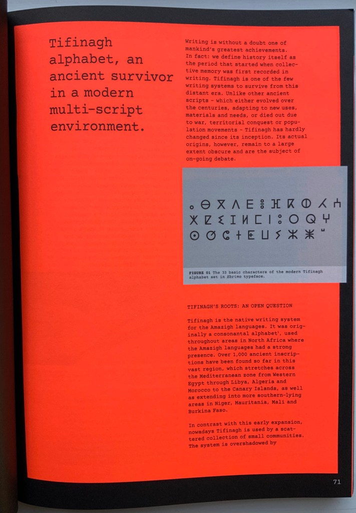 For example, the palace’s labyrinth of scripts — also reproduced separately on the perforated poster — is followed by a discussion of the revival of Tifinagh, the nearly extinct written language of the Tuareg in the Maghreb. The labyrinth presents thirty-six scripts in those varying orientations mentioned above and is wonderful in its breadth but also tiring — especially from the effort required by the font size and orientations. The story of Tifinagh’s revival and integration through typeface design is inspiring, usefully makes the point about the cultural conventionality of alphabets and more, but also makes for a long trek before our guide moves us along into the next department.