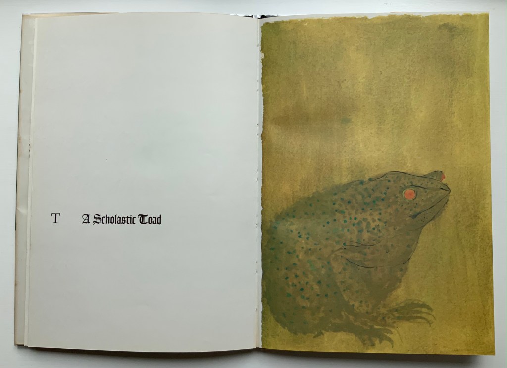 Baskin’s artistry in this book not only resides in the pictures. The layout and handling of Bembo vary — sometimes dramatically, sometimes subtly — in just the right way, be it in the use of uppercase, lowercase, roman, italic, bold, size, shading or the sudden introduction of Goudy Text.