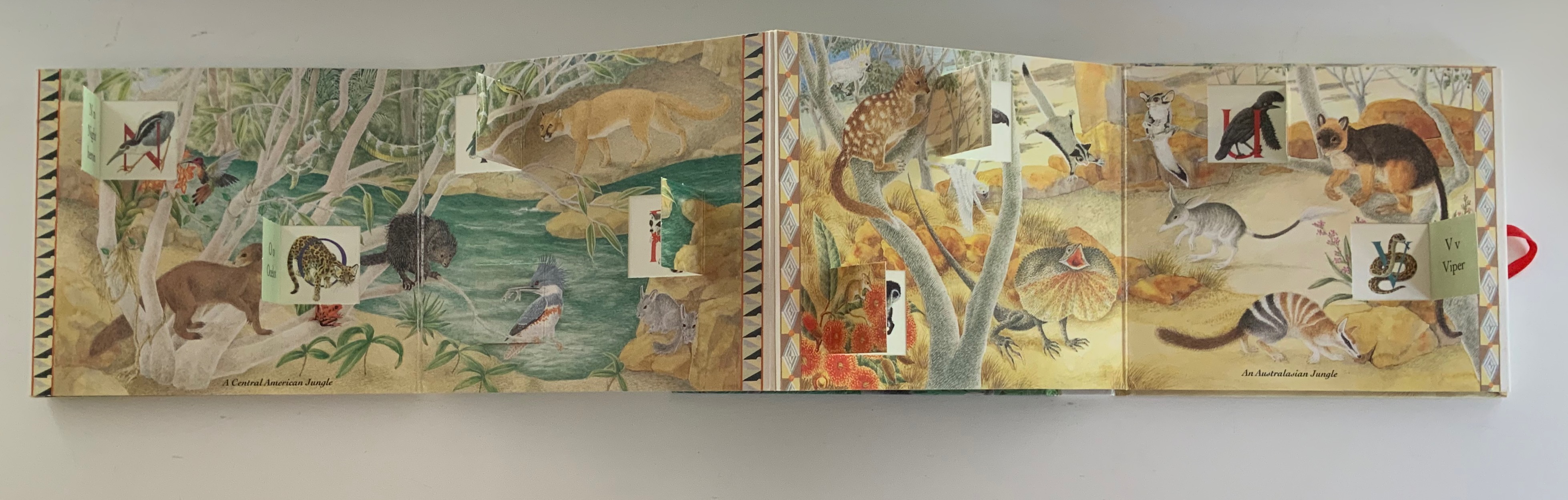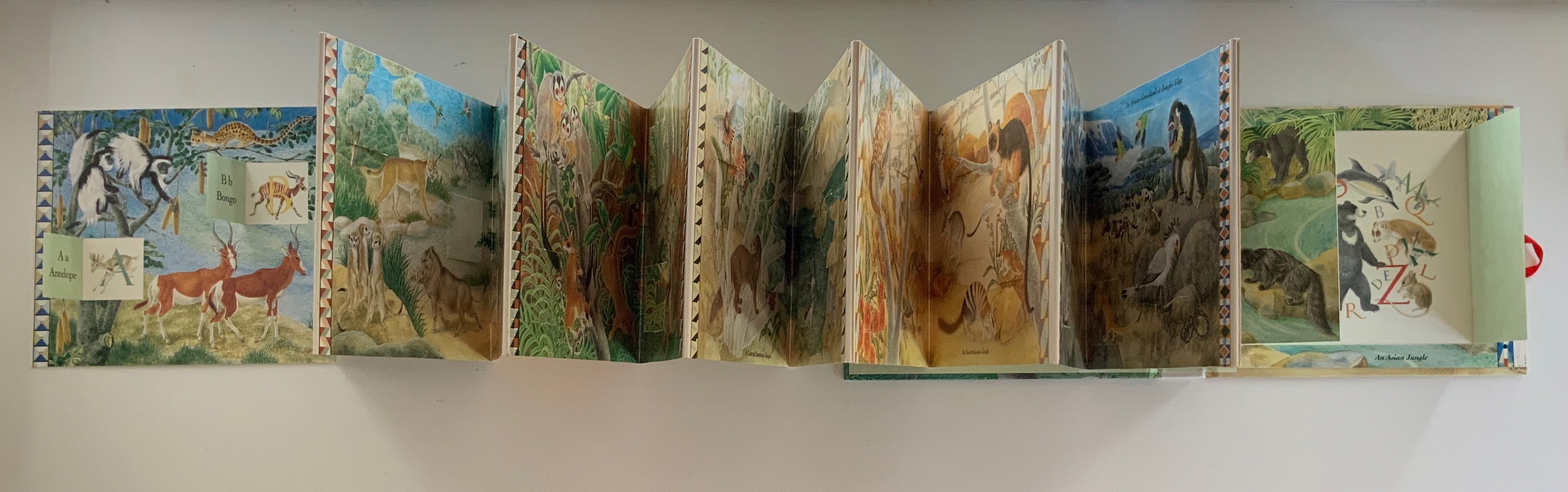 Ribbon-tied, paper on boards case, inclosing lift-the-flap double-sided accordion book. Closed: H172 x W202 x D28 mm. Open: W2730 mm, 27 panels, including title panel. Acquired from Robert Gavora, Fine and Rare Books, 7 September 2021.