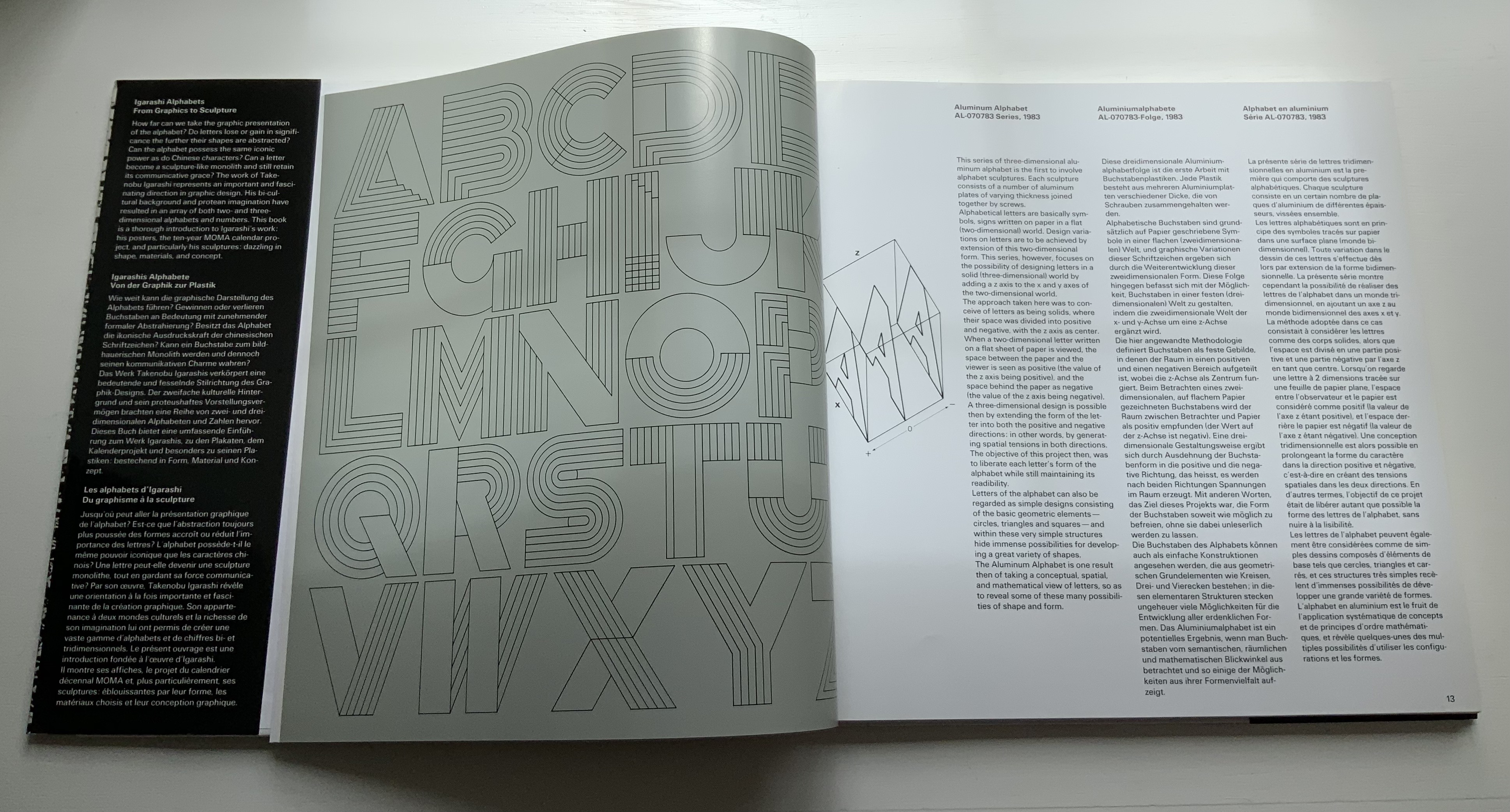 In noting in their 1995 facsimile of Johann David Steingruber’s Architectonisches Alphabeth that three-dimensional alphabet design inevitably reflects its typographic and architectural milieu, Joseph Kiermeier-Debre and Fritz Franz Vogel single out Igarishi’s work in aluminum, concrete, wood and plastic as a perfect 20th century example. Unlike that of his European predecessors, Igarashi’s milieu has been both Eastern and Western. It shows not only in his design, surfaces and choice of material but also in the global attention paid to his work. The briefest search online yields sources in Poland, the Czech Republic, Spain, Singapore and many others besides those expected in the US and Japan.