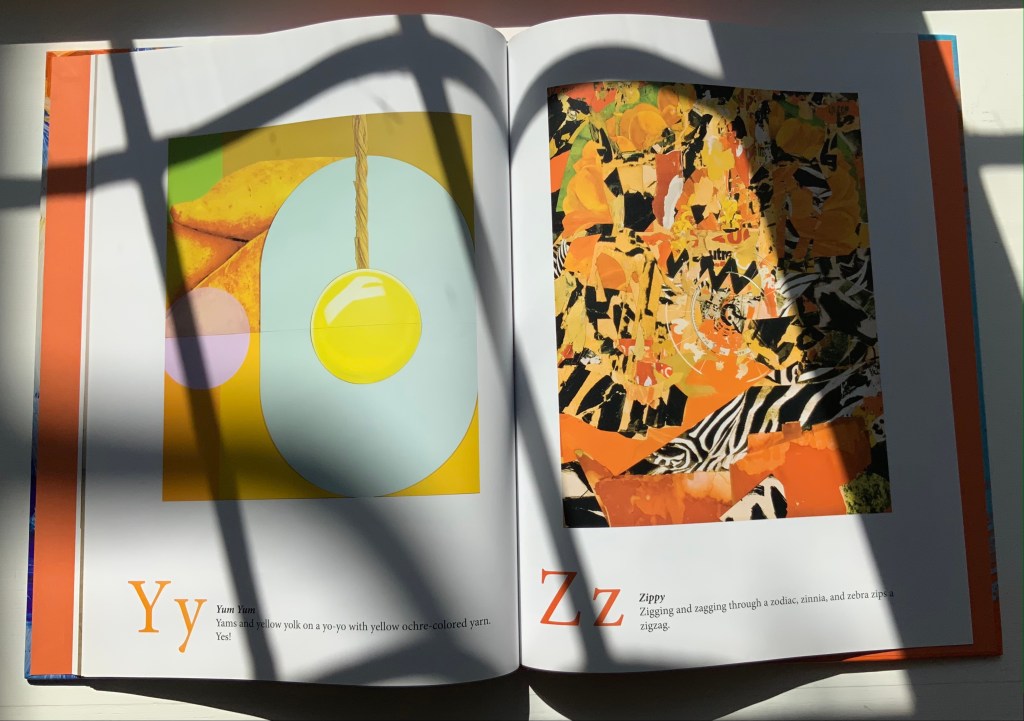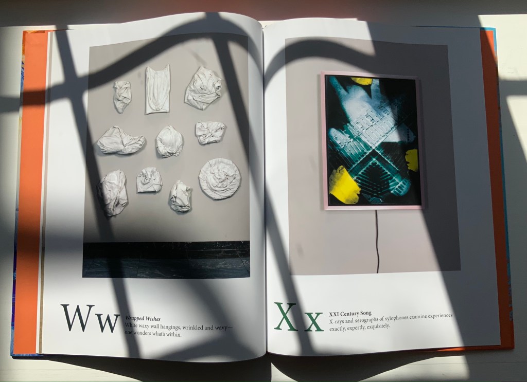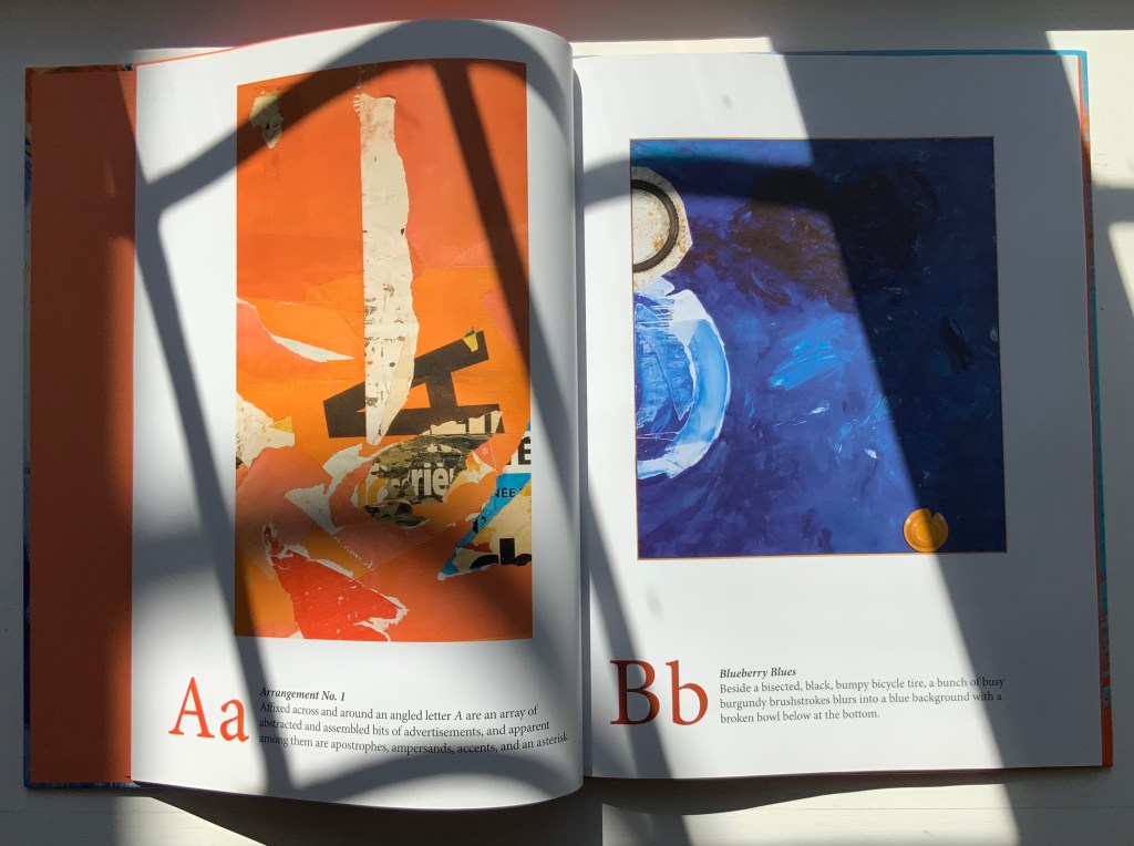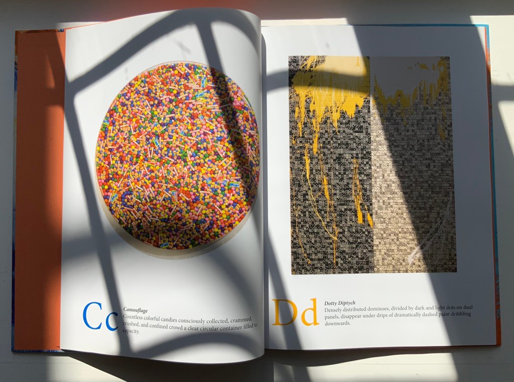 A is for Art: An Abstract Alphabet has the feel of Moussorgski’s Pictures at an Exhibition. Although each movement “depicts” a different painting, the composer’s style comes through; although each letter alludes to different artists (for example, but not complete for each letter: A – François Dufrêne, Kurt Schwitters; B- Jim Dine, Willem de Kooning , C- Arman, Félix Gonzáles-Torres; D- Udomsak Krisanamis; W- Man Ray; X- Robert Rauschenberg; Y- Tom Wesselman, Robert Indiana; Z- Beatrice Mandelman, Mimmo Rotella), the artist’s vision comes through. To pull that off requires considerable versatility. Several of the images in A is for Art derive from sculptures and large-scale installations. Take a look, too, at his triptych of mosaics in the City Center Public Library of Lenexa, Kansas.