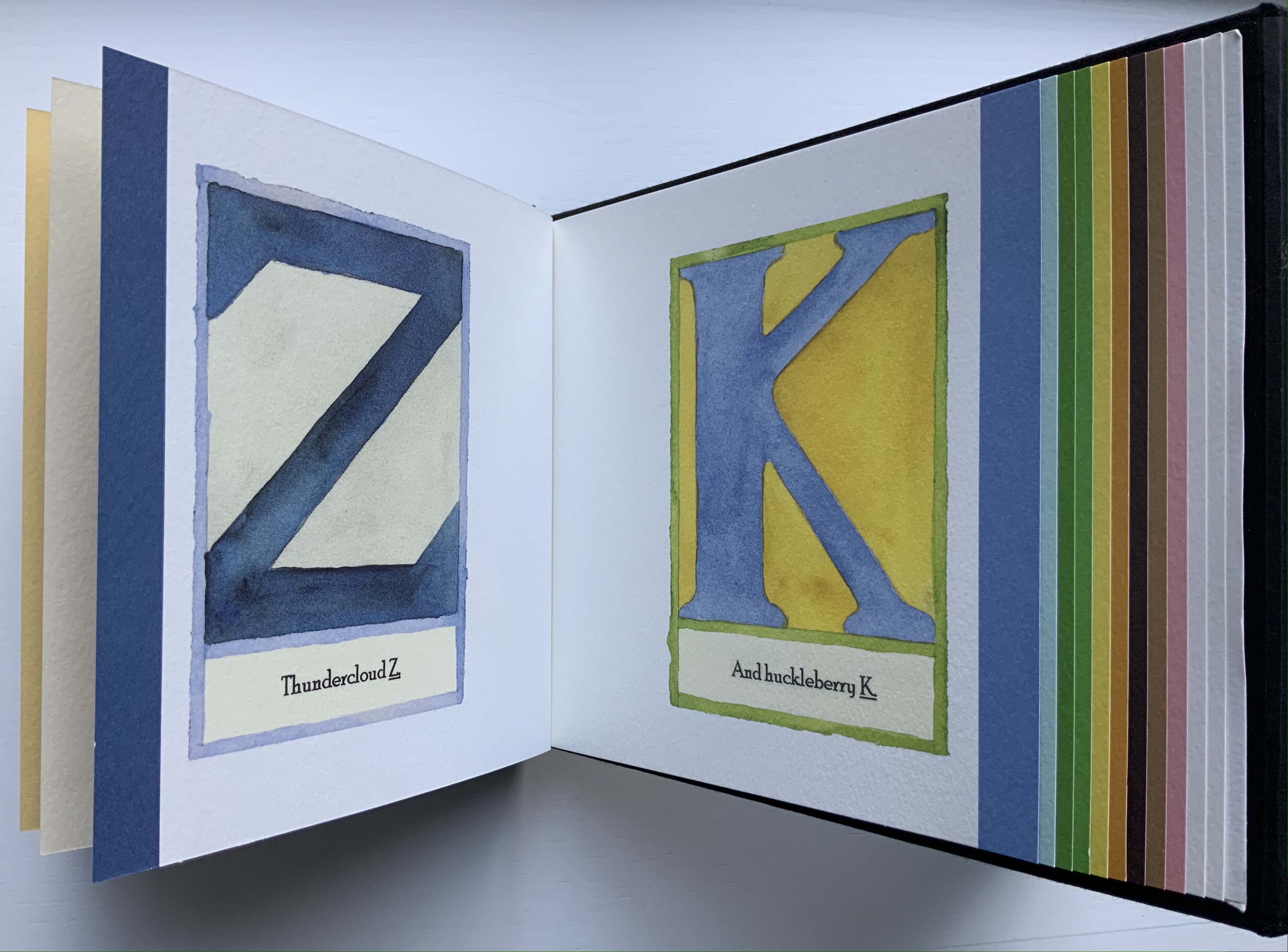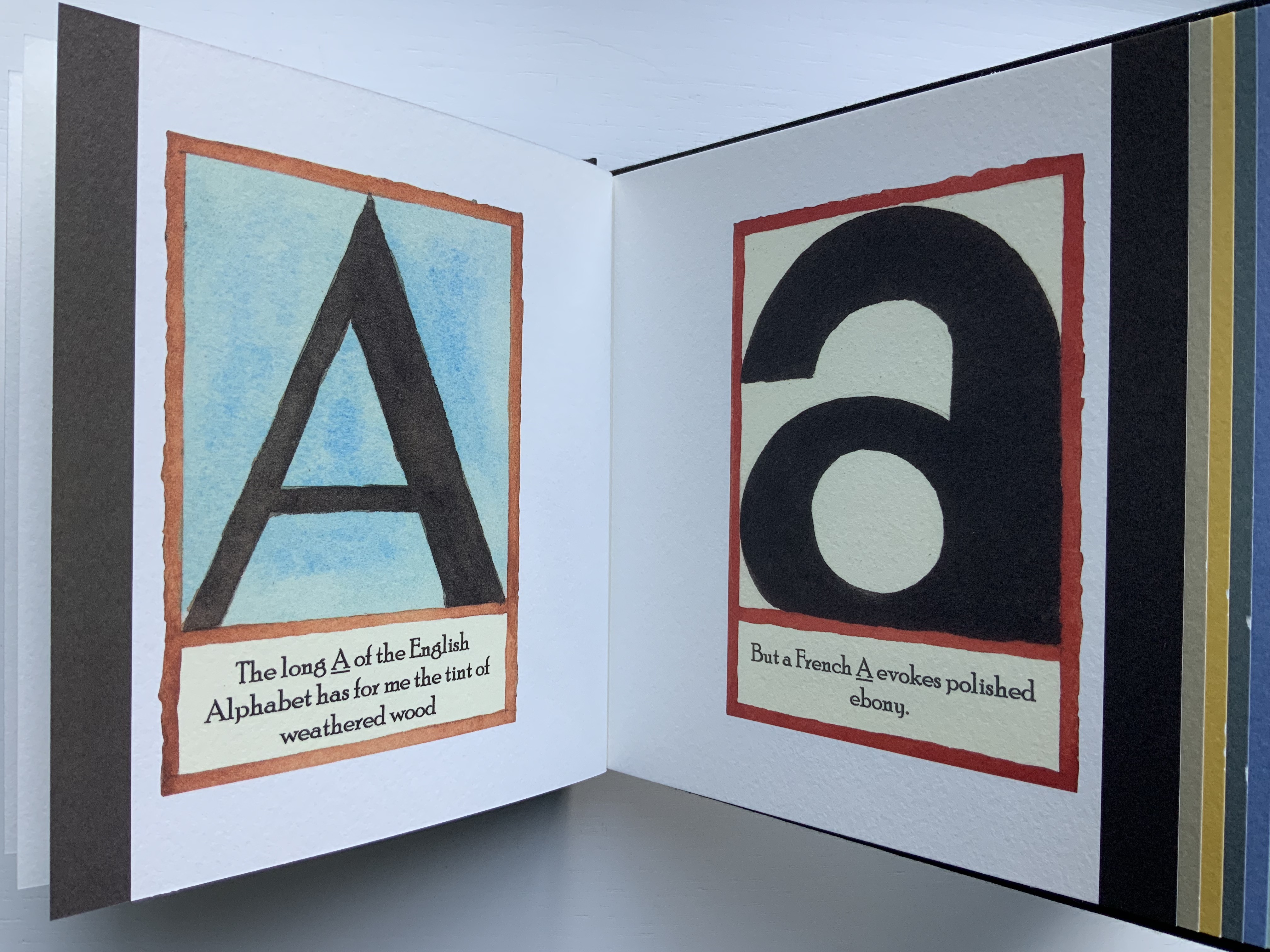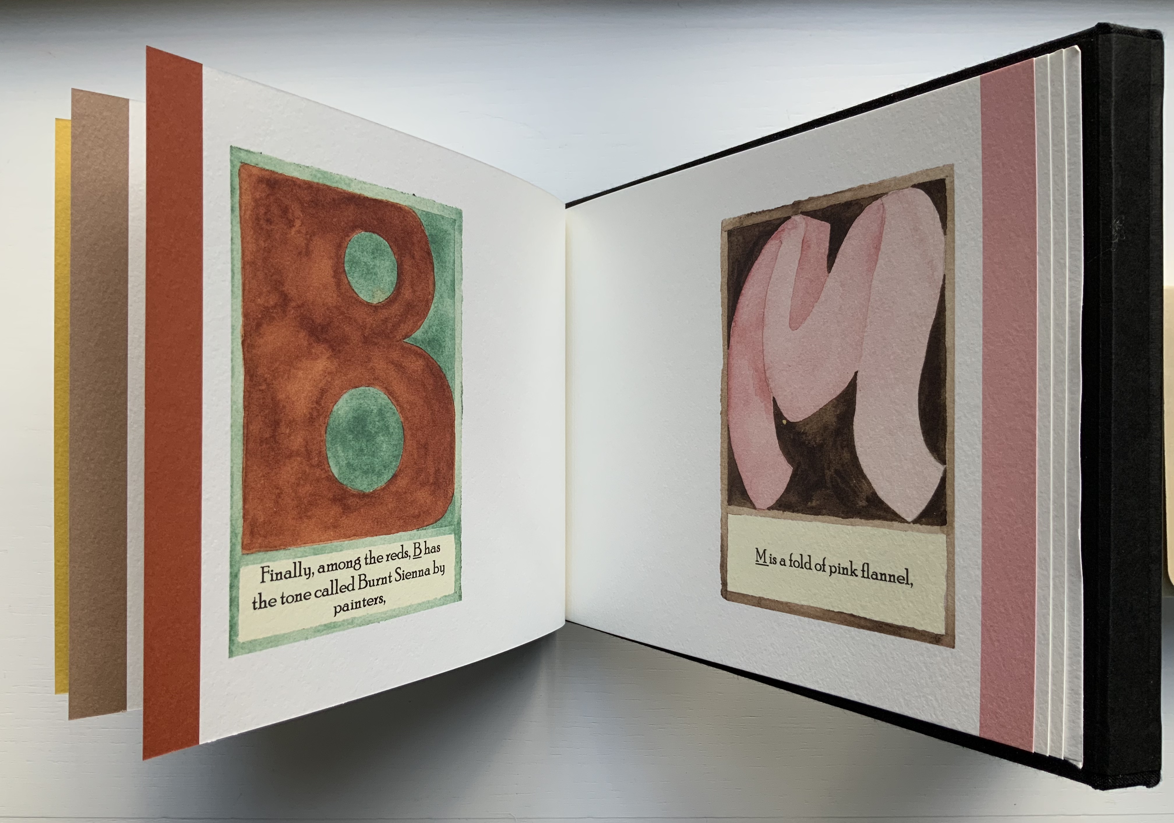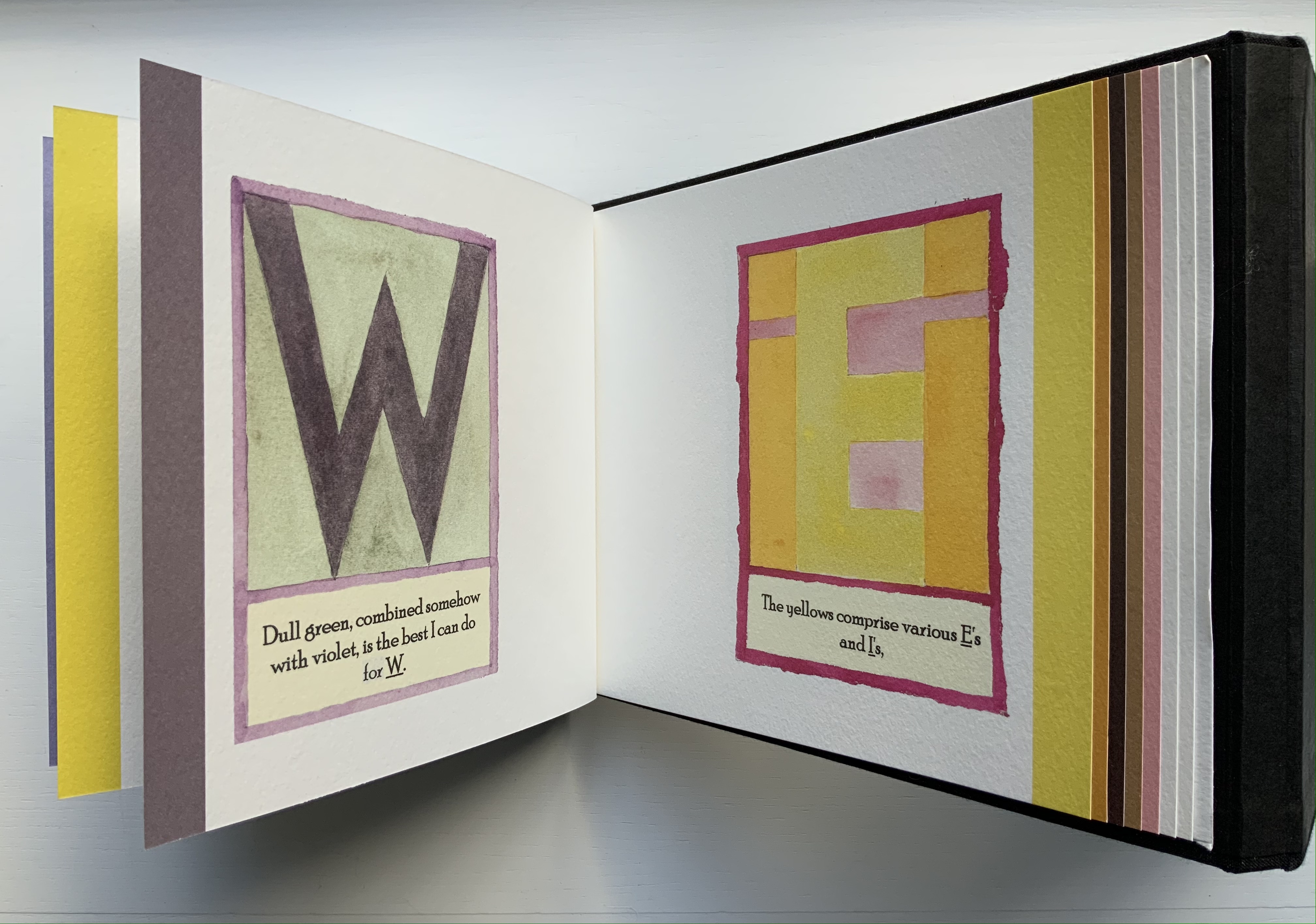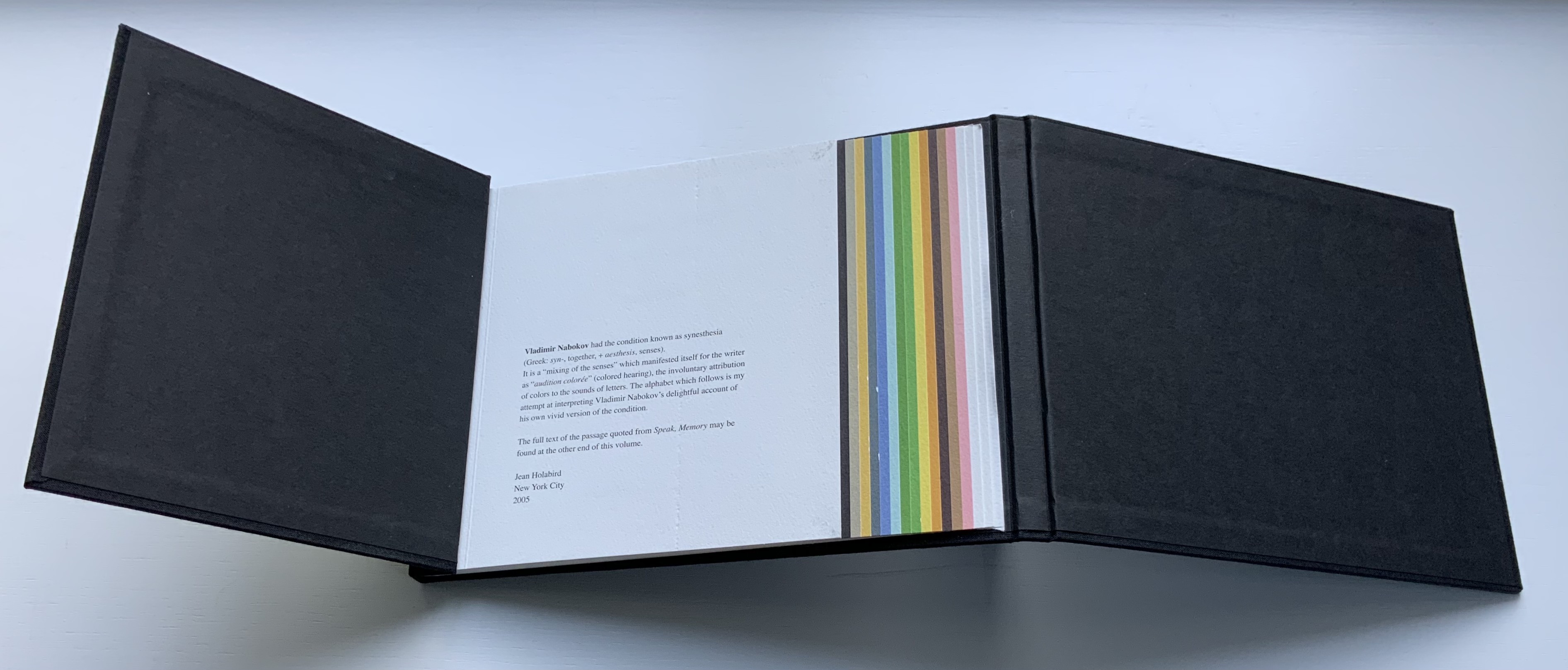 As puzzling as the phenomenon of synesthesia is, Holabird’s depictions and the book’s architecture are more engaging in their own right. The lapping pages and binding make this work awkward to handle, which might be thought of as a complement to the book’s non-alphabetical and non-spectral order of letters and colors. It is a warm complement to Le Cadratin’s cool rendition of Rimbaud’s sonnet “Les Voyelles“.