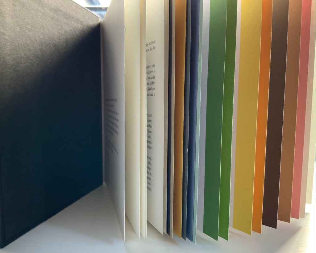 Black cloth boards, silver lettering to spine, blind stamped lettering to front board, illustrated title label to inner board; internally bound in the Japanese style with opening overlapping boards and staggered colored pages. H175 W235 mm, 40 pages. Acquired from Klondyke (Almere NL), 11 November 2021.