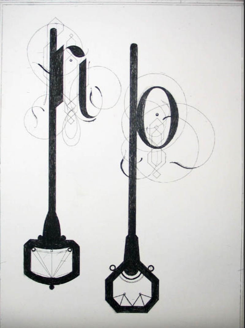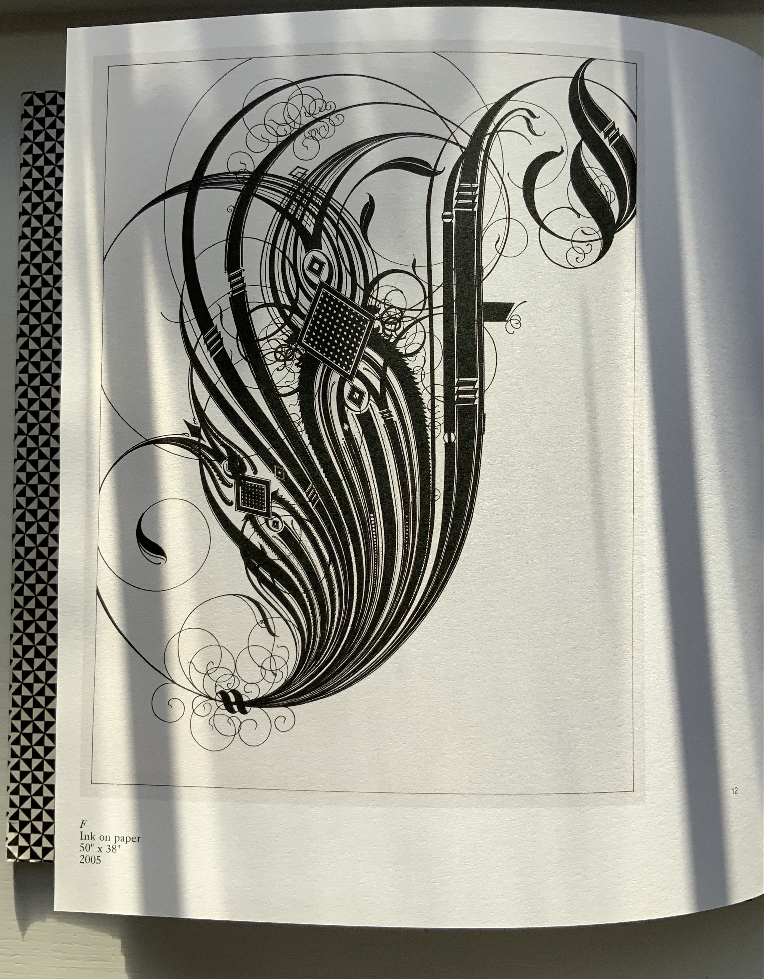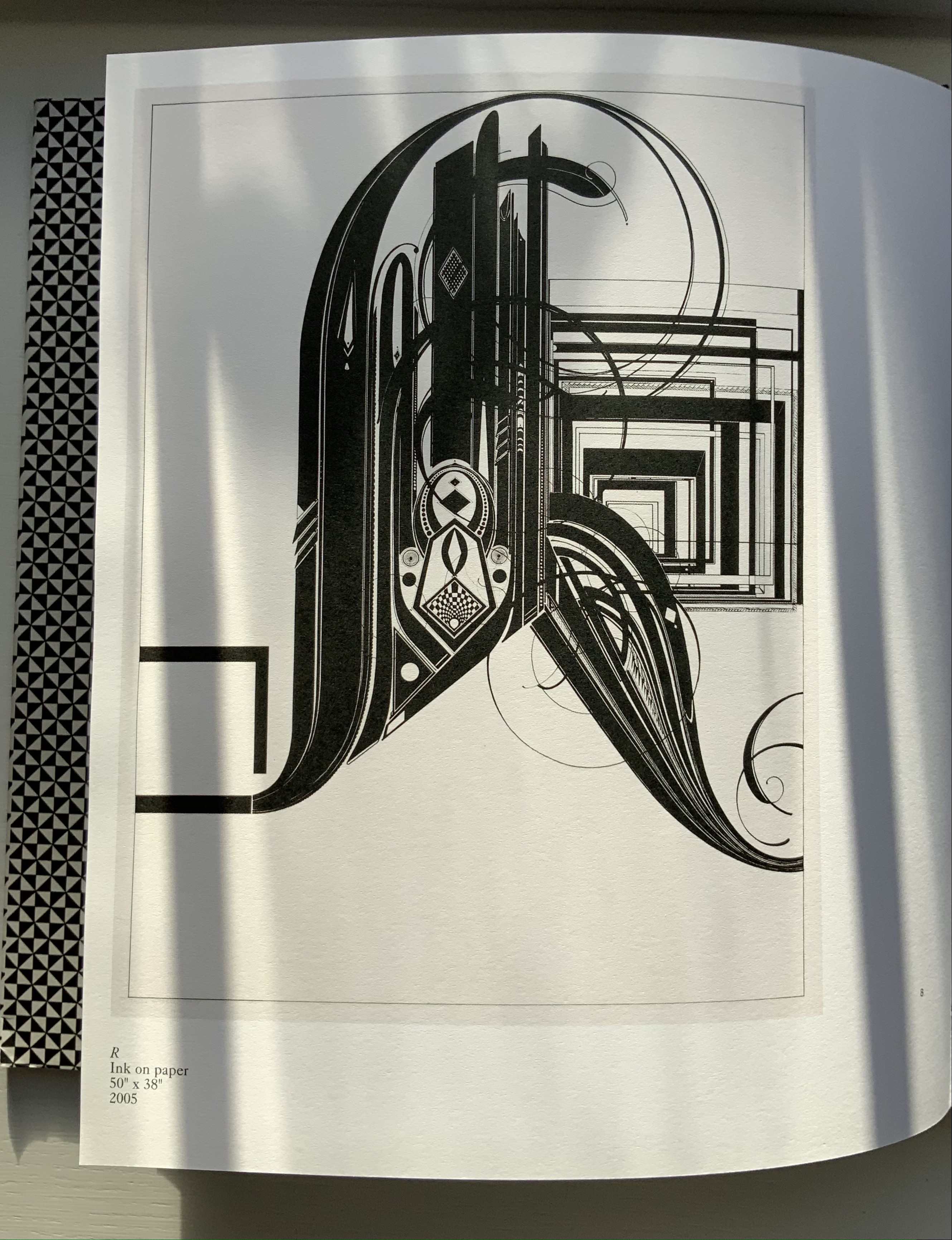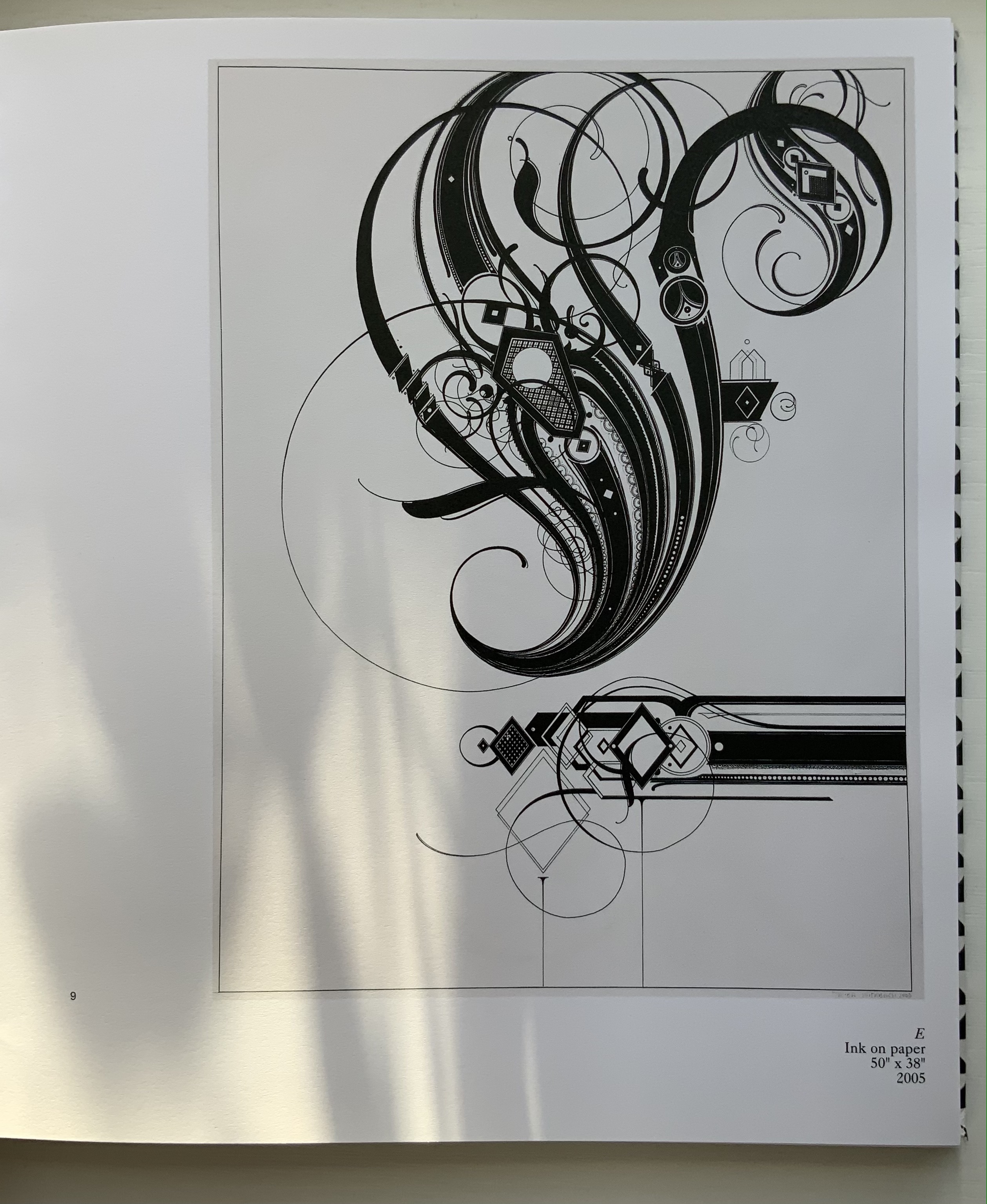 These pieces are an exaggeration of the slowness of hand-drawing letters. Taking several weeks to draw, each one is a meditation on the form of a single letter on its own, isolated from meaning or context. … These specific letters are inspired by a German alphabet designed by Paulus Franck in 1601. In the tradition of illuminated manuscripts, such an ornamental font treats each letter both as an object of worship and as a means of expressing worship towards what is written. But … they are also an expression of the idea that celebration — in this case, through embellishment — can lead to obliteration. They are meant to teeter on the edge of decipherability, oscillating between legibility and abstraction.