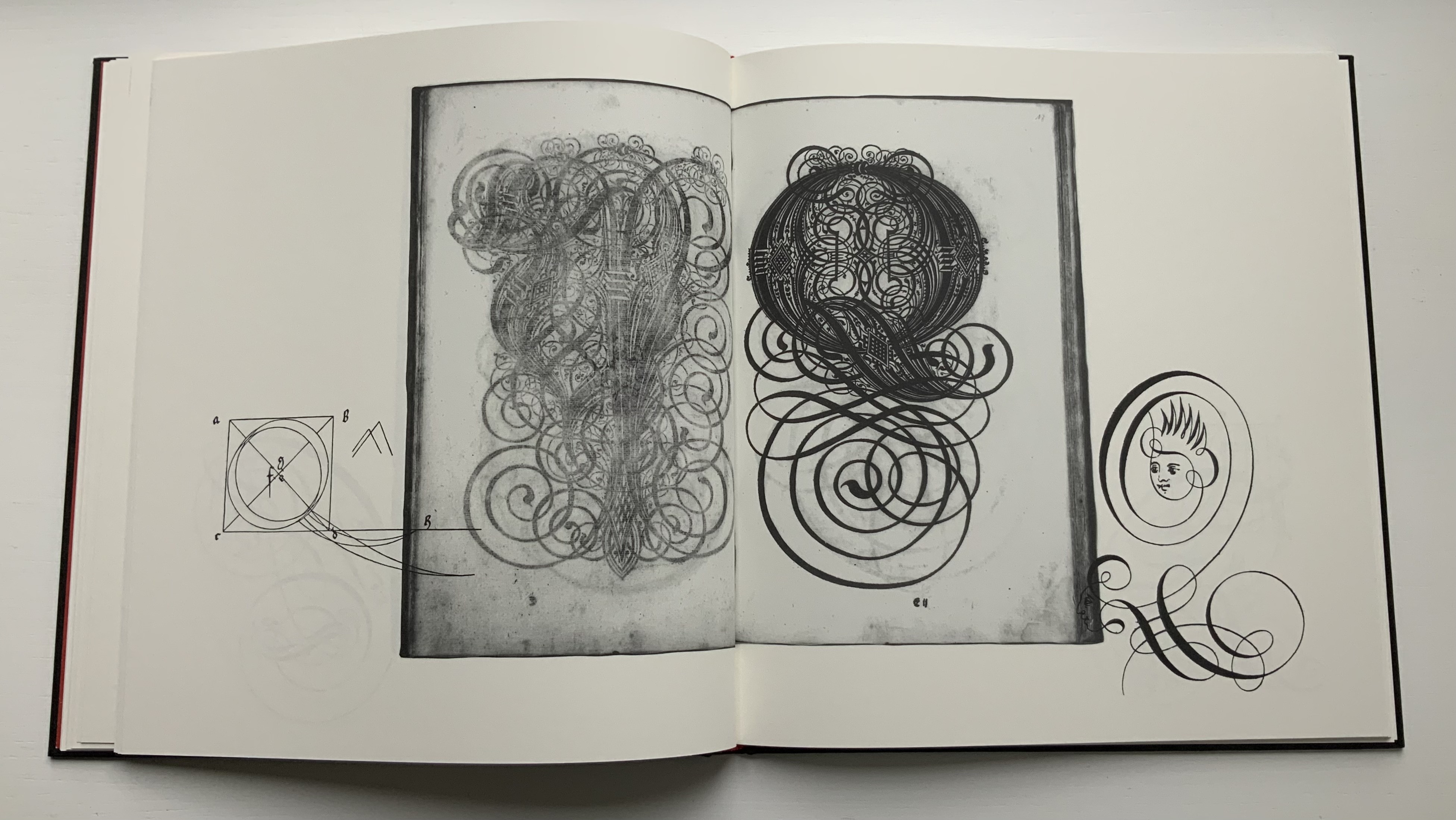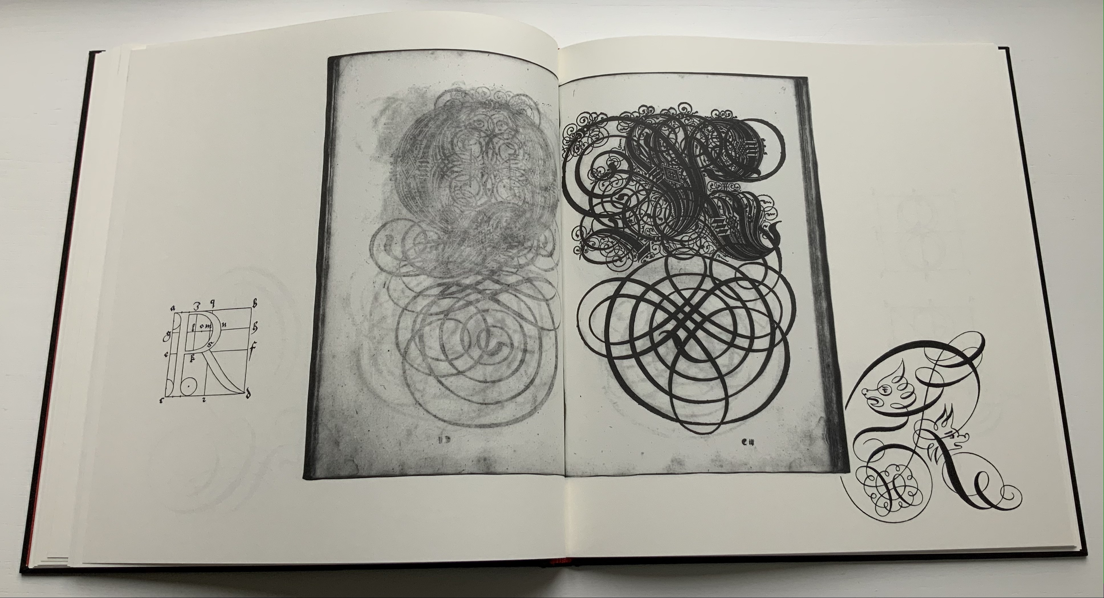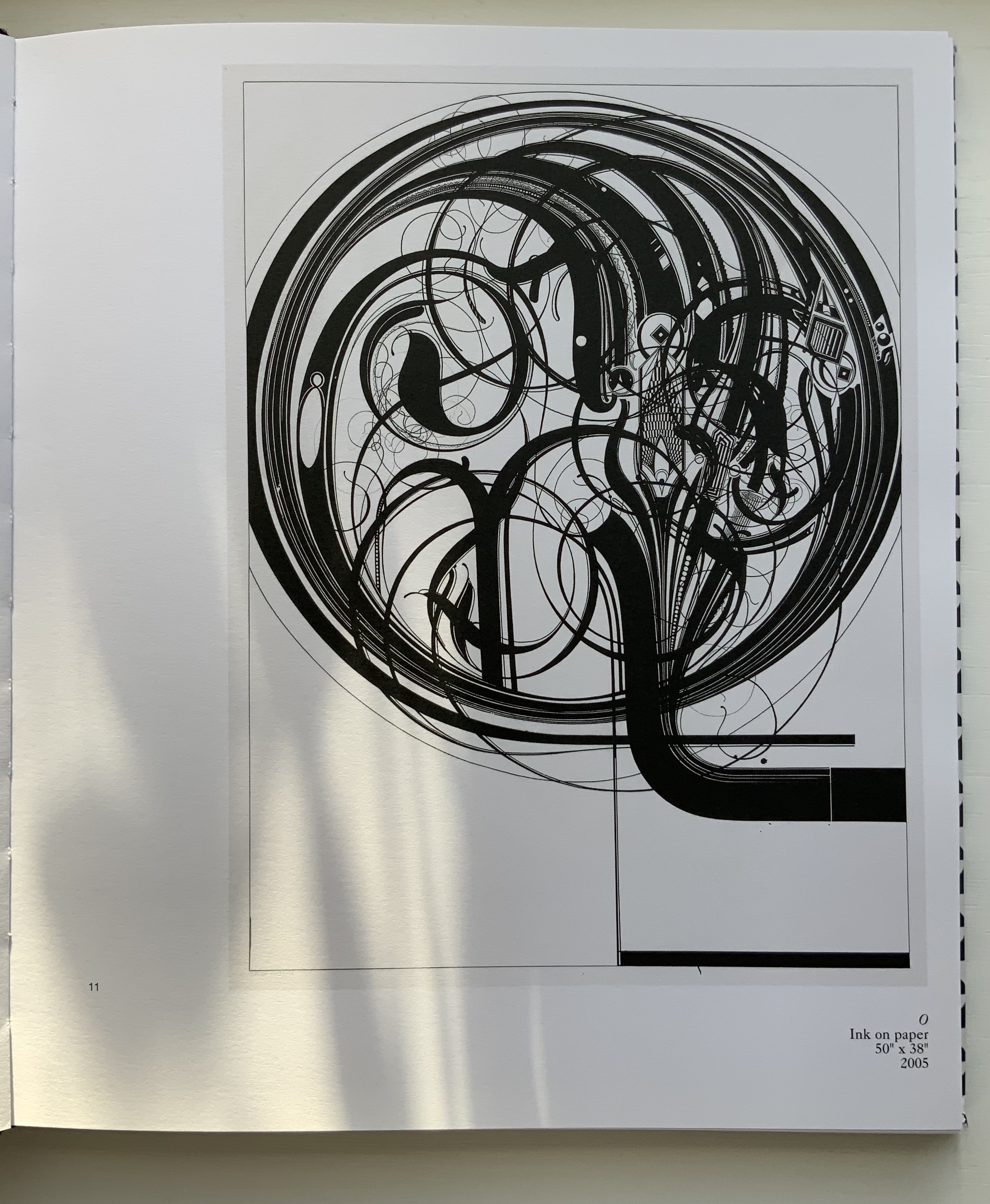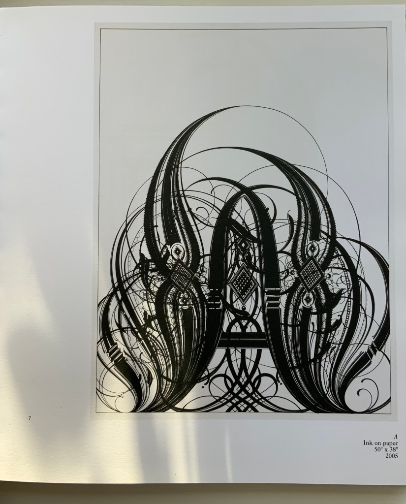 These pieces are an exaggeration of the slowness of hand-drawing letters. Taking several weeks to draw, each one is a meditation on the form of a single letter on its own, isolated from meaning or context. … These specific letters are inspired by a German alphabet designed by Paulus Franck in 1601. In the tradition of illuminated manuscripts, such an ornamental font treats each letter both as an object of worship and as a means of expressing worship towards what is written. But … they are also an expression of the idea that celebration — in this case, through embellishment — can lead to obliteration. They are meant to teeter on the edge of decipherability, oscillating between legibility and abstraction.
