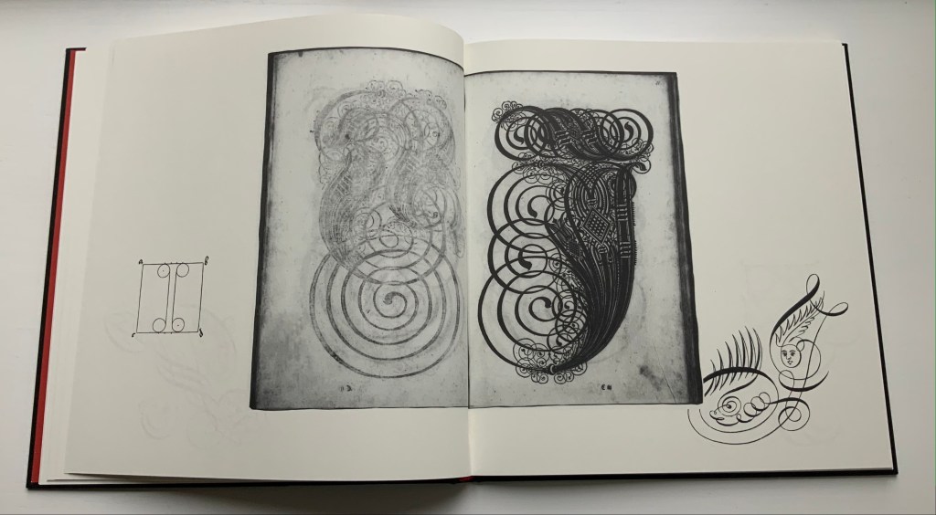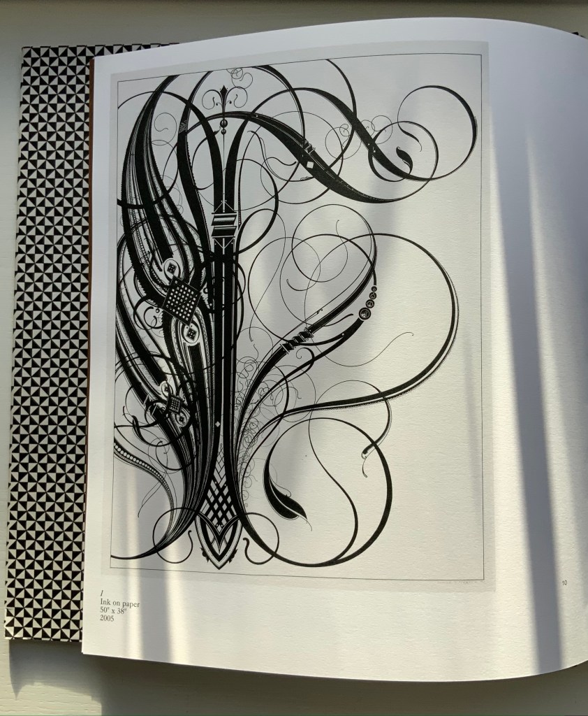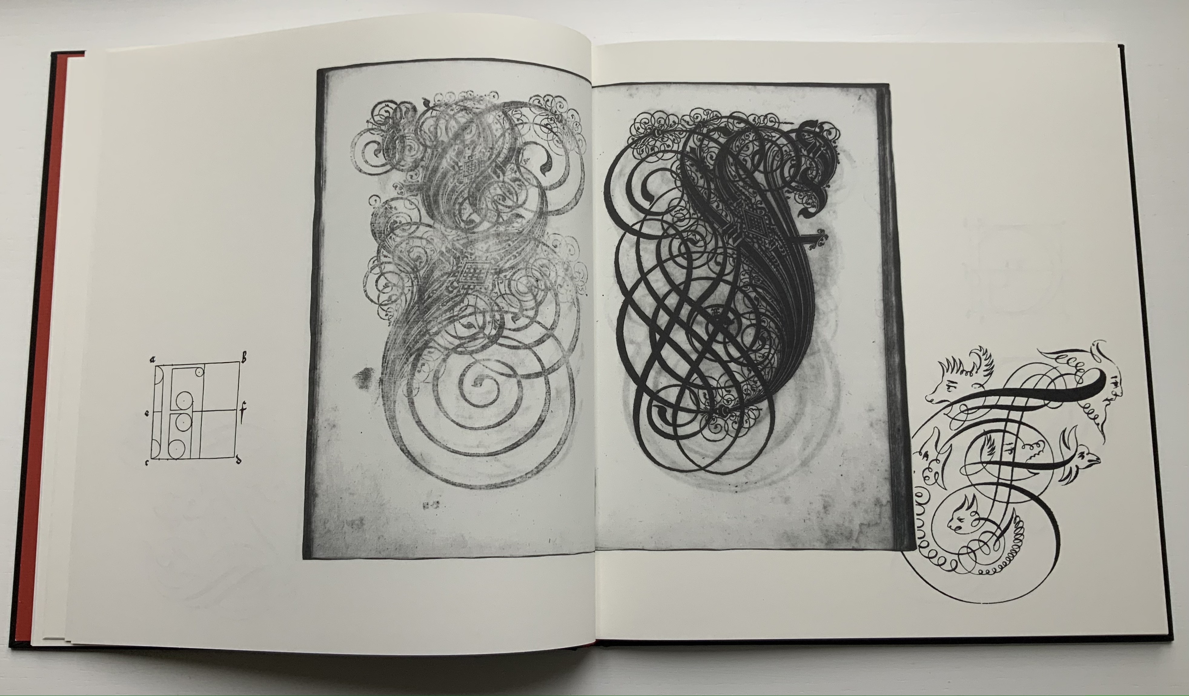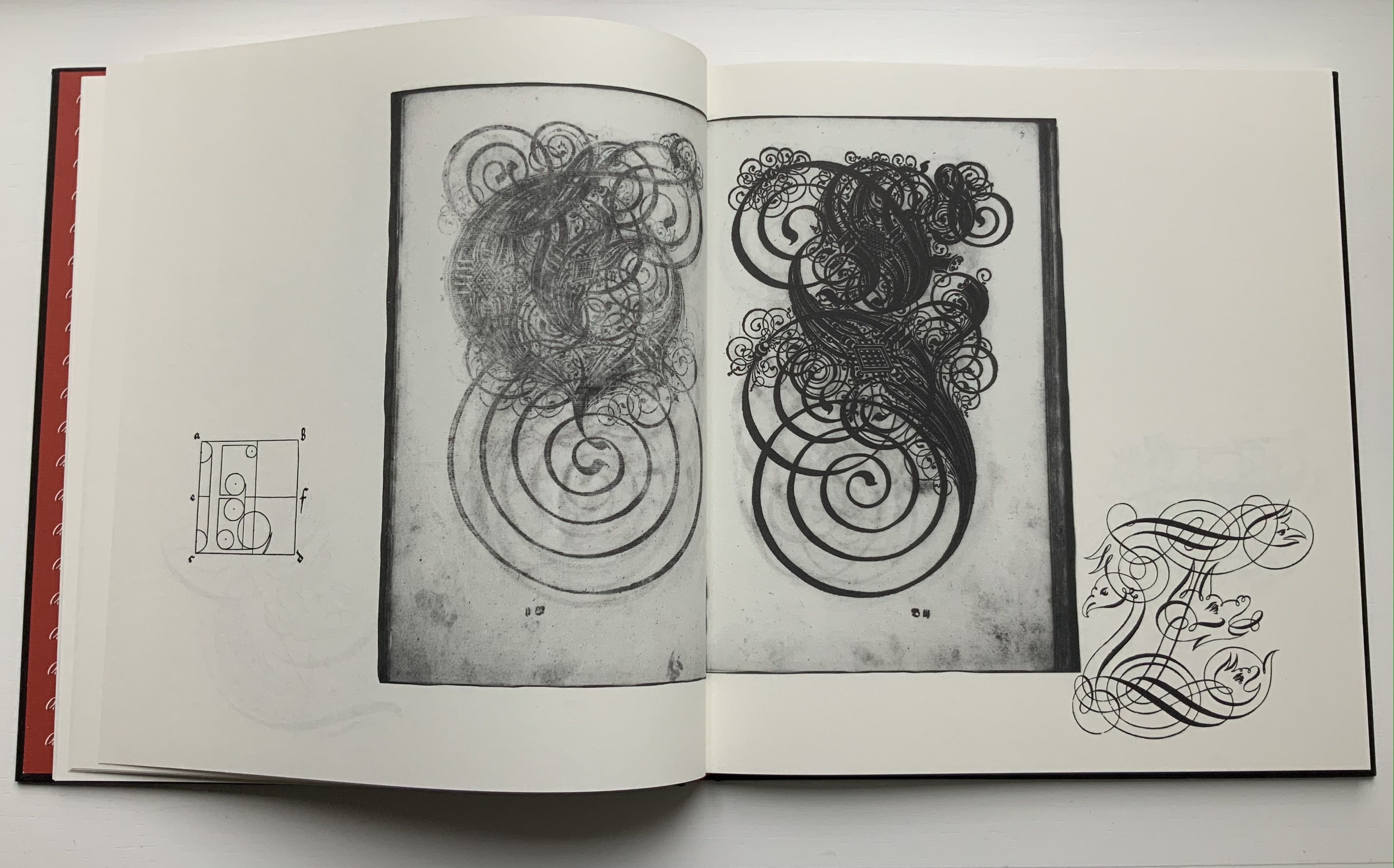 These pieces are an exaggeration of the slowness of hand-drawing letters. Taking several weeks to draw, each one is a meditation on the form of a single letter on its own, isolated from meaning or context. … These specific letters are inspired by a German alphabet designed by Paulus Franck in 1601. In the tradition of illuminated manuscripts, such an ornamental font treats each letter both as an object of worship and as a means of expressing worship towards what is written. But … they are also an expression of the idea that celebration — in this case, through embellishment — can lead to obliteration. They are meant to teeter on the edge of decipherability, oscillating between legibility and abstraction.
