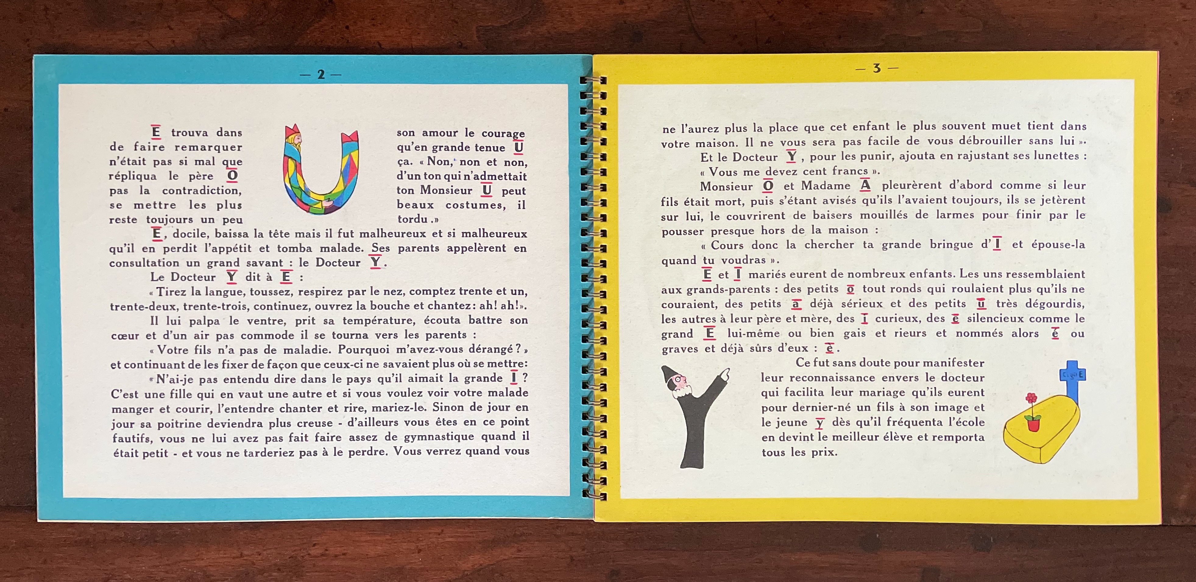 Il était une fois presents the mutual discovery of the medieval/Renaissance country of Vowels and the isle of Consonants and their union over a banquet, evening gala and ball to form the alphabet. According to the reissuing publisher Éditions Chandeigne, Souza Desnoyer and Marcelle Marquet conceived of “Once upon a time there was an alphabet” in 1939. Its first self-published appearance as a spiral bound book of lithographs was in 1951. Not satisfied with this artistic means of conveying the letters to their readers, Desnoyer and Marquet called on their First World War experience of creating and sending games to the troops and added a board game or rather games for young and old at the back of Il était une fois.